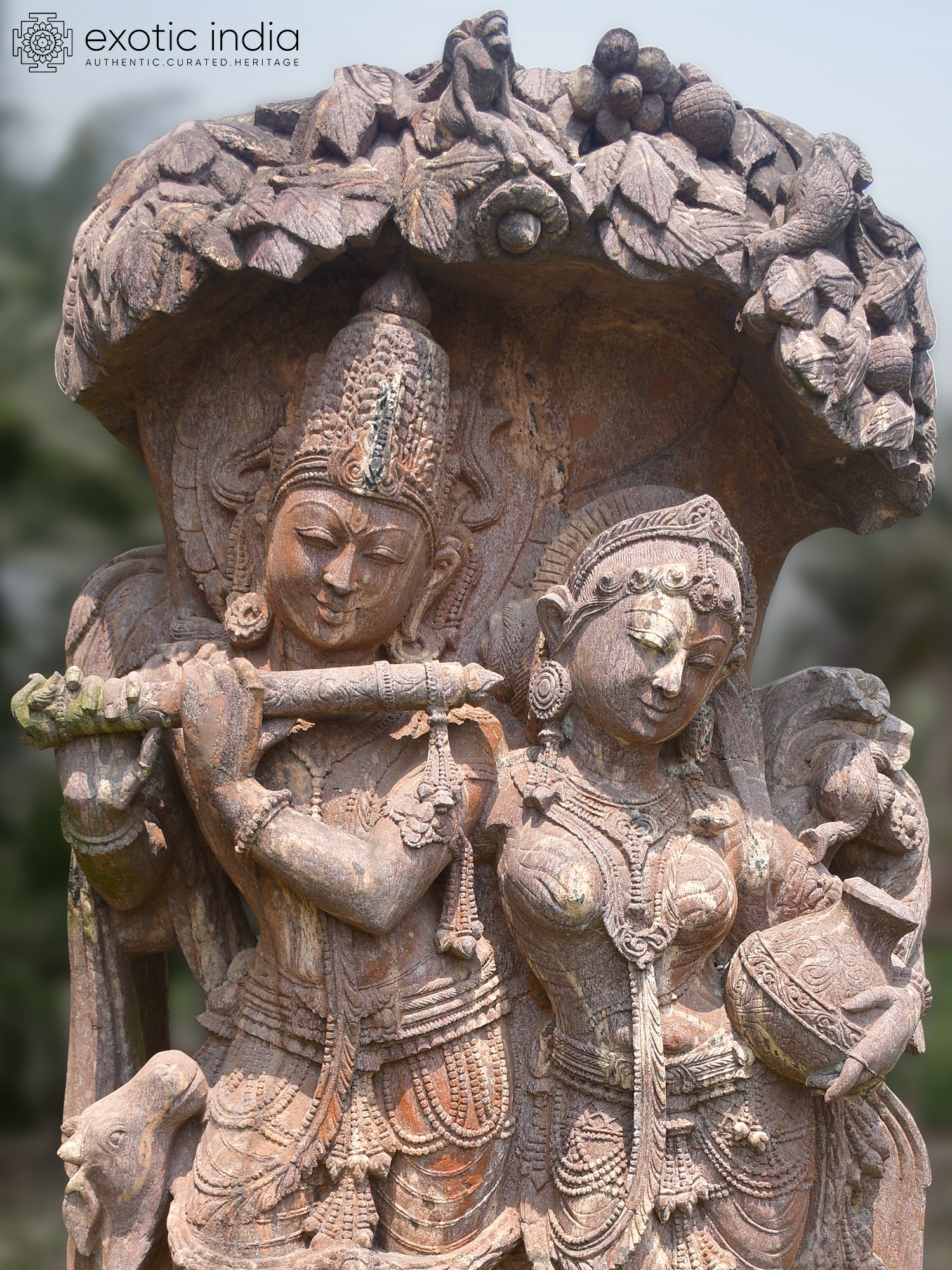 Standing at an impressive height, this work possesses a commanding yet graceful presence. The flowing garments, ornate jewelry, and serene expressions of the divine couple are rendered with exquisite detail. The subtle variations in the sandstone's natural hue add depth and character, making each curve and contour a delight to behold. The overall composition, from the embracing figures to the detailed canopy above, exudes an aura of timeless beauty and spiritual significance.