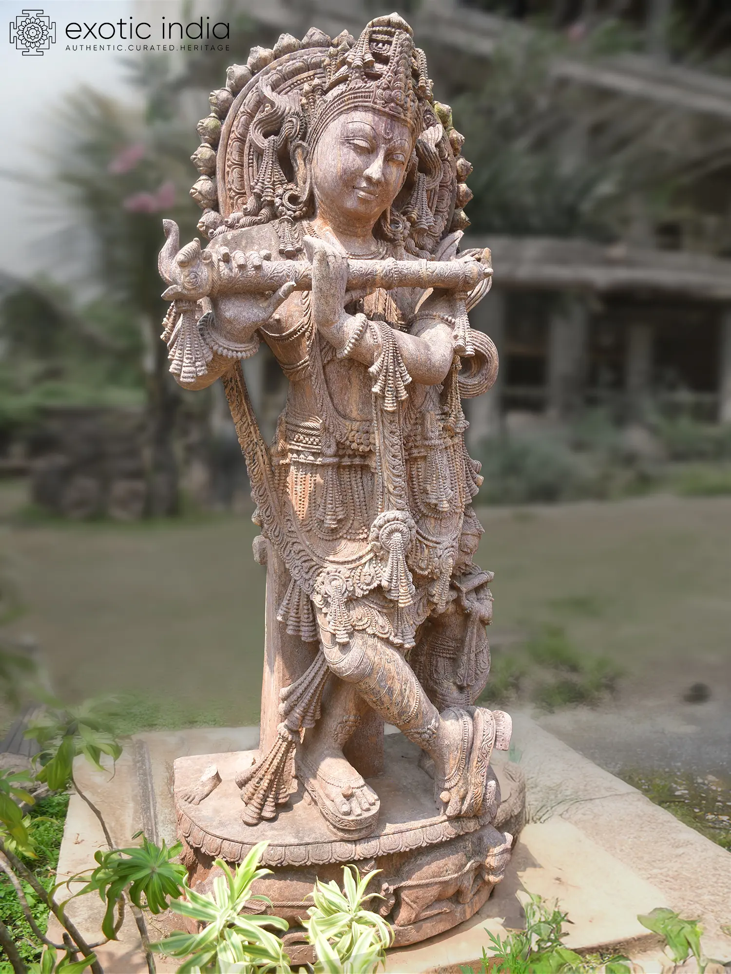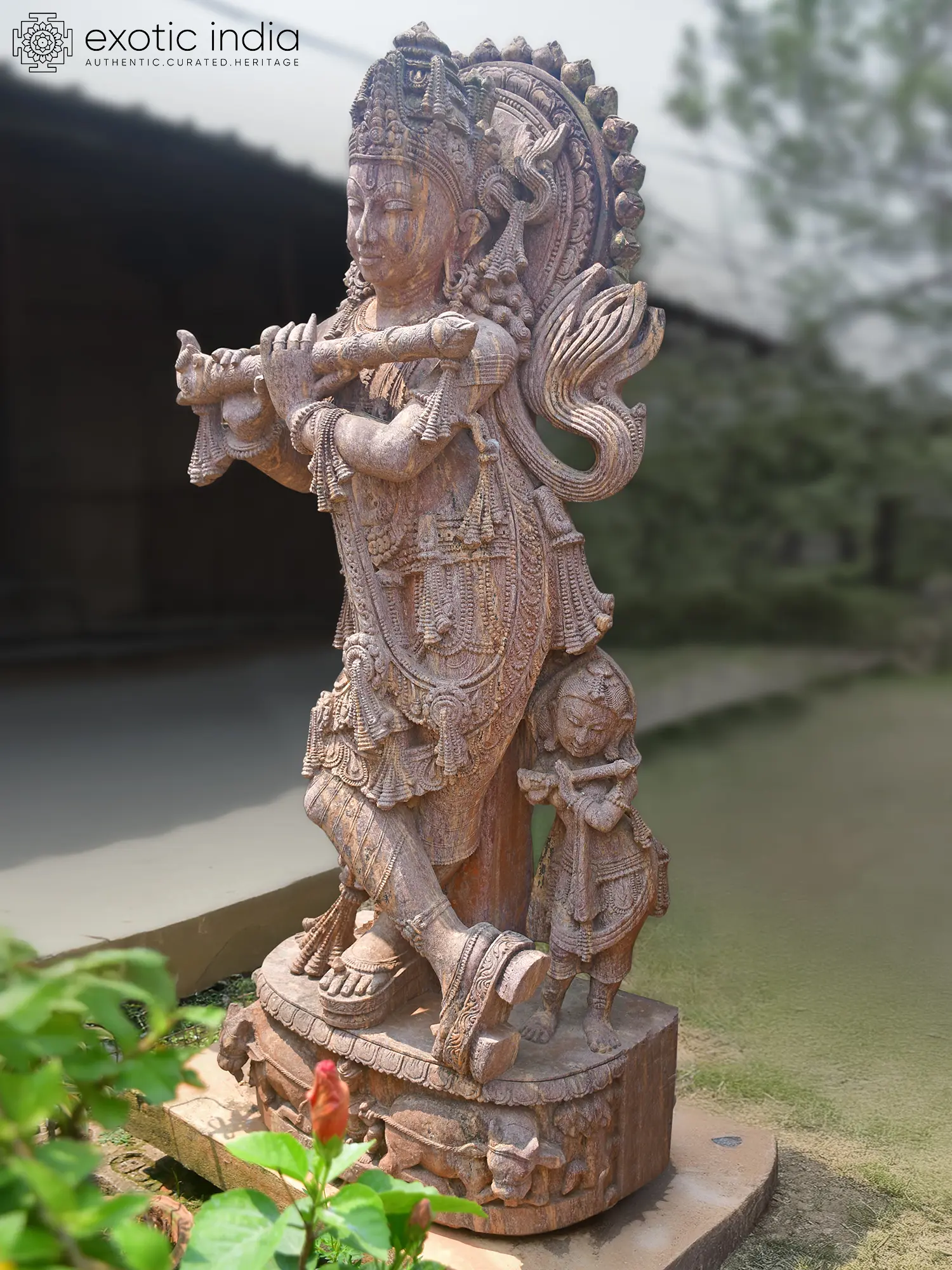62" Standing Lord Krishna with Cow under the Tree | Sandstone Statue | Exquisite Handmade Indian Art