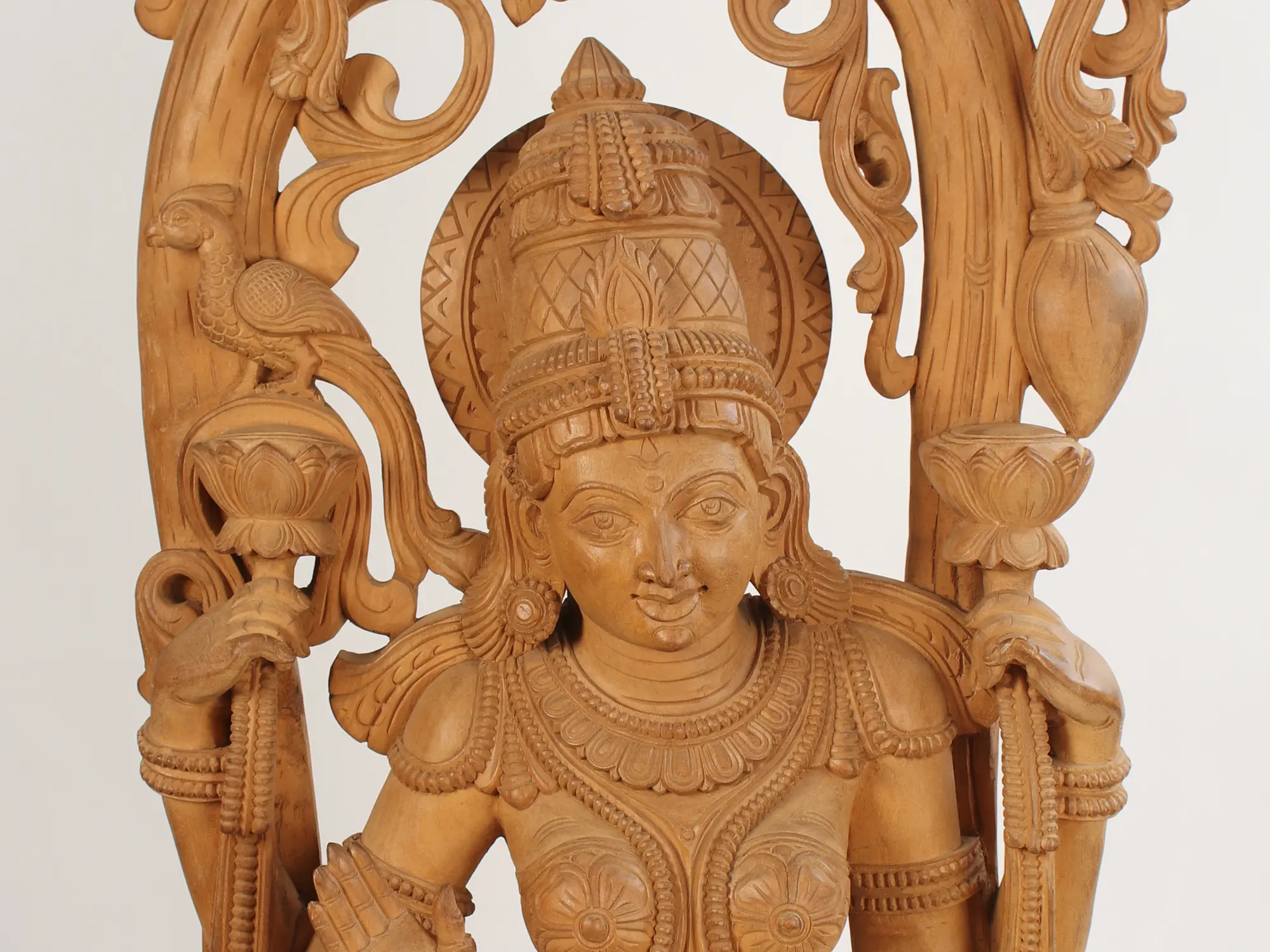 The divyaroopa of Lakshmi Devi, captured in organic wood medium. The Lakshmi statue that you see on this page depicts the wife of Vishnu in the cosmic (‘divya’) glamour of Her standalone iconography. Chaturbhujadharini or possessed of four arms. Lotuses in Her posterior hands and a muster of peacocks, both of which are symbolic of life and beauty and serenity.