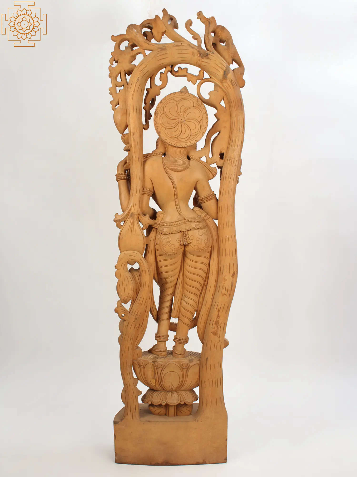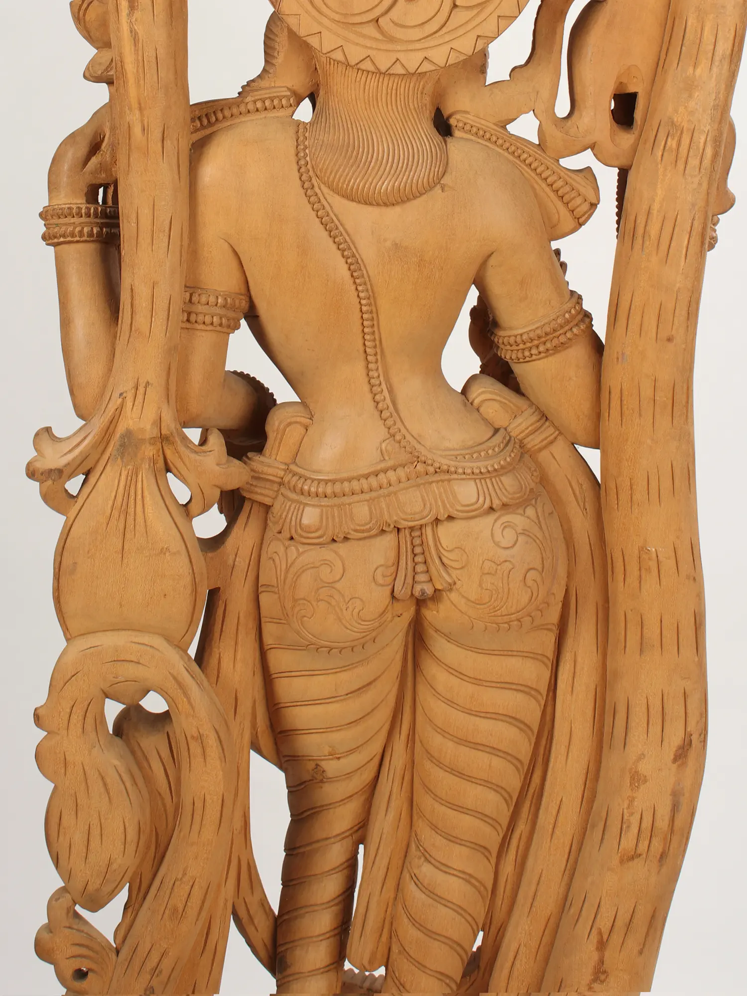 A lotus-shaped plinth cradles the feet of this Goddess Lakshmi sculpture. Each detail of Her attire and sumptuous adornment has been carved from wood with the greatest care and precision. Speaking of wood, the organic medium lends the Goddess Lakshmi statue an inimitable monotone.