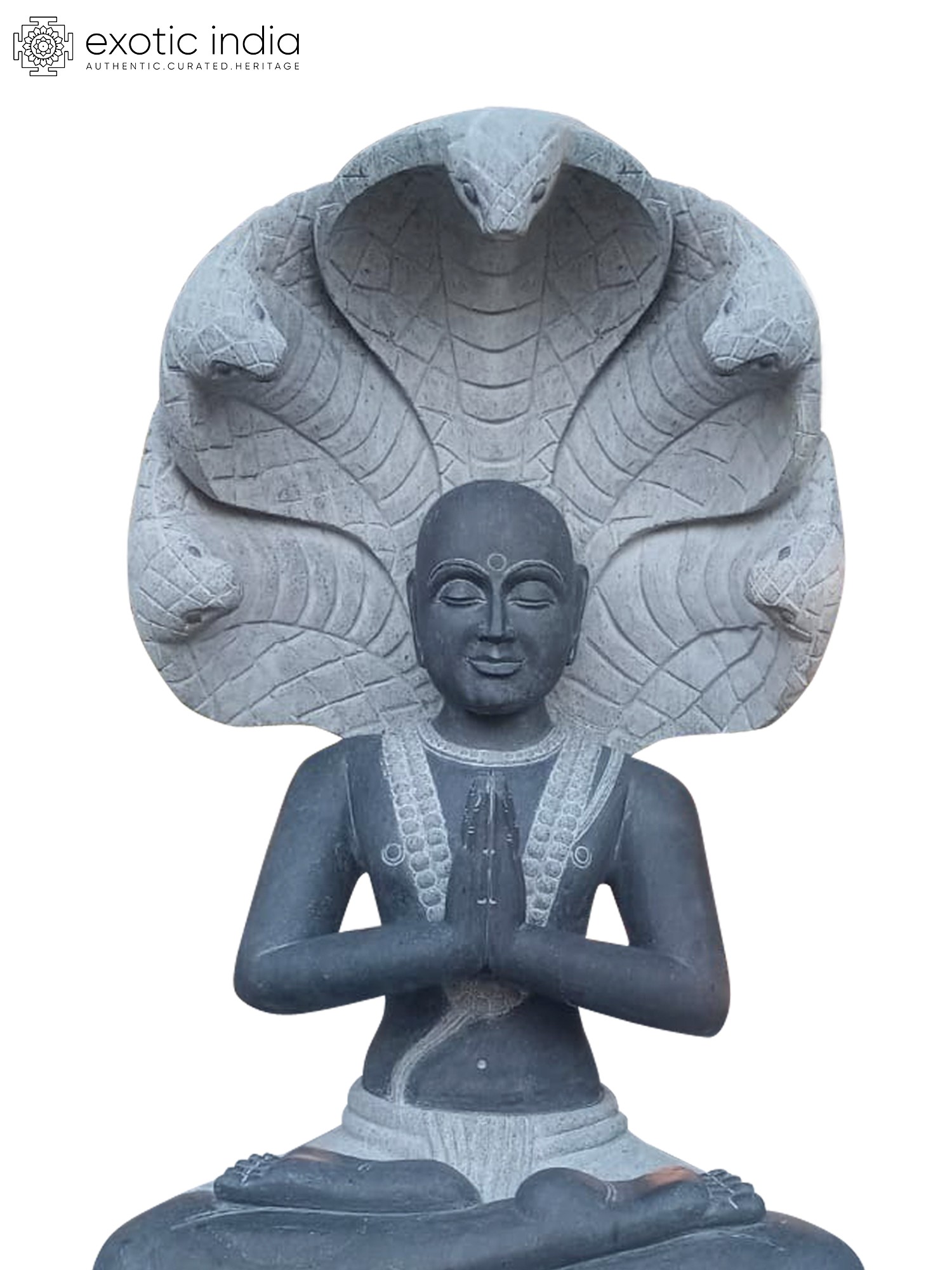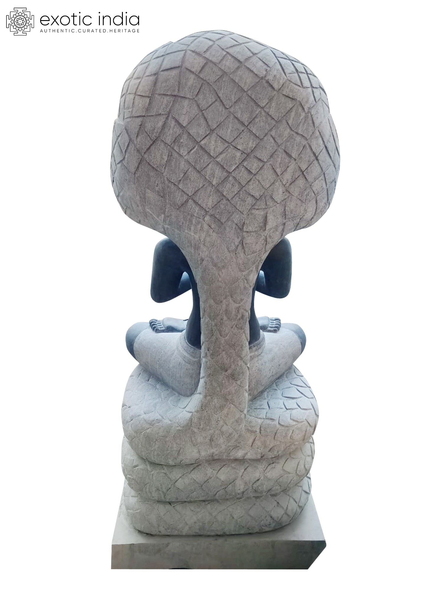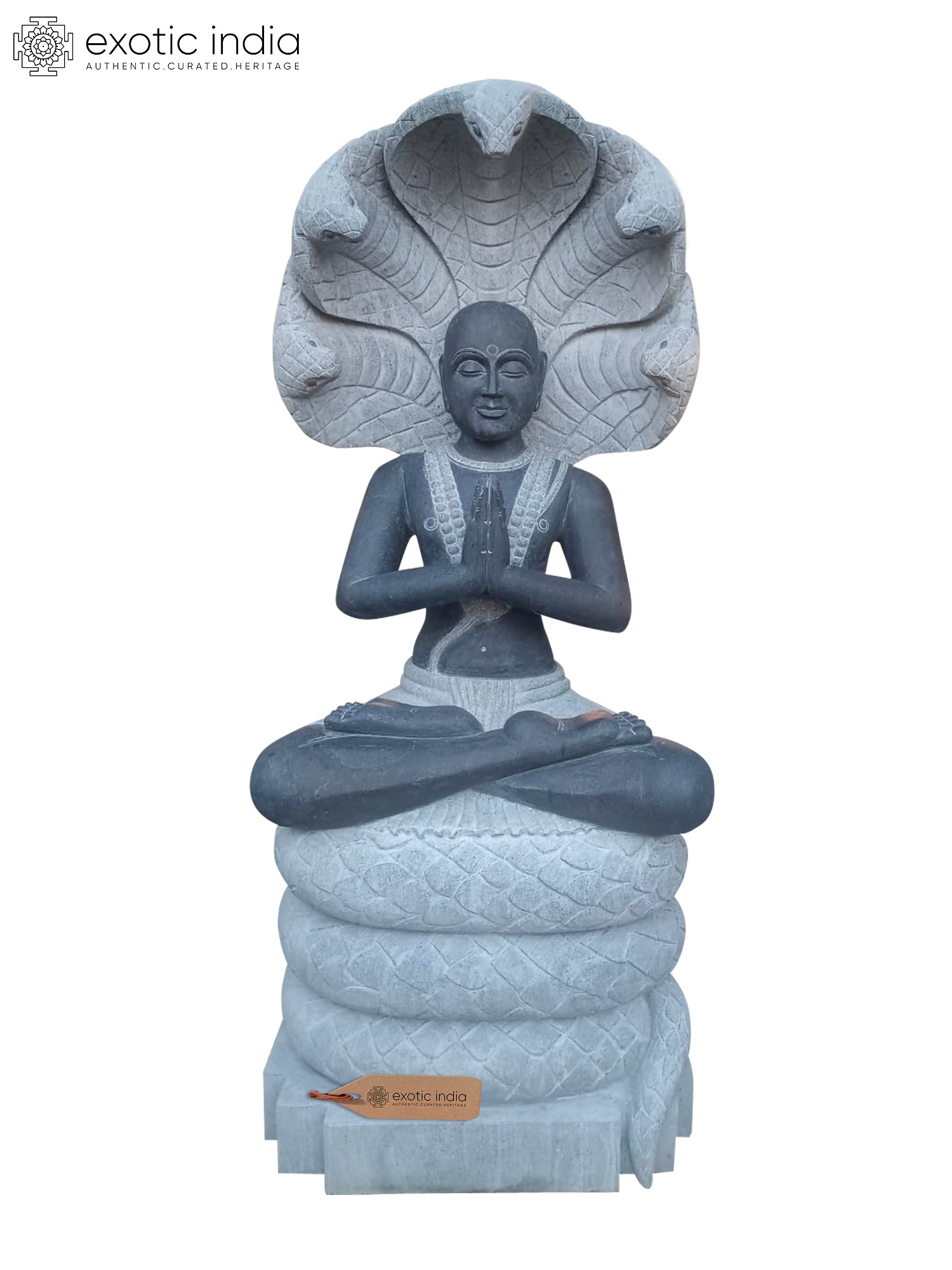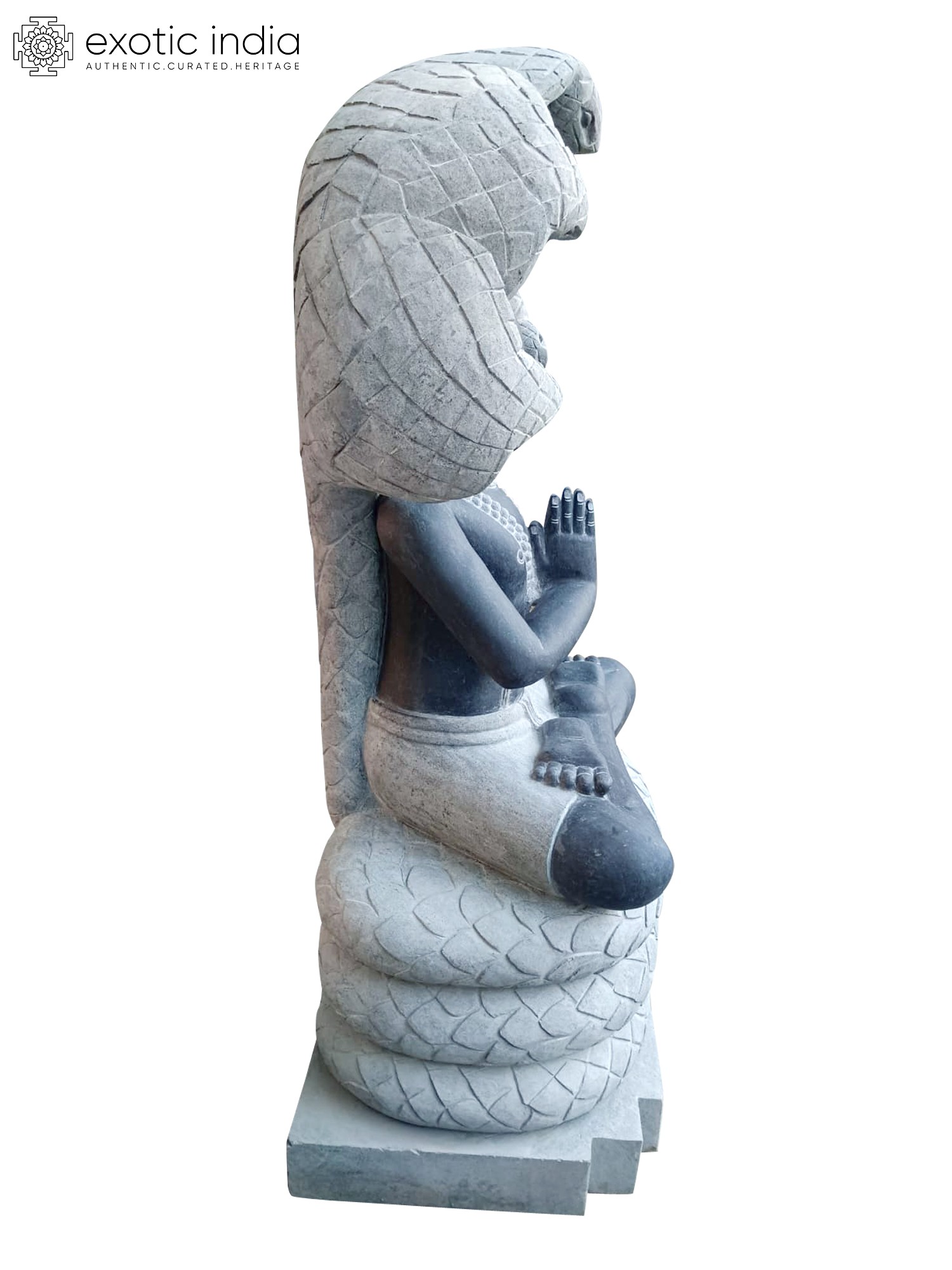 The sculpture of Patanjali in silent contemplation under the protection of the Naga serves as a powerful reminder of the importance of inner peace and spiritual growth. Its presence in a home or meditative space can inspire feelings of tranquility, focus, and a deeper connection to one's inner self. The deep black granite, polished to a lustrous sheen, creates a sense of timeless elegance, inviting contemplation and reflection. The grandeur of the piece and the spiritual weight it carries ensure it becomes more than just decoration but a statement piece reflecting your aspirations for inner peace.