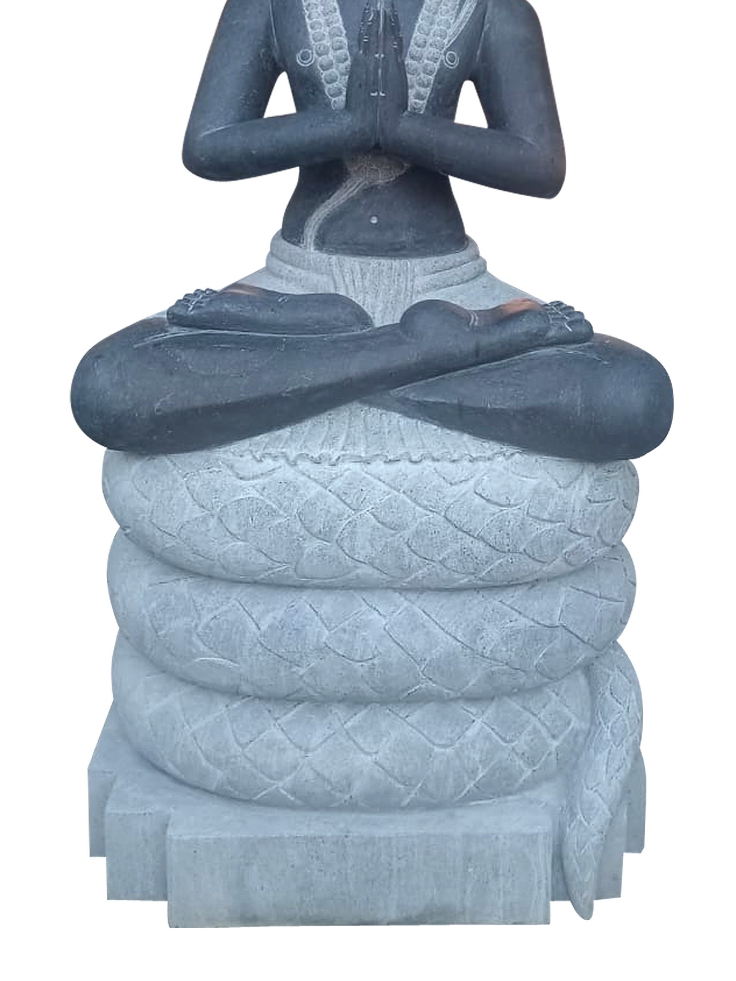 This sculpture is a stunning example of the exceptional craftsmanship found in Tamil Nadu, a region renowned for its rich artistic traditions. For centuries, Tamil Nadu’s artisans have been celebrated for their mastery of stone carving, transforming raw materials into breathtaking works of art that are both visually stunning and spiritually significant. The sculpture's elegant lines, precise detailing, and the harmonious balance between Patanjali's serene figure and the protective Naga embody this legacy. Its presence will enrich any setting, adding a touch of ancient wisdom and timeless beauty to your home or spiritual space.