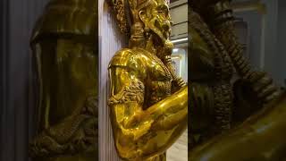 In his left hand, he holds his gada, or golden club, a symbol of self-sovereignty and authority of governance, with its spiral handle and bulbous top adorned with a lotus-flower base. On his head he wears his beautifully ornate crown, further solidifying his godliness and kingly status. Beside his head to his right, the end of his long, glorious tail emerges like a flag.