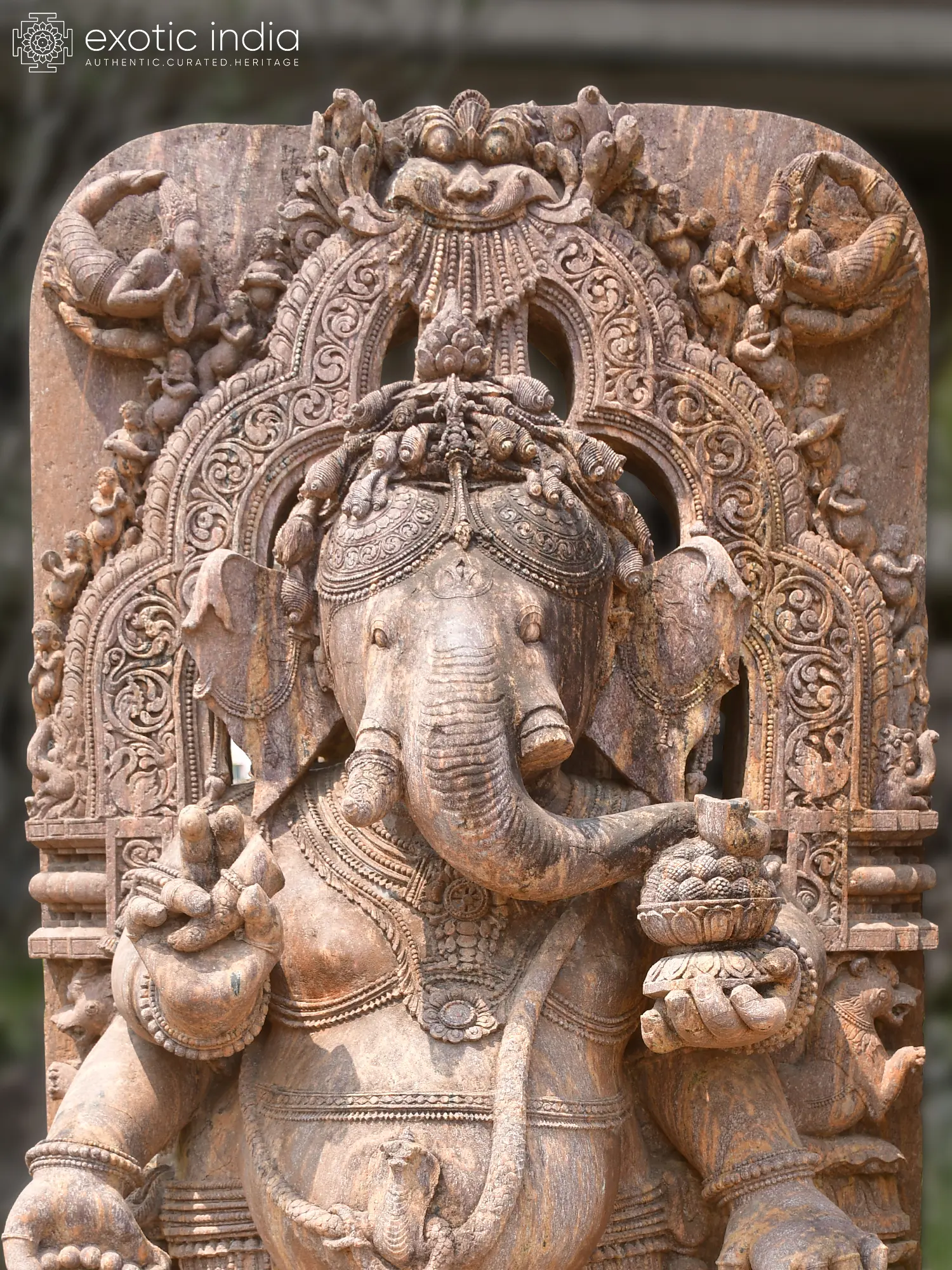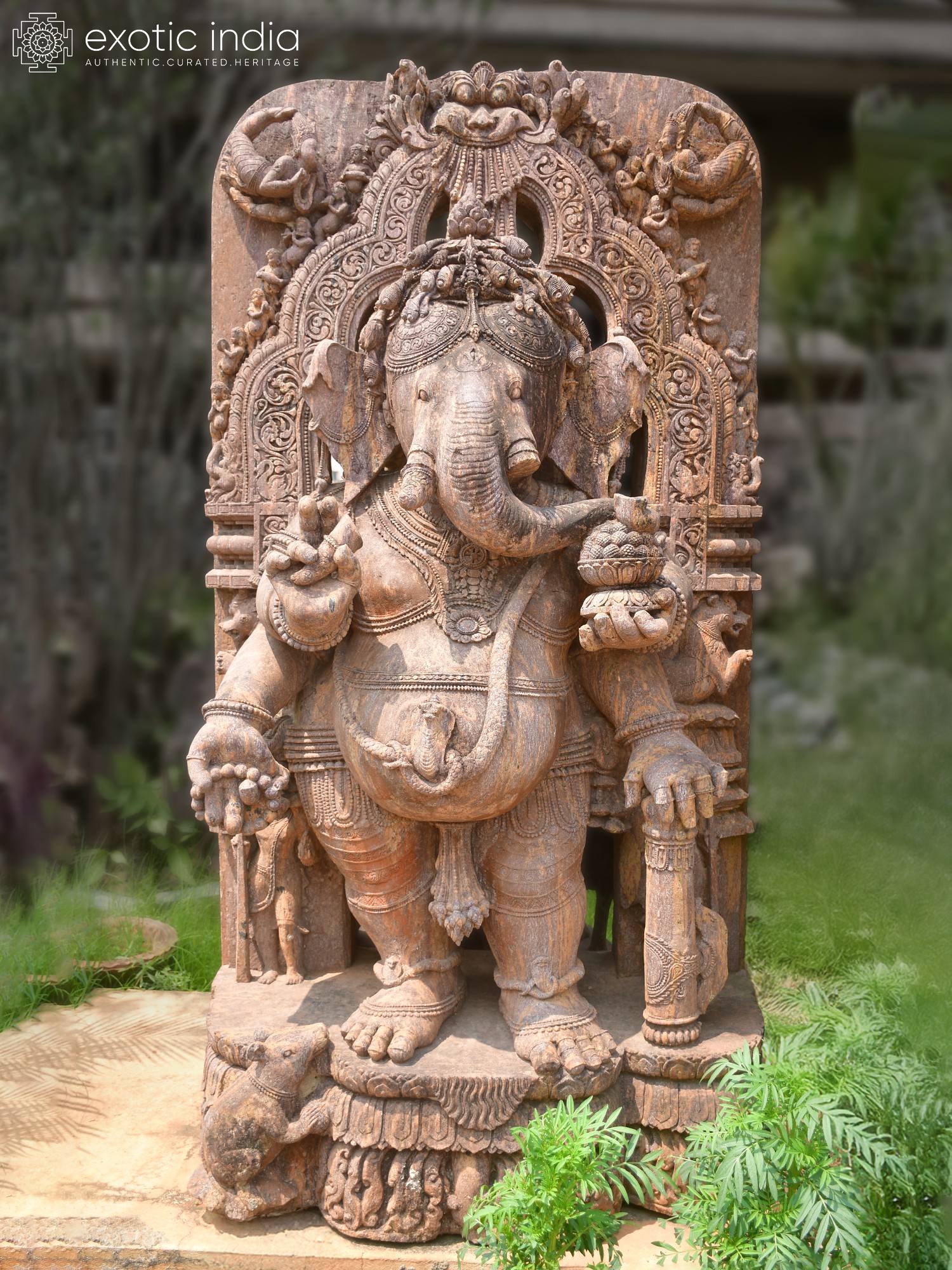 Crafted from robust Orissa Sandstone, this magnificent piece is the culmination of exceptional artisanal skill. Each curve, each nuance of expression, is meticulously carved by hand, imbuing the stone with a lifelike vitality. The natural variations in the sandstone ensure that your acquisition is utterly unique, a testament to the enduring beauty of natural materials and devoted craftsmanship.