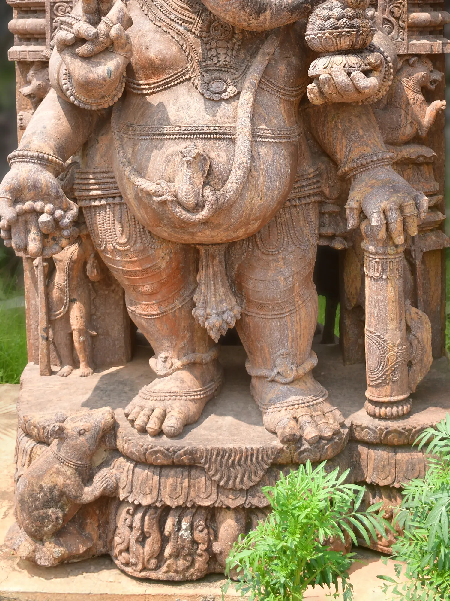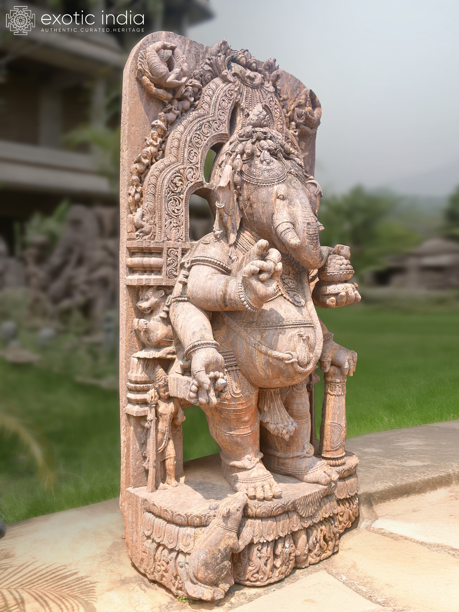 Dominating the landscape at a majestic height, this sculpture portrays the beloved deity with profound character. Observe the masterful rendering of his gentle countenance, the characteristic trunk, and the adorned headdress, all brought to life with an artist's keen eye. The supporting elements and the ever-present mouse at his feet contribute to a narrative richness that captivates the viewer, showcasing a truly commanding artistic achievement.