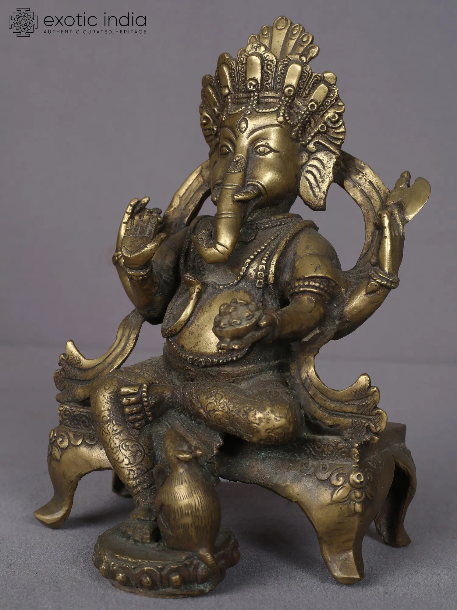 This Nepalese statue of Sri Ganesha, crowned and festooned with regalia, is reminiscent of his Indian images as a universal ruler, known as "Raja Ganapati" (ruler Ganesha). Crafted from brass, the statue exudes an antique charm that appeals to the senses. The sophisticated regional aesthetics also contribute to the composition's heavenly atmosphere.