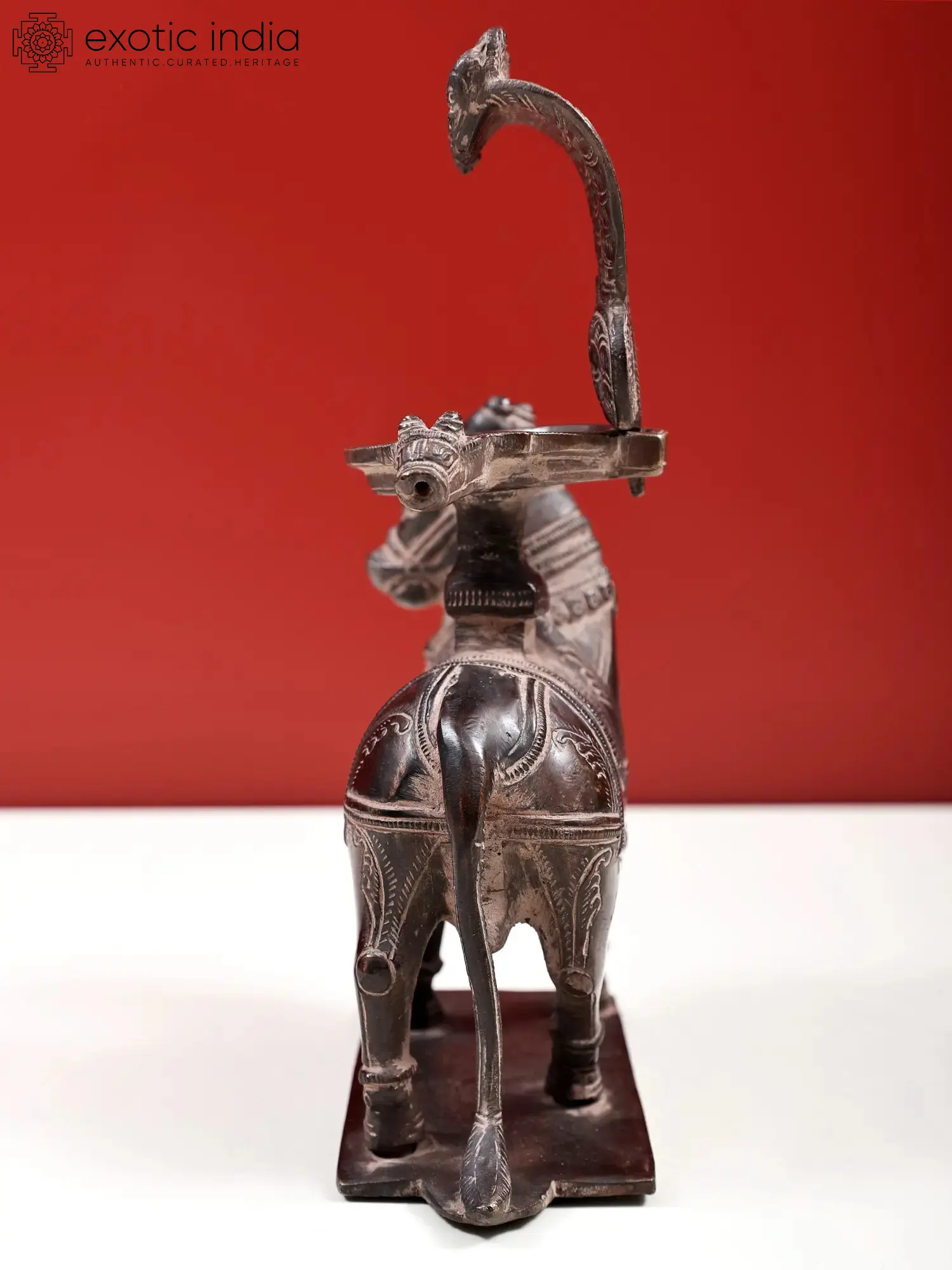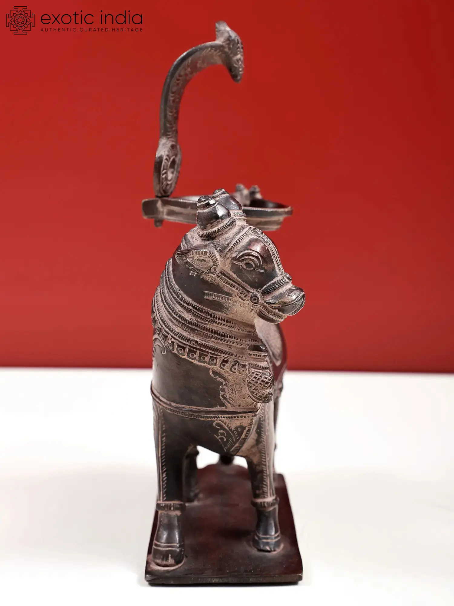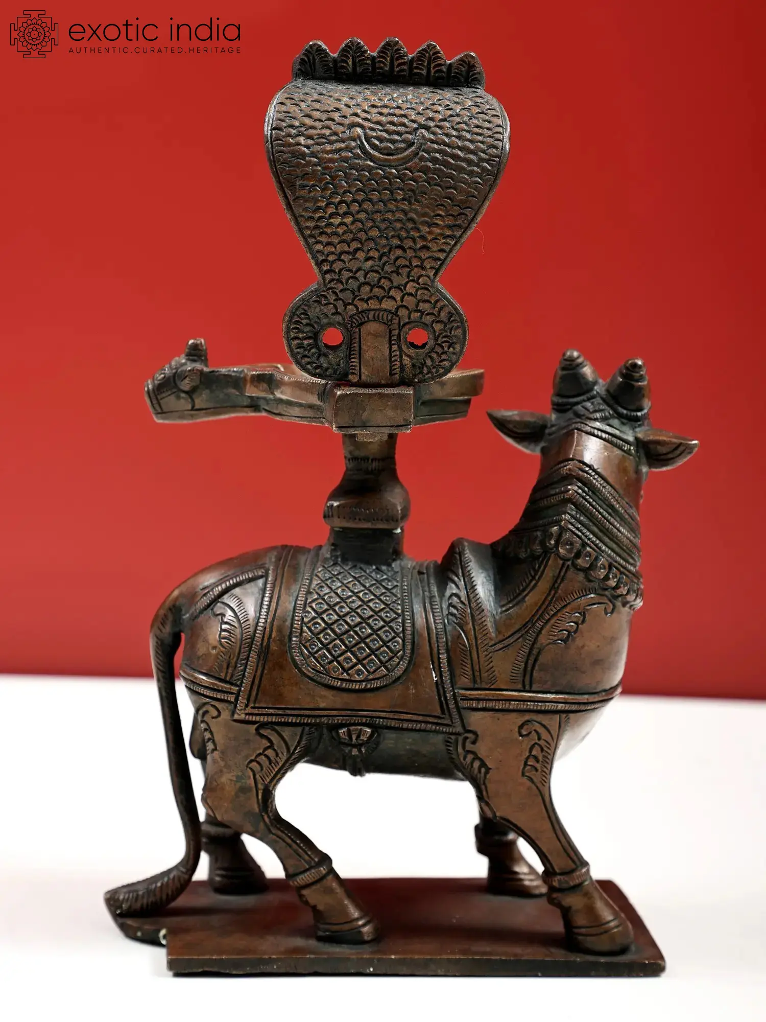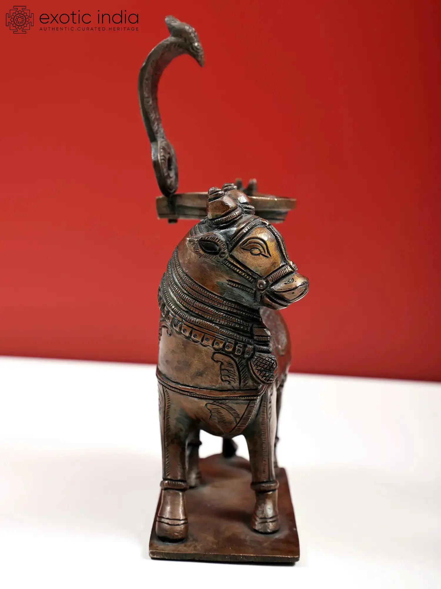 This exquisite brass sculpture captures a profound moment of divine grace and celestial protection. At its heart stands Nandi, the devoted bull, the celestial vahana (vehicle) of Lord Shiva. Rendered in rich, aged brass, Nandi embodies strength, purity, and unwavering loyalty. His sturdy form, adorned with intricate detailing on his caparison and ornaments, speaks of his dignified presence as Shiva's eternal companion. The sculptor's mastery is evident in the lifelike depiction of Nandi's placid yet powerful expression, his alert ears, and the subtle musculature of his powerful legs.