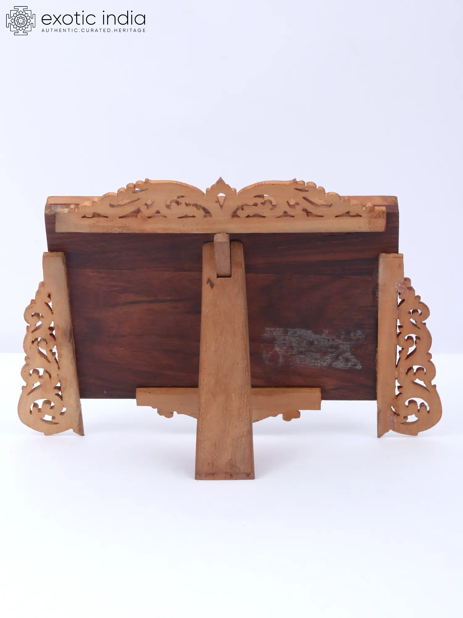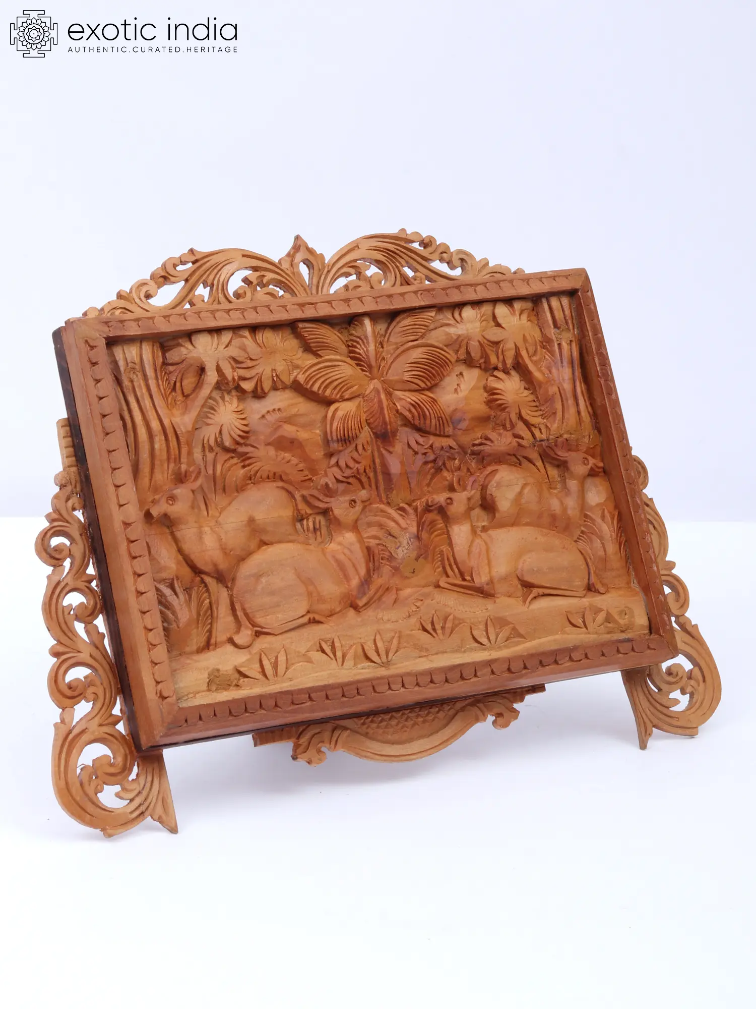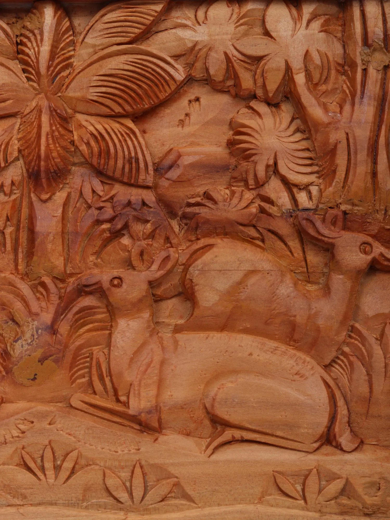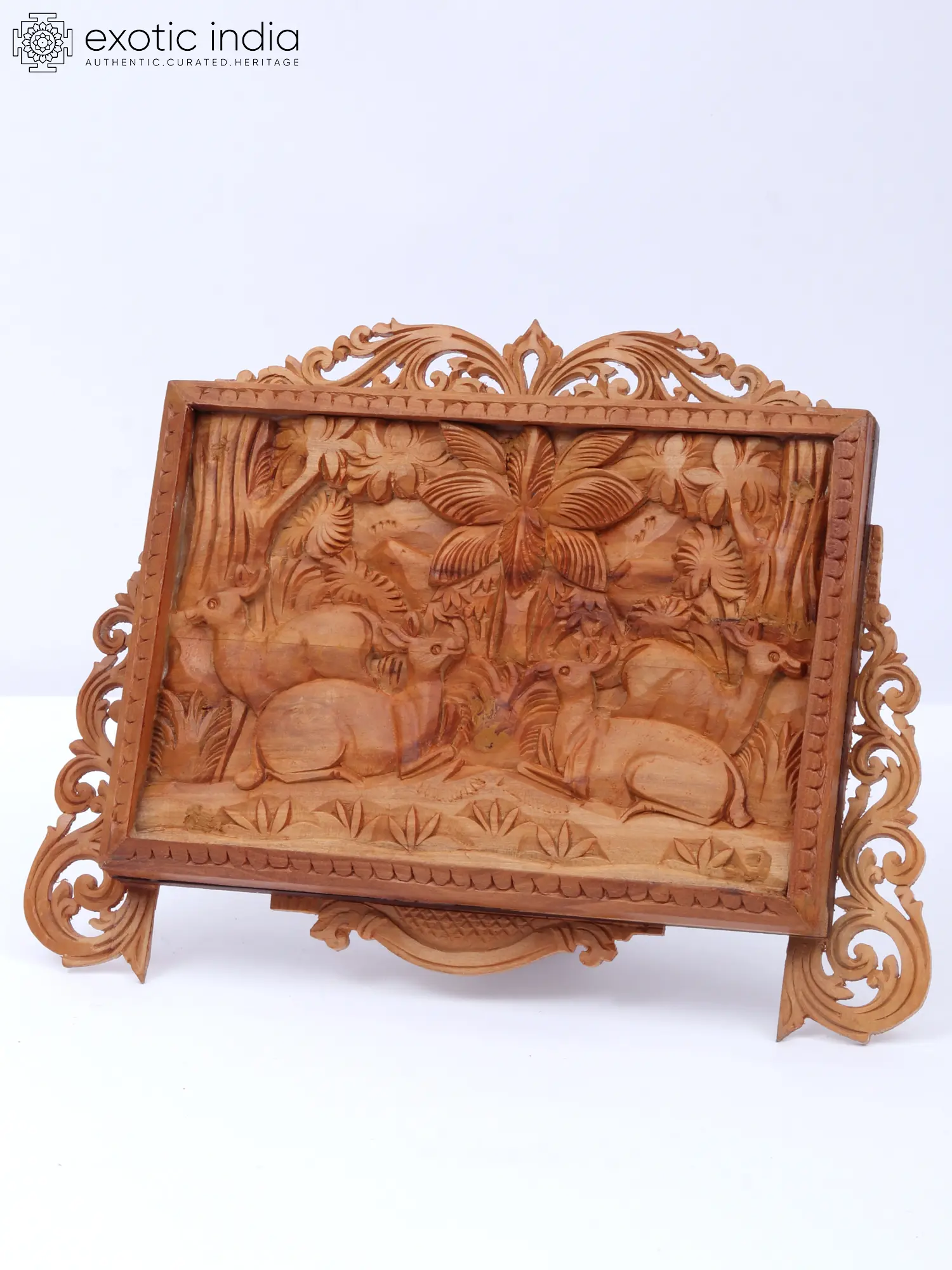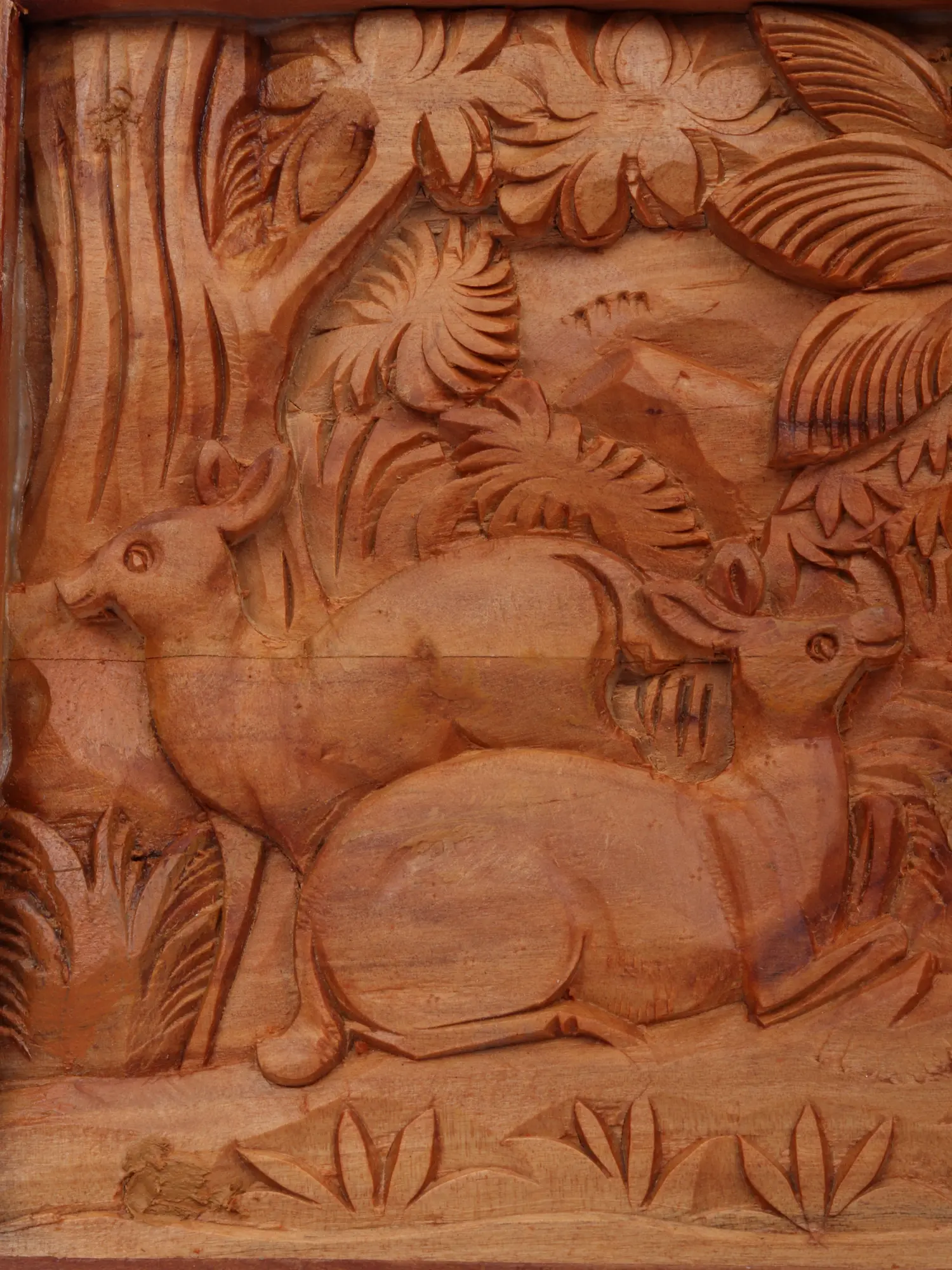 Beyond the enchanting image of the deers in their jungle habitat, the frame itself is a testament to artistic skill. The ornate, hand-carved frame enhances the piece's overall aesthetic, adding an element of sophistication and elegance. The intricate detail of the foliage, the graceful lines of the frame, and the smooth finish of the sandalwood create a harmonious and visually stunning artwork. It stands beautifully on its own and brings an elegant touch to any surface. The frame's design further emphasizes the tranquil scene within. This piece is a delightful combination of refined aesthetic and thoughtful symbolism.