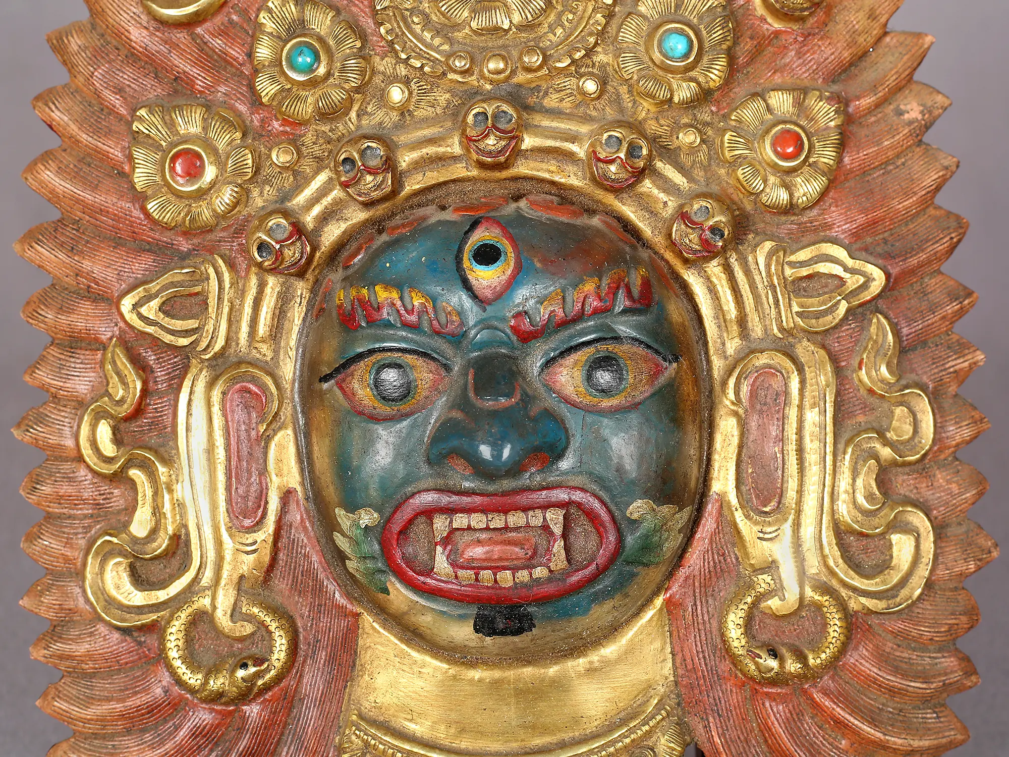 Handcrafted by skilled artisans in Nepal, this mask is a masterpiece of traditional art. The intricate detailing, from the individually carved fangs to the meticulously rendered hair and headdress, showcases a deep understanding of the iconography of Bhairava. The use of high-quality copper as the base material provides a rich, enduring foundation, while accents of vibrant crystals add a touch of divine sparkle, enhancing the mask's mystical aura. This piece is designed not only to be admired for its aesthetic beauty but also to resonate with the spiritual energy it represents. Its substantial build and intricate design make it a remarkable statement piece, perfect for enhancing the spiritual ambiance of your home, meditation room, or any sacred space. As a wall hanging, it offers a constant reminder of the protective forces that surround us and the inner strength that lies within.