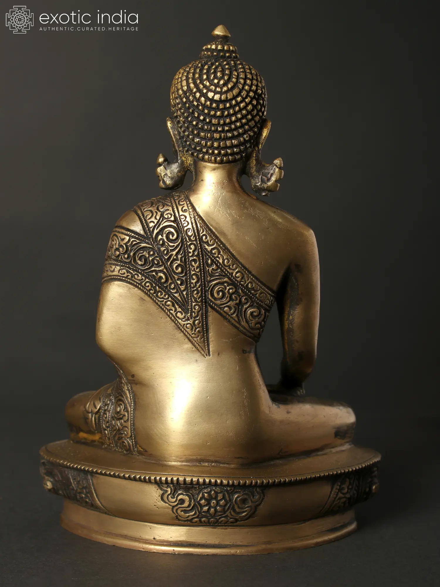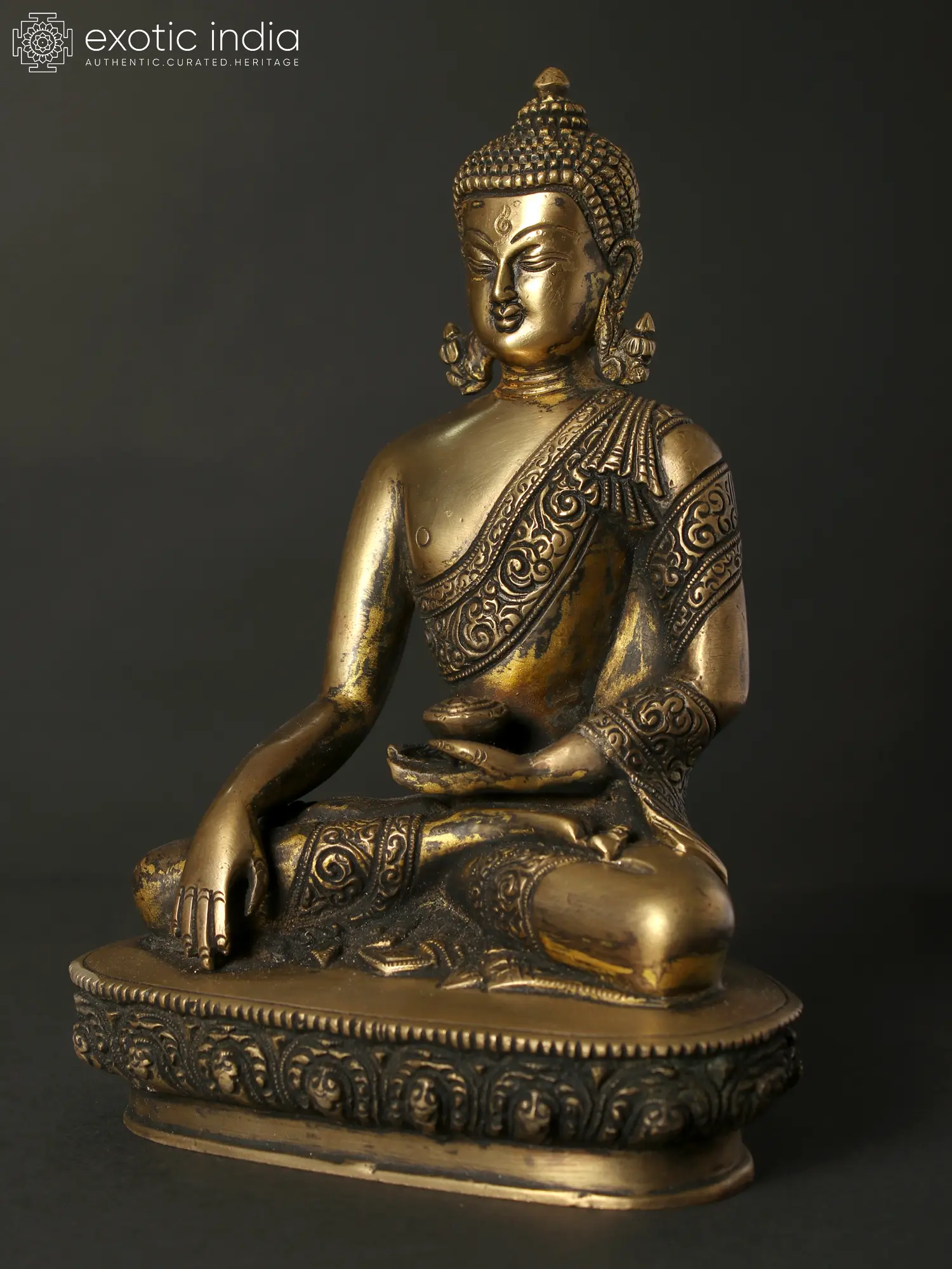 In this brass creation, Bhumisparsha Buddha sits in profound stillness, his divine form draped in serenity. With grace, Lord Buddha (The Awakened One) assumes the Bhumi Bhumisparsha Mudra, his right hand tenderly caressing the Earth, a silent dialogue between mortal existence and cosmic wisdom. The alms bowl in his left hand symbolises simplicity and detachment from worldly desires. Through this celestial posture, Buddha awakens the Earth itself, transcending ephemeral concerns and grounding the essence of enlightenment. In the sacred touch of his hand upon the soil, a testament to the momentous declaration of victory over ignorance—a timeless connection between the enlightened soul and the very fabric of existence.