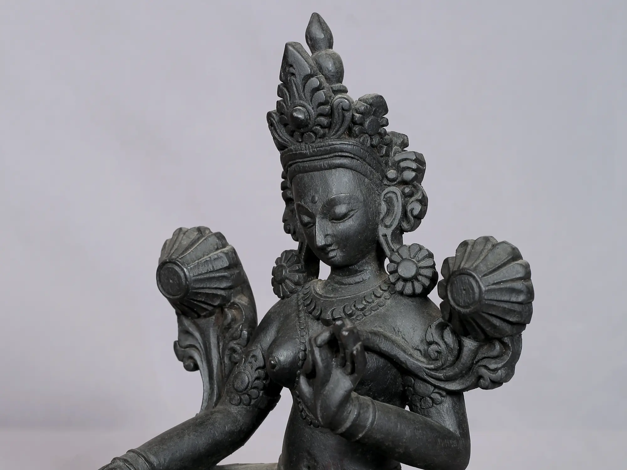 Crafted with meticulous care by skilled artisans in Nepal, this statue embodies the rich spiritual heritage of the region. The dark, grounding color of the wood reflects the earth from which it comes, infused with the profound wisdom and artistry of Himalayan traditions. Green Tara is widely venerated across Tibetan Buddhism, Nepalese Buddhism, and in other Mahayana traditions. Legend tells of Tara emerging from a tear shed by Avalokiteshvara, moved by the suffering of the world. Her swift response to prayers earned her the name "Swift Goddess." She is particularly invoked to overcome the eight great fears, represented by the eight fearsome beasts: lions (pride), elephants (ignorance), serpents (anger), demons (false views), robbers (attachment), fire (delusion), water (greed), and chains (ignorance).