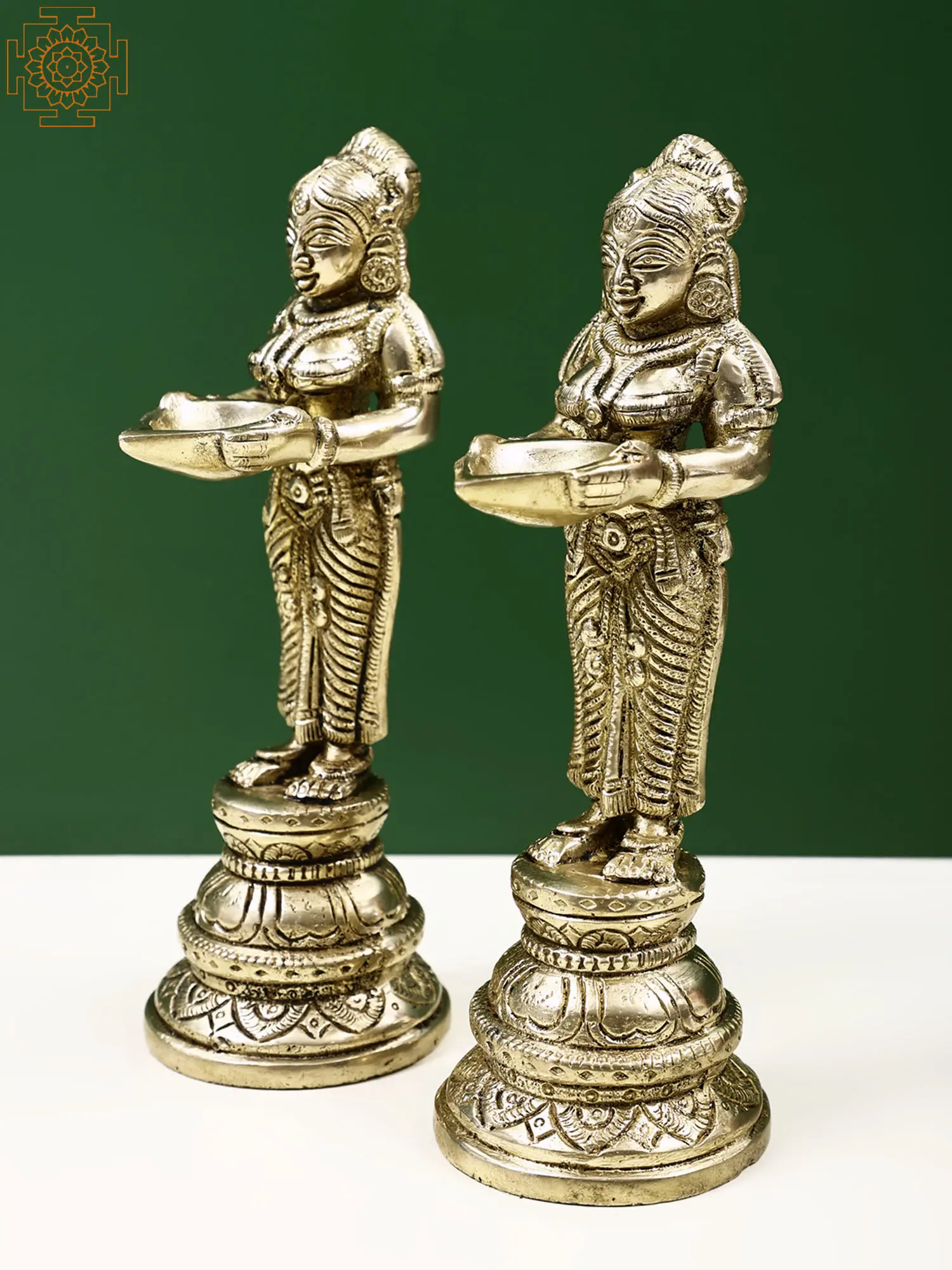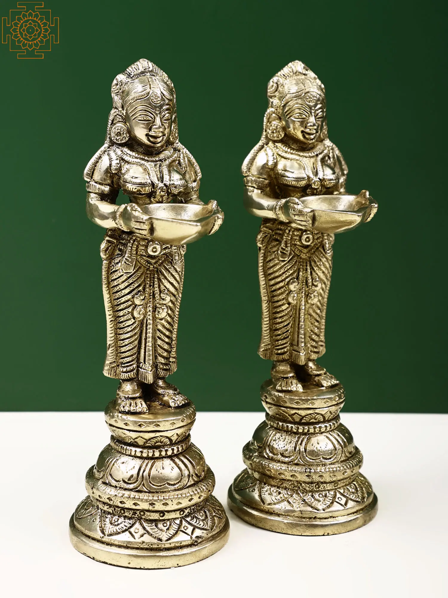 Bring the divine essence of prosperity and illumination into your home with this exquisite pair of brass deepa figures. Each piece stands as a testament to intricate craftsmanship, depicting a divine feminine form holding a bowl, ready to be lit with a lamp. The rich, warm luster of brass has been a favored material for sacred art for millennia, believed to possess purifying properties and to channel auspicious energies. These figures are not merely decorative items; they are vessels of divine grace, embodying the spirit of abundance and well-being. The graceful posture and serene expressions of these figures evoke the presence of Lakshmi, the revered Hindu goddess of wealth, fortune, love, and beauty. In Hindu mythology, Lakshmi emerged from the churning of the cosmic ocean (Samudra Manthan) holding a lotus and showering gold coins. Her association with light is profound, as the glow of a lamp symbolizes the dispelling of darkness, ignorance, and misfortune, ushering in clarity, knowledge, and prosperity. Placing these deepa figures in your living space, puja room, or altar is an invitation for these blessings to manifest in your life.