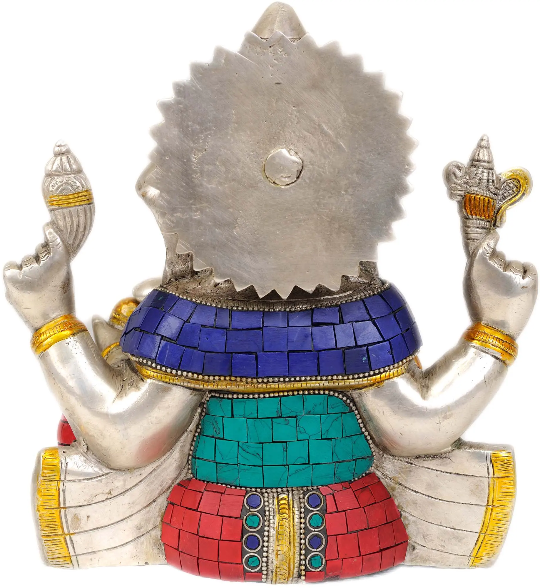 In his childlike form, Ganesha sits gracefully in “Utkutakasana”, a beacon of wisdom and innocence harmoniously entwined. At the center of his exalted forehead, a Trident (Trishul) mark bestows a divine benediction, radiating grace. With an “Ashirwad Mudra”, his right hand beckons blessings to those who seek his shelter. Adorned in regal jewels and crowned majestically, Ganesha reigns as the sovereign of hearts. Ganesha’s upper hands clutch a “Goad” and a “Noose”, instruments of wisdom and restraint, while He savours a sweet Modak, a symbol of life’s sweetness. Serpent “Vasuki” gracefully coils around his ample belly, a testament to his mastery over all realms. This masterpiece, crafted in brass and embellished with exquisite inlay work, resonates with the omnipresent aura of the beloved elephant-headed deity.