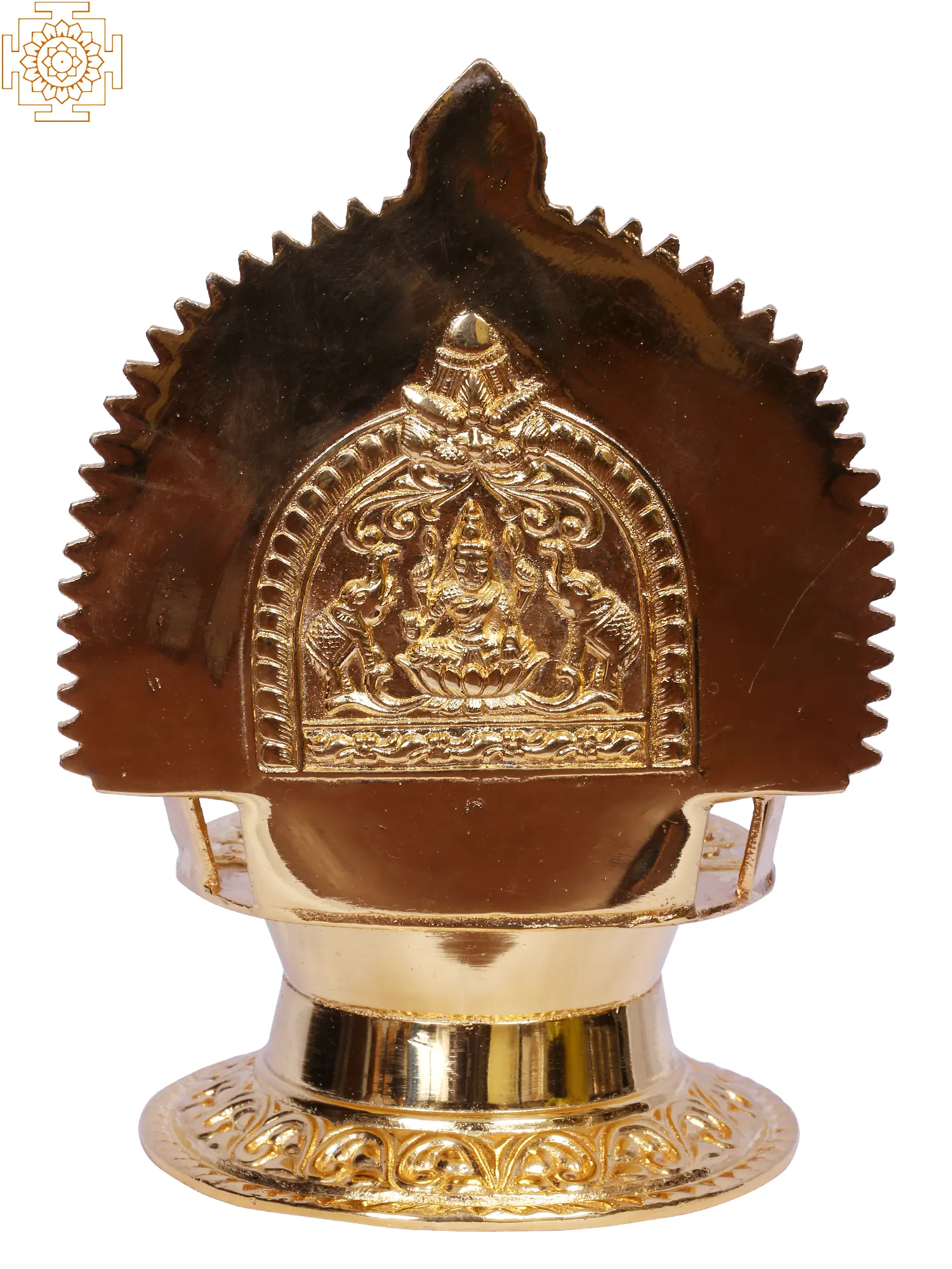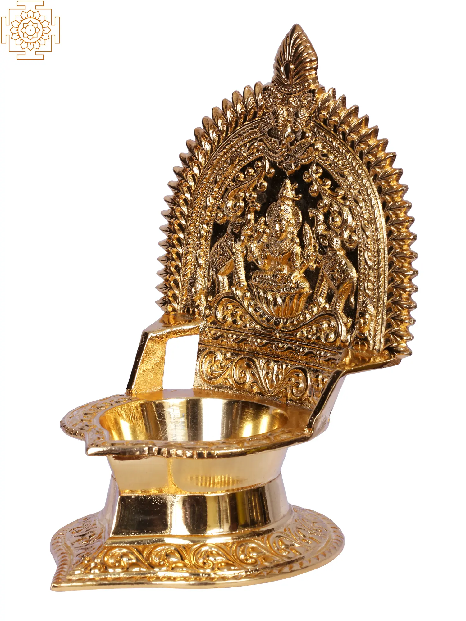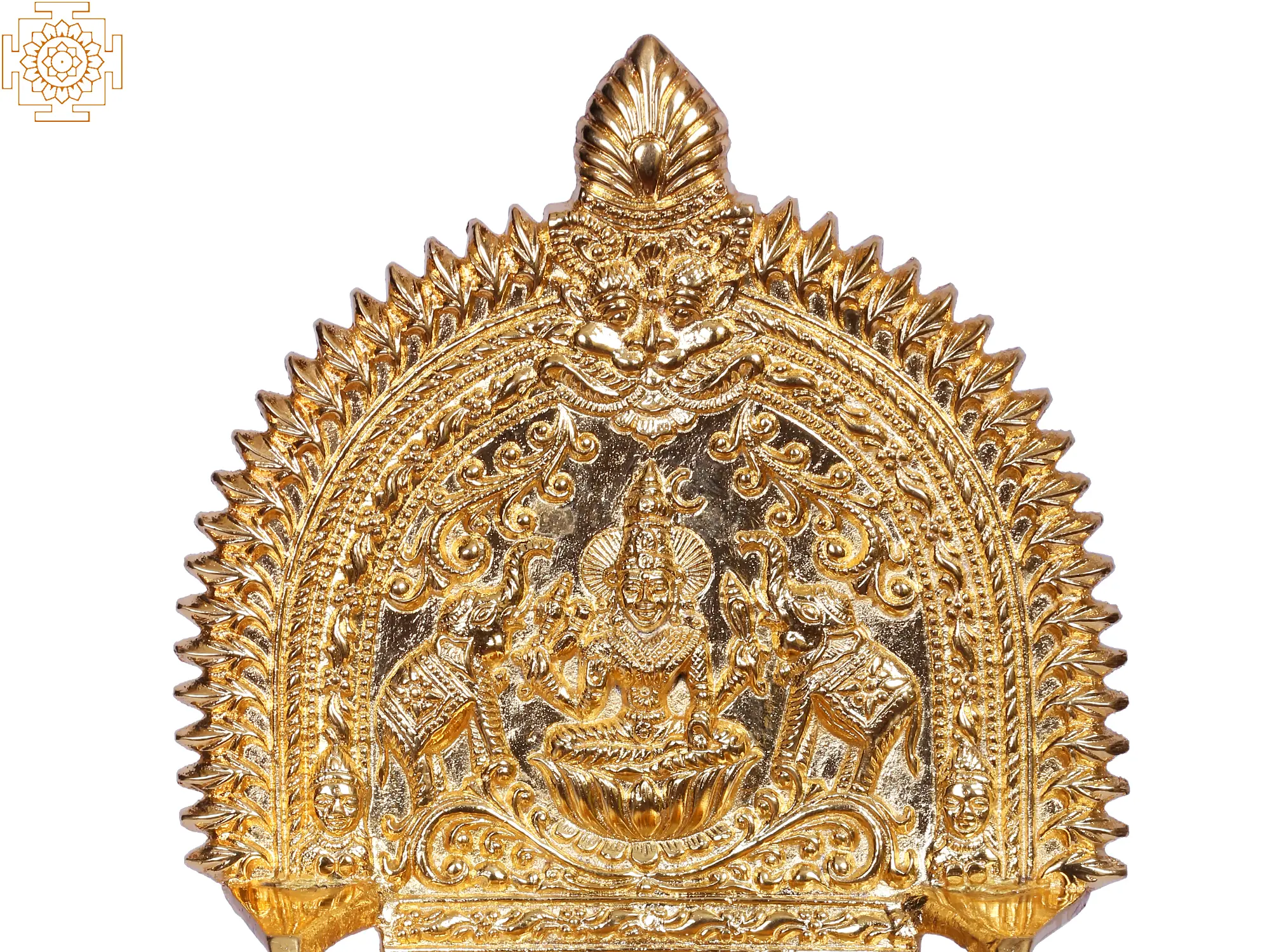 This brass lamp with a Goddess Gajalaxmi image ringed by a Kirtimukha throne and two elephants is the most sacred ceremonial object to be put in a worship venue. Goddess Gajalakshmi is the riches and prosperity patron. She is worshipped by two elephants on either side, which represents her role as a provider of richness, as elephants are a symbol of grandeur. The lamp is designed in the classic style, with a deep oil bowl and a crown depicting the Goddess. This amazing lamp, which has all auspicious motifs, may offer the divine warmth required to connect the deity to a sacred spot.