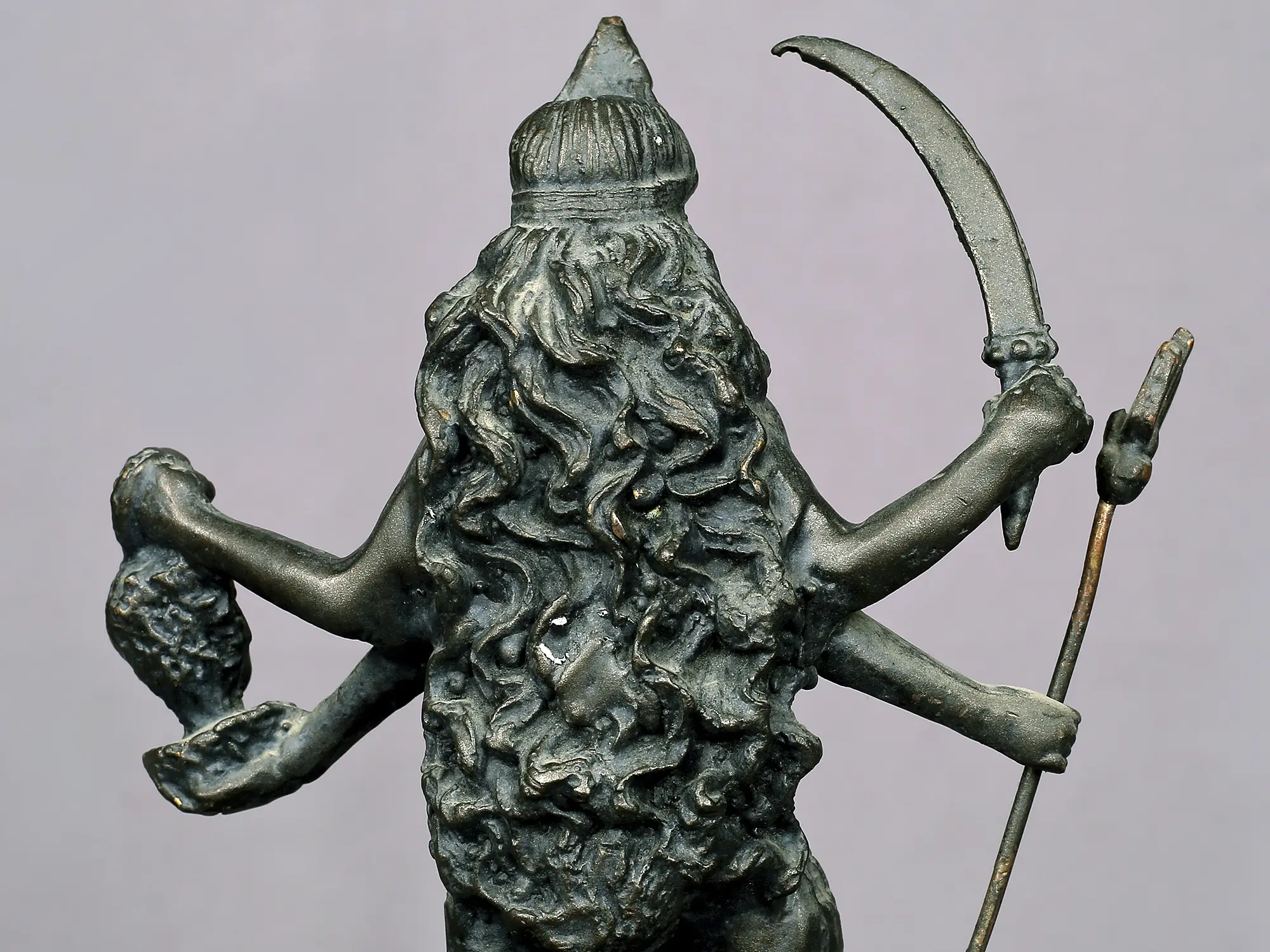 Goddess Kali possesses four hands, each laden with symbolic significance. Her upper left hand wields a scimitar, symbolizing power, while her lower left-hand clasps a severed head, representing the conquest of ego. In her upper right hand, she displays the Avaya Mudra, a gesture of fearlessness, and in her lower right hand, she holds a Trishul. These four hands together illustrate the cyclical nature of creation and destruction, encompassing the entirety of time and the continuous cycle of birth, death, and rebirth. Beneath her, Lord Shiva, often associated with the deity of death, lies prostrate, with closed eyes signifying the primordial state before life's emergence. Kali's dance upon Shiva's chest signifies her desire for him to witness and participate in the act of creation, ushering life into existence.