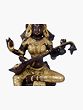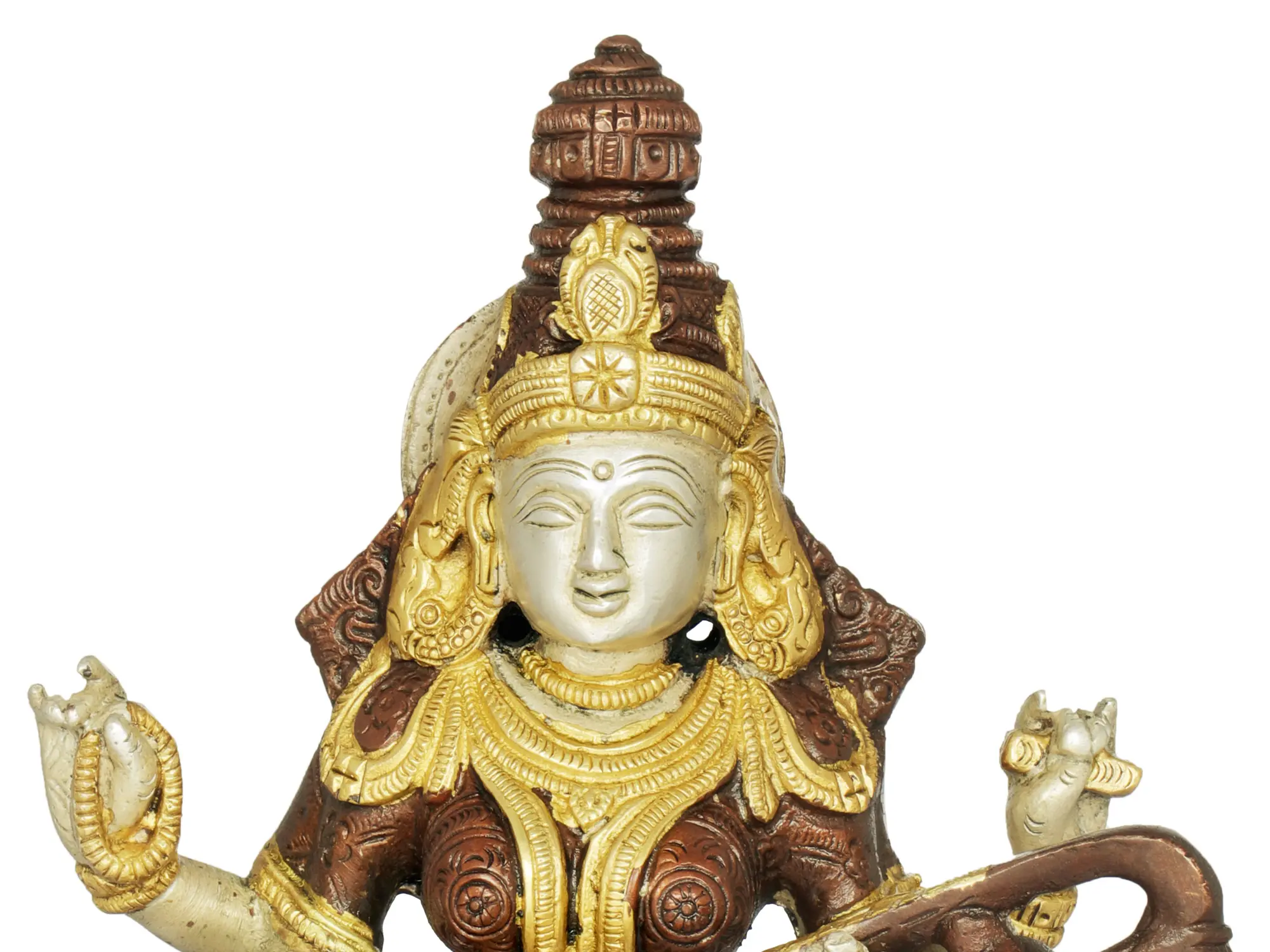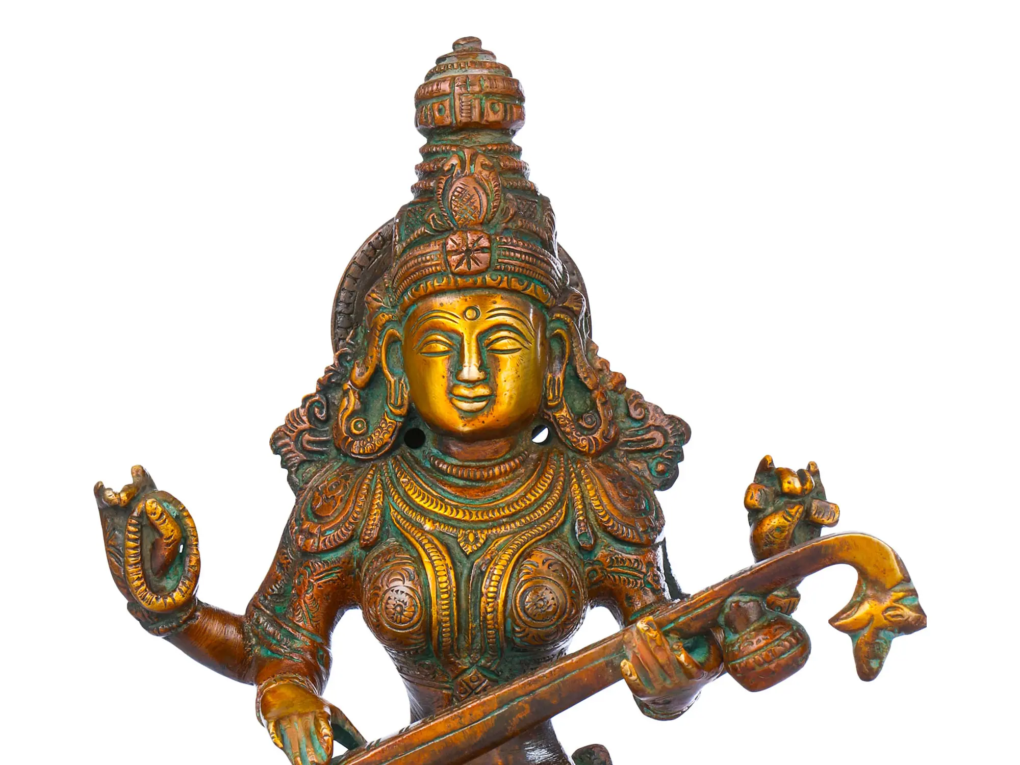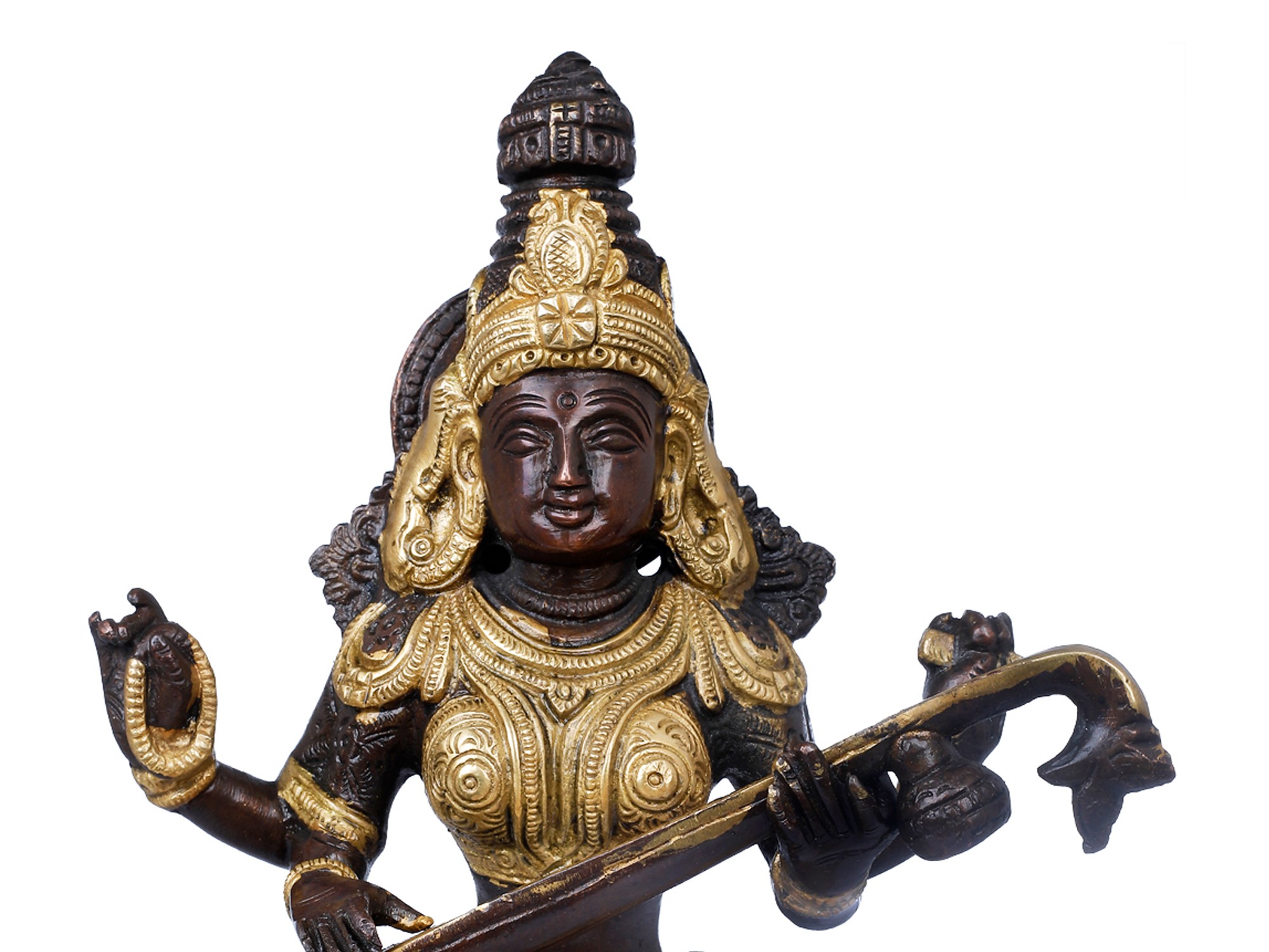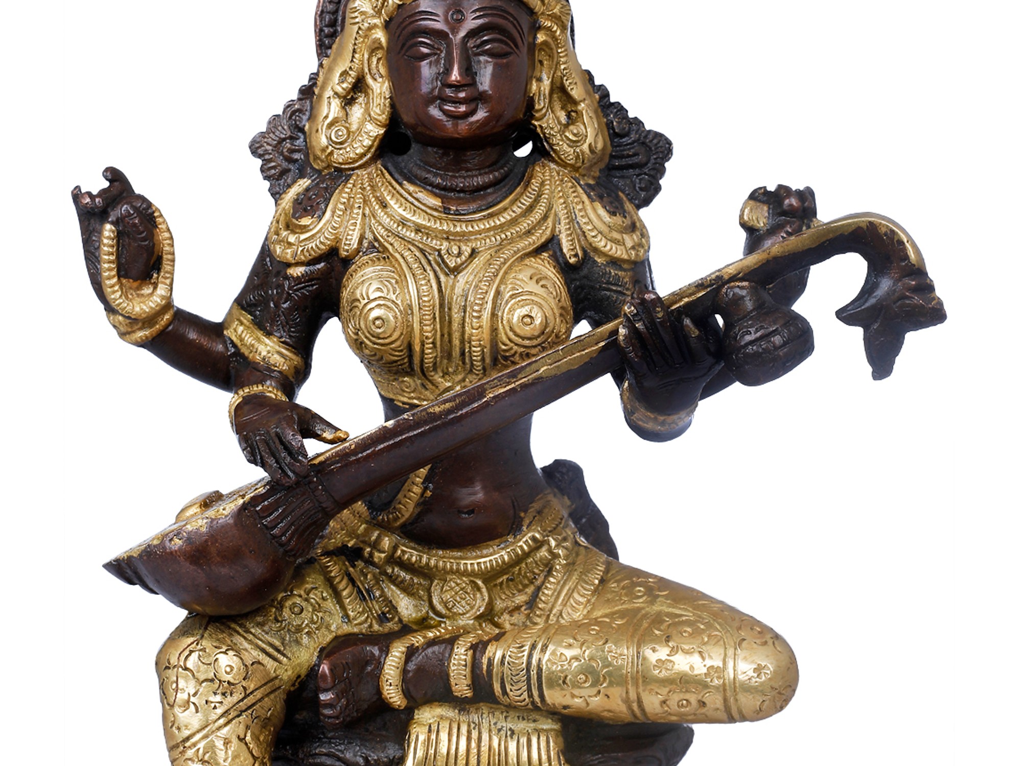 This representation of Saraswati embodies her multifaceted persona. Her multiple arms, a common iconographic feature, signify her omnipresence and her ability to engage with various aspects of knowledge and creativity simultaneously. In her hands, she typically holds a *veena* (a musical instrument), a book, and a mala (rosary), representing music, learning, and spiritual contemplation, respectively. The *veena* itself is not just an instrument but a metaphor for the subtle vibrations of the universe and the harmony that knowledge brings. The intricate detailing on her attire and crown speaks to the richness and depth of the traditions she presides over. The patina, a result of the natural aging of brass, adds a timeless quality to the piece, hinting at the eternal nature of wisdom itself.