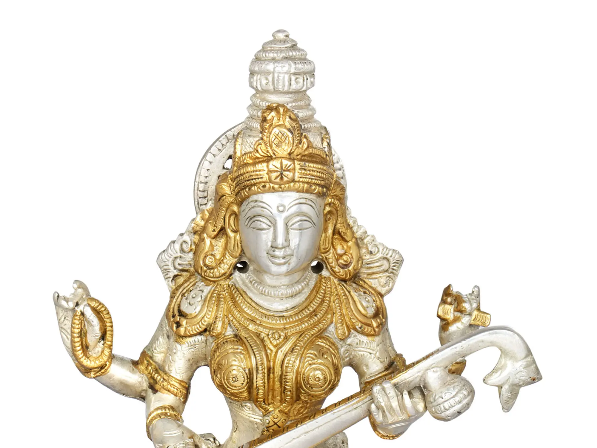 Invite the embodiment of wisdom and artistry into your home with this stunning handmade brass statue of Goddess Saraswati. Seated gracefully on a lotus, she represents the pursuit of knowledge and creative expression, a core principle in Hindu thought. This handcrafted piece radiates the elegance and enlightenment Saraswati embodies. Place it in your study or creative space to kindle your quest for wisdom and artistic inspiration.