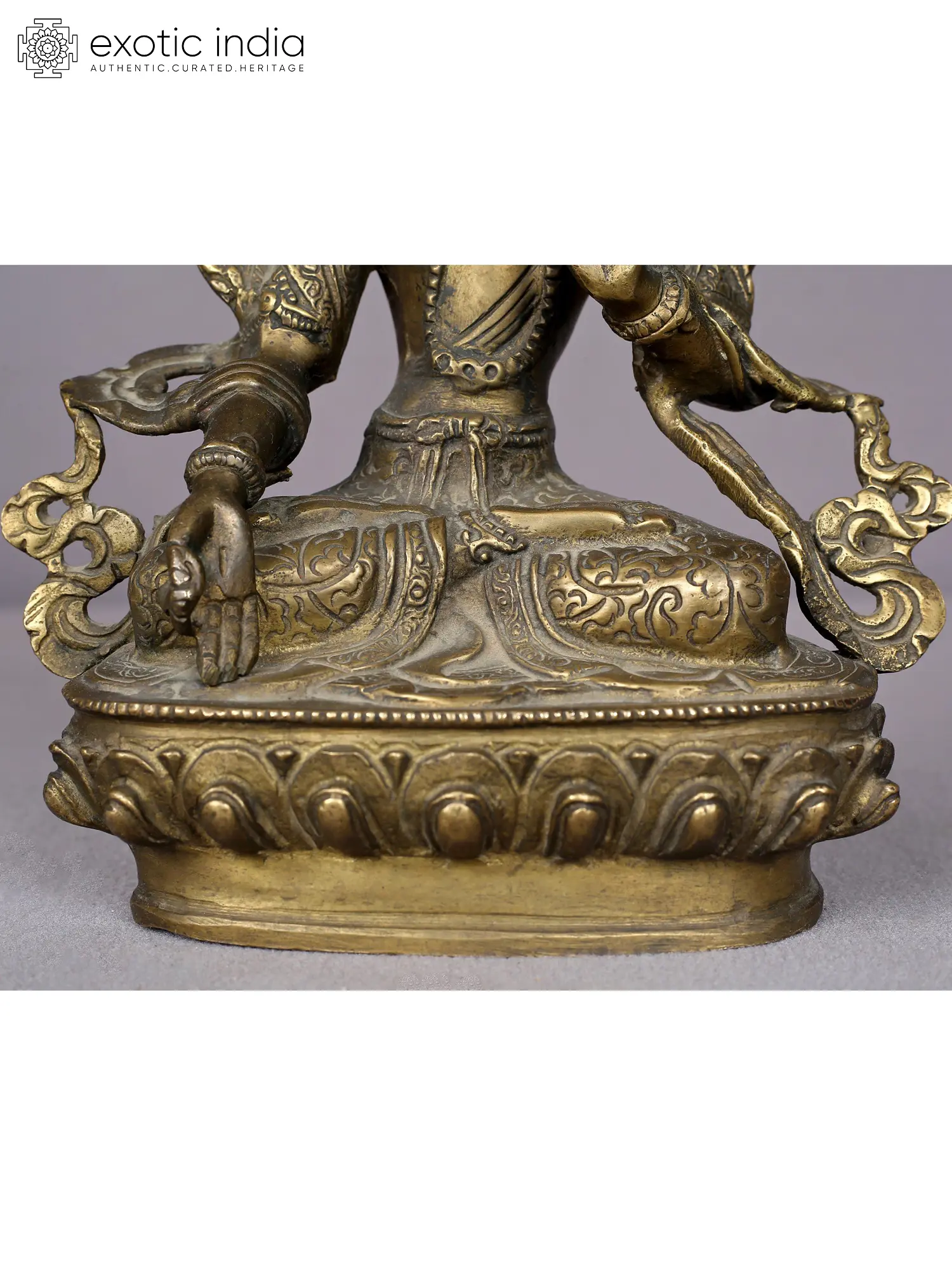 Her right hand gracefully assumes the mudra of supreme generosity, with the third finger touching the thumb, symbolizing the union of wisdom and compassion, while the three extended fingers represent the Three Jewels of Buddhism: the Buddha State, the Body of Teachings (Sangha), and the Principles of the Universal Form (Dharma). This hand also cradles the stem of a lotus, symbolizing transformation, with the lower part of the stem representing the lotus's root in the mud. The Lotus signifies growth emerging from obscurity into the radiant light. Draped in exquisite silk garments, adorned with various jewel ornaments, White Tara sits in a vajra posture, with the palms of her hands embellished with the eyes of awareness.