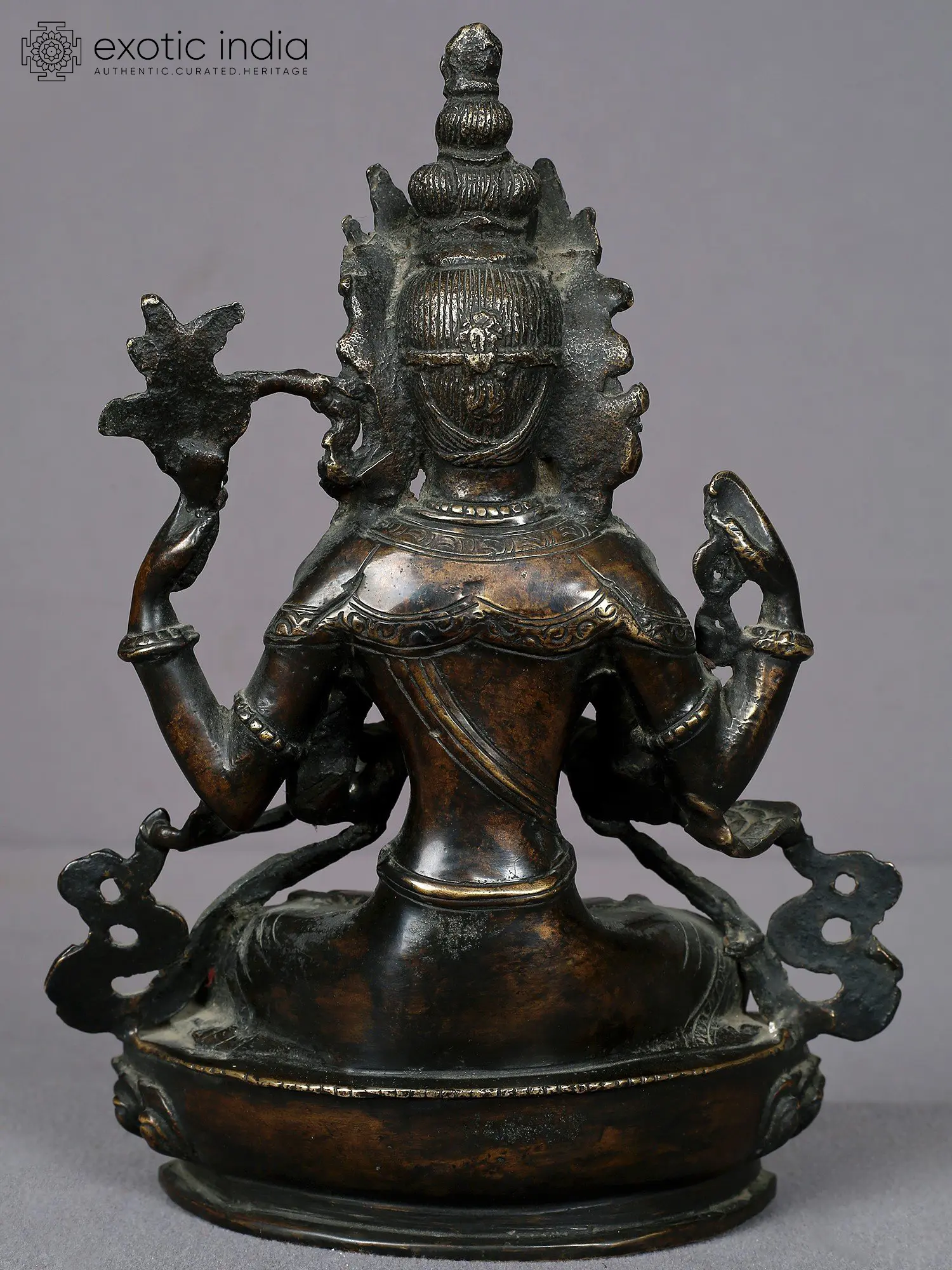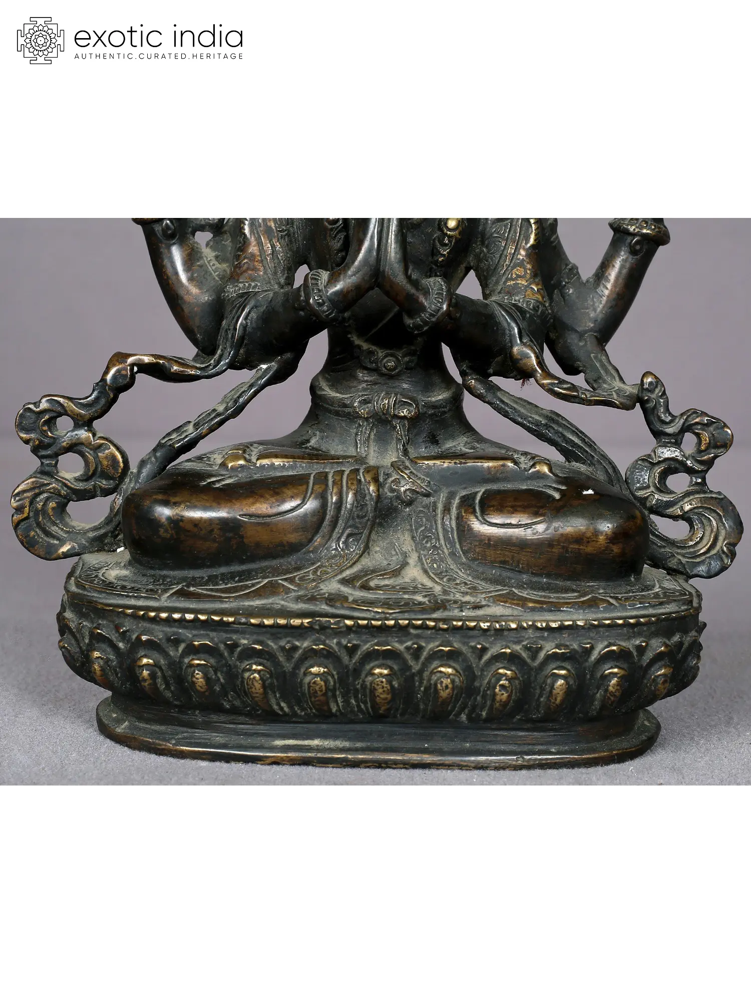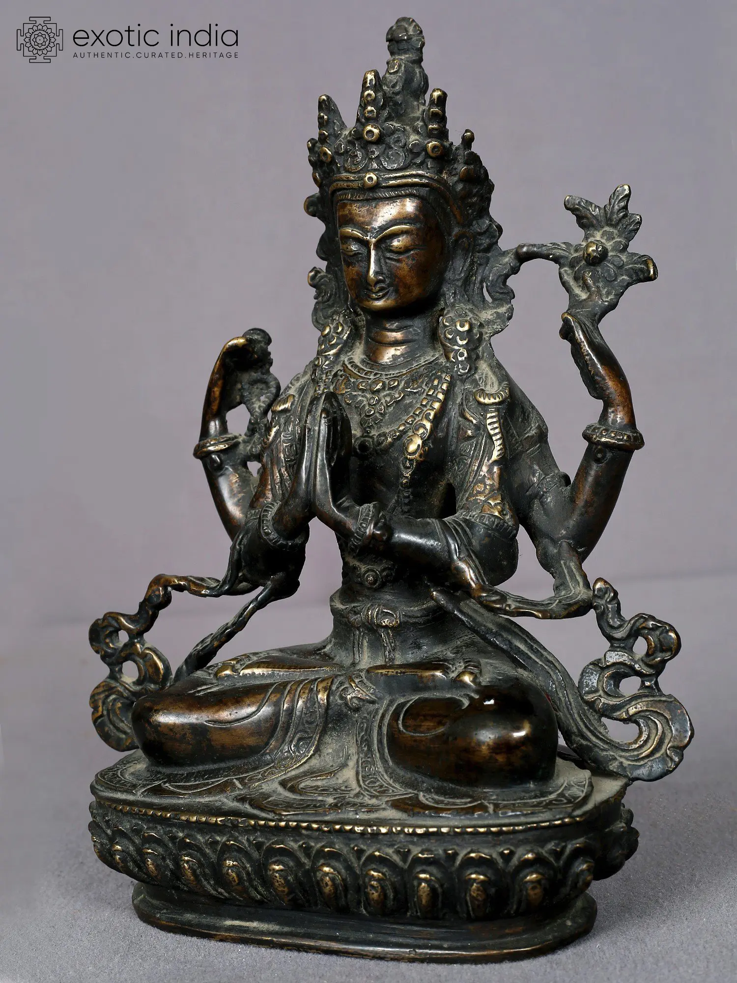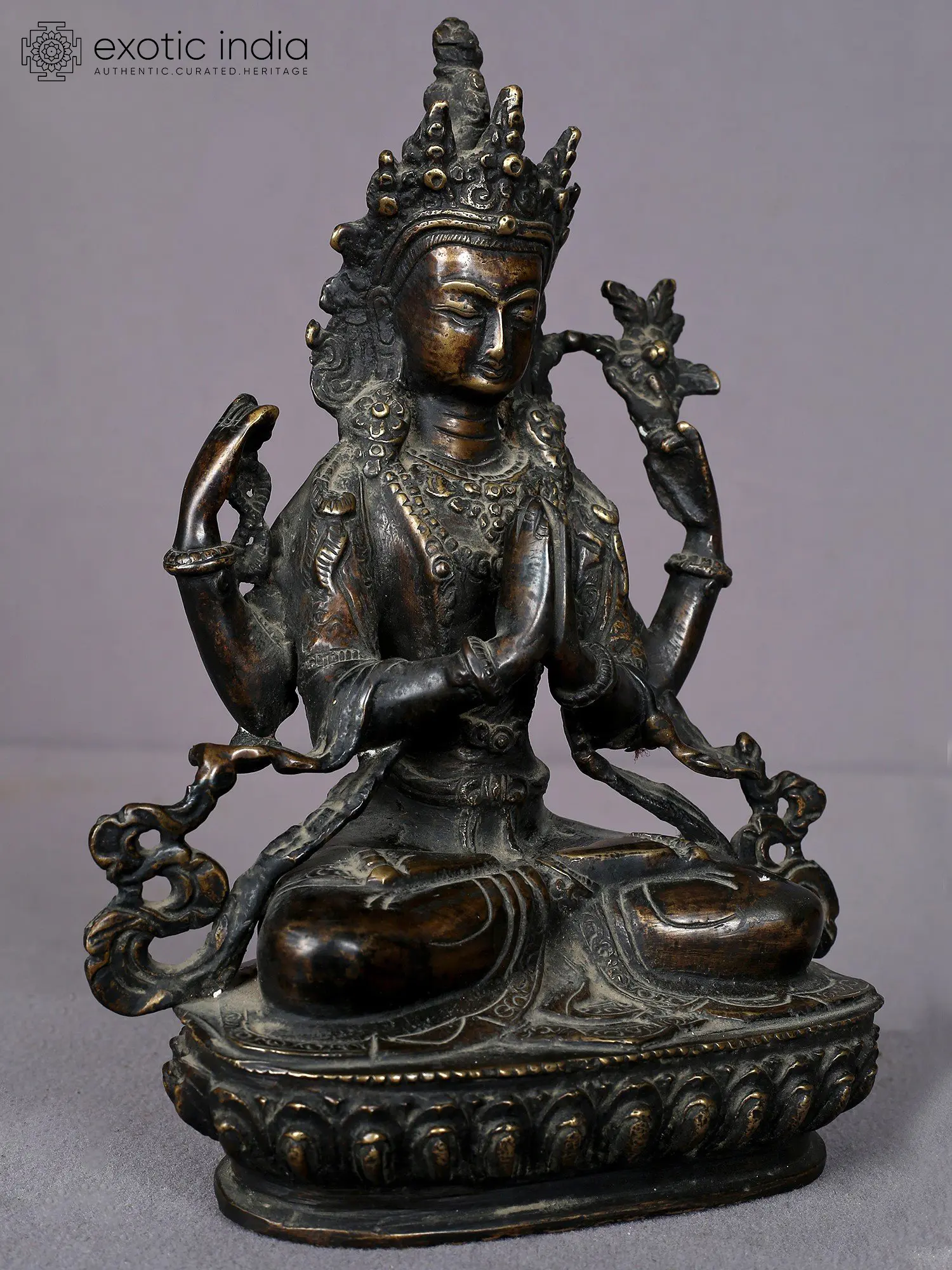 Two of his four arms are clasped together in a prayerful stance symbolizing his unwavering commitment to benefiting every being. His other left hand gently holds a lotus flower, while his other right-hand employs a crystal mala (rosary) for counting mantra repetitions, highlighting his tireless dedication to the welfare of sentient beings. Kharchari's eyes reflect profound understanding, love, and compassion, representing his boundless wisdom intricately linked with universal enlightenment.