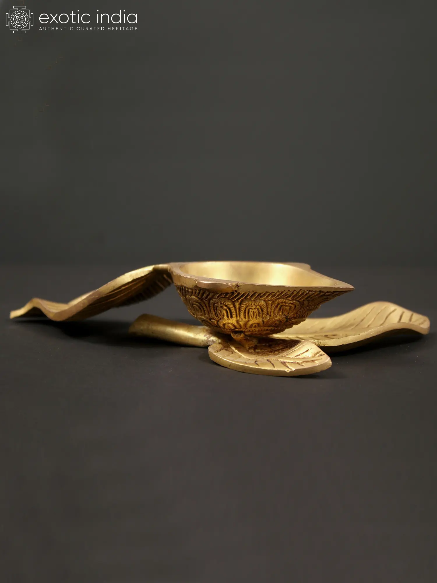 This brass Diya with a simplistic approach exhibits the craftsmanship and meaning infused in every detail. The Diya itself is embellished with carefully with a plain body and motifs of three Bael leaves conveying natural beauty as well as spiritual importance. The two leaves located at the bottom reach out to an elongated handle for holding the Diya during Aarti. These motifs, which are located on three sides of the Diya, represent abundance, auspiciousness, and divine benefits. This enthralling ensemble combines artistry and nature, encouraging viewers to appreciate the intricate craftsmanship and profound meaning that pervades every detail of the Diya.