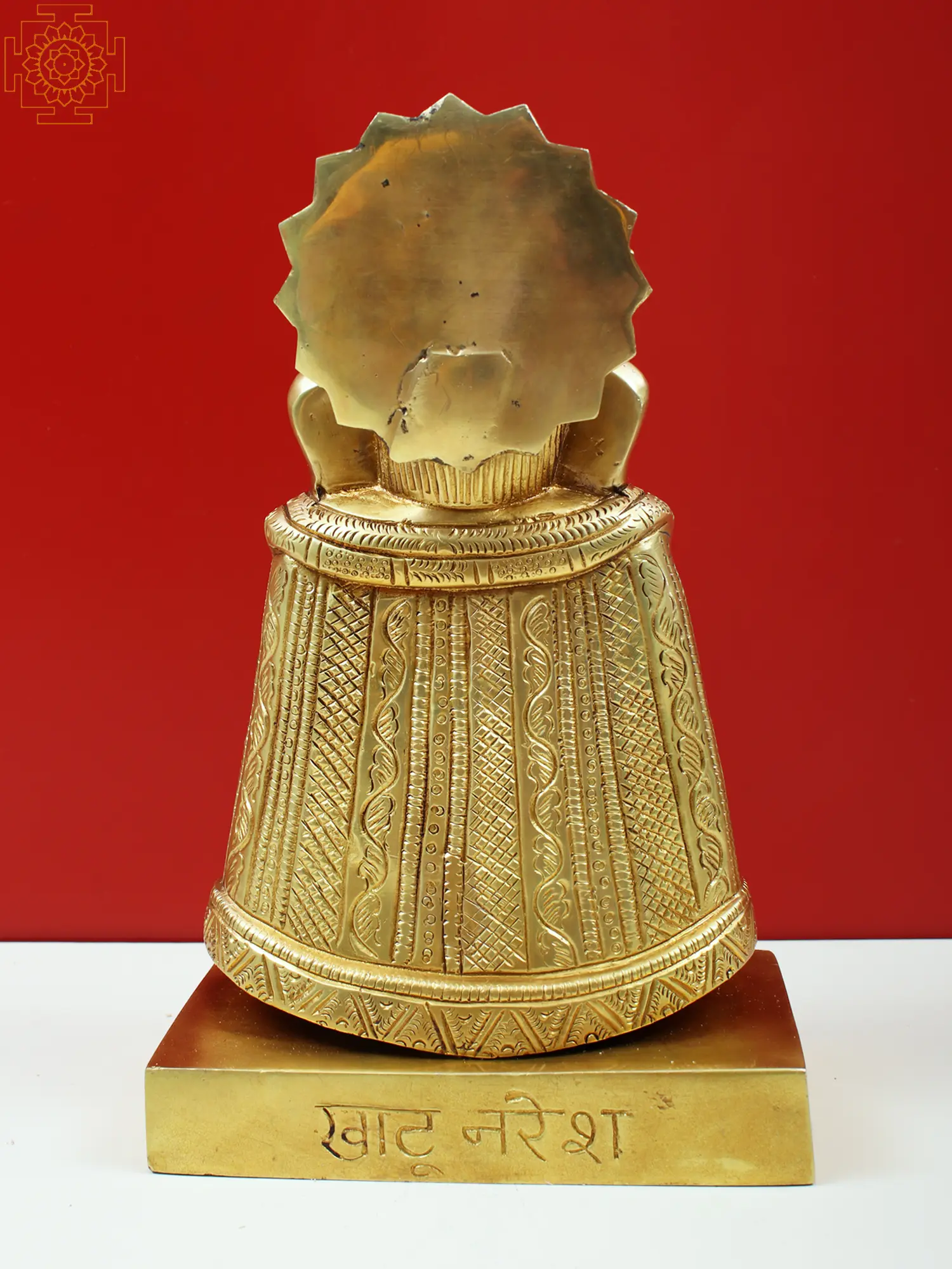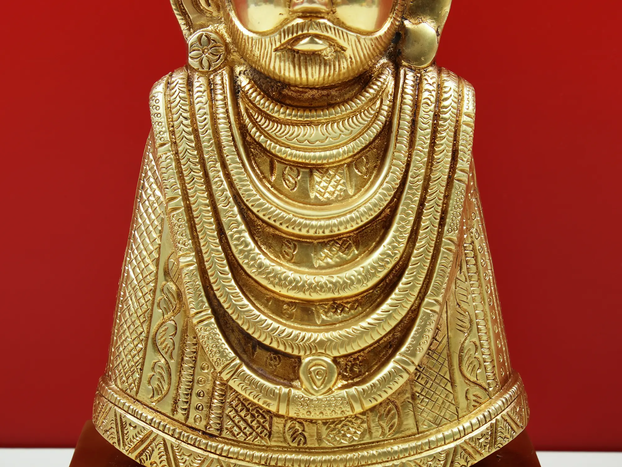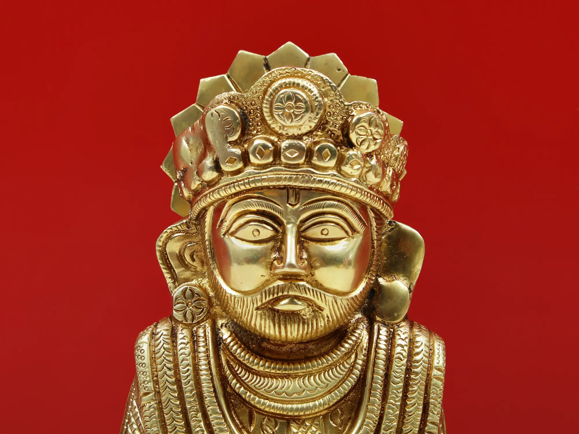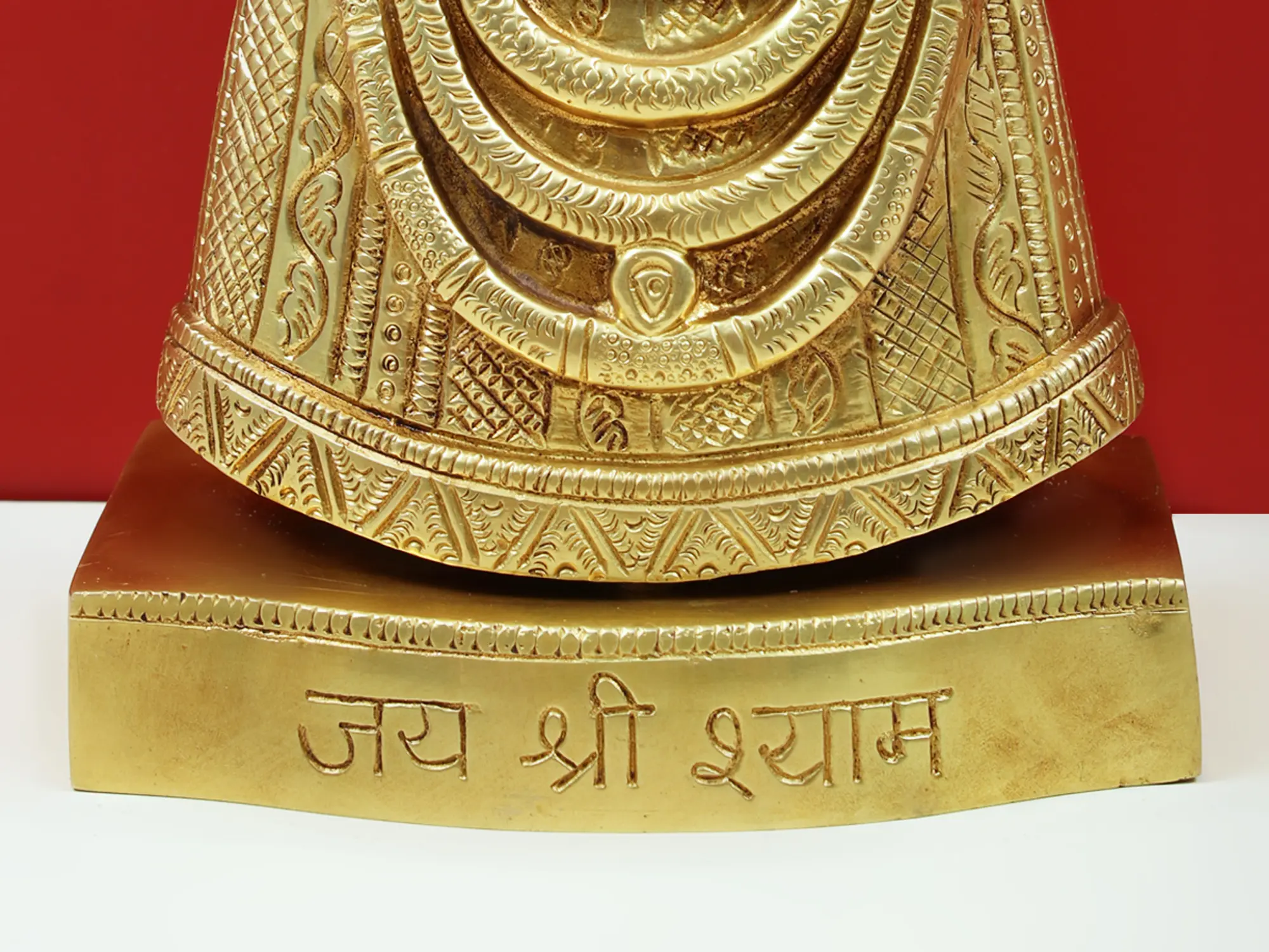 This brass sculpture reveals Lord Khatu Shyam Ji, also known as Barbarika, a revered warrior and devotee. His bow and arrow represent his martial prowess, while the peacock feather adorning his crown reflects his divine heritage. Yet, it's his blue complexion that ties him to Lord Krishna. His posture captures a moment of humility, as his devotion to Lord Krishna takes precedence over his warrior identity. Lord Khatu Shyam Ji's presence encapsulates the duality of strength and surrender, reminding us that even the mightiest hearts are humbled before the divine.