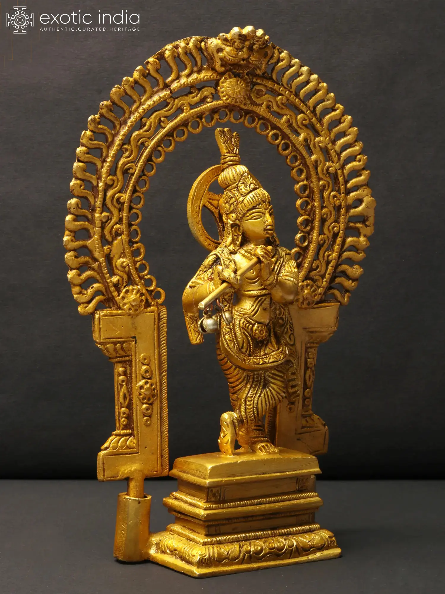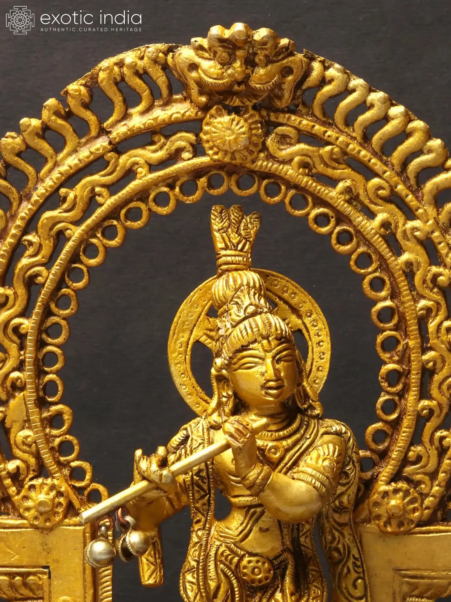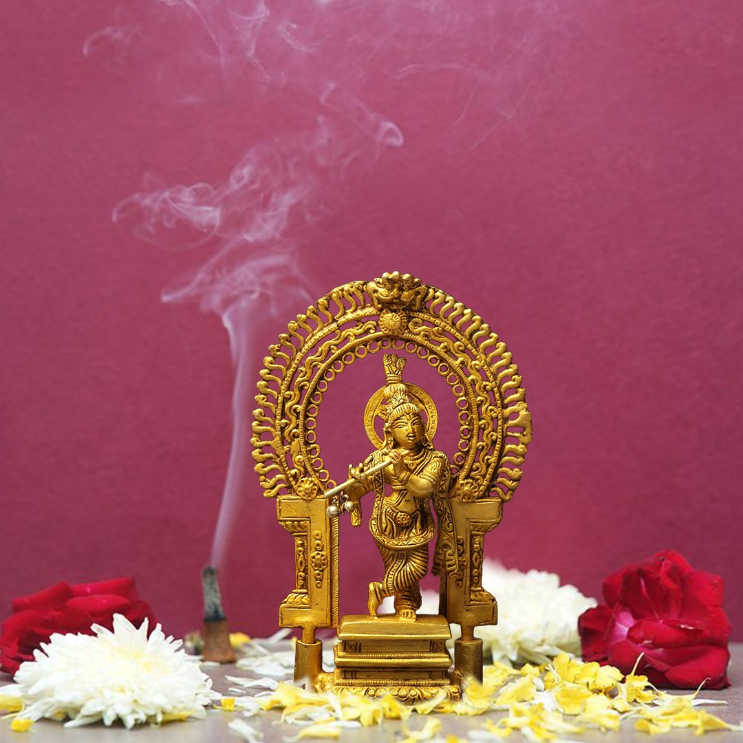 Through the enchanting presence of a Brass Lord Krishna Playing Flute on Kirtimukha Pedestal, the mesmerizing melodies of Krishna's flute resonate. Krishna, the divine flutist, captivates hearts with his enchanting music. The sculpture is made of the beauty of creativity and expression. Like Krishna, who touches souls with his music, find the courage to share your talents with the world. Embrace the joy of creative expression, knowing that within you lies the power to inspire and uplift others through your unique gifts.