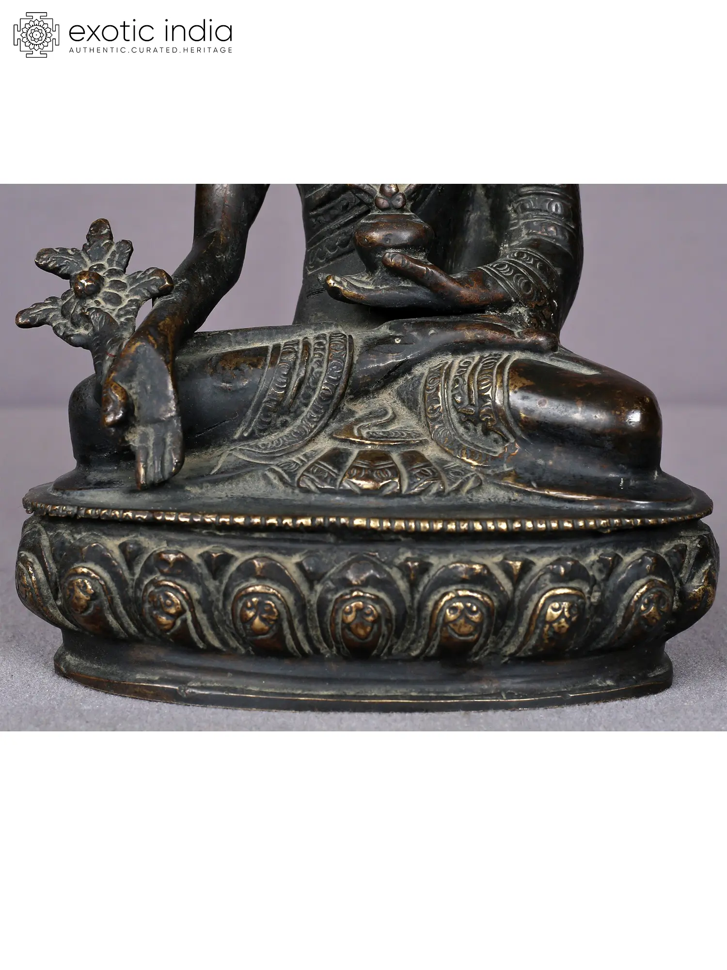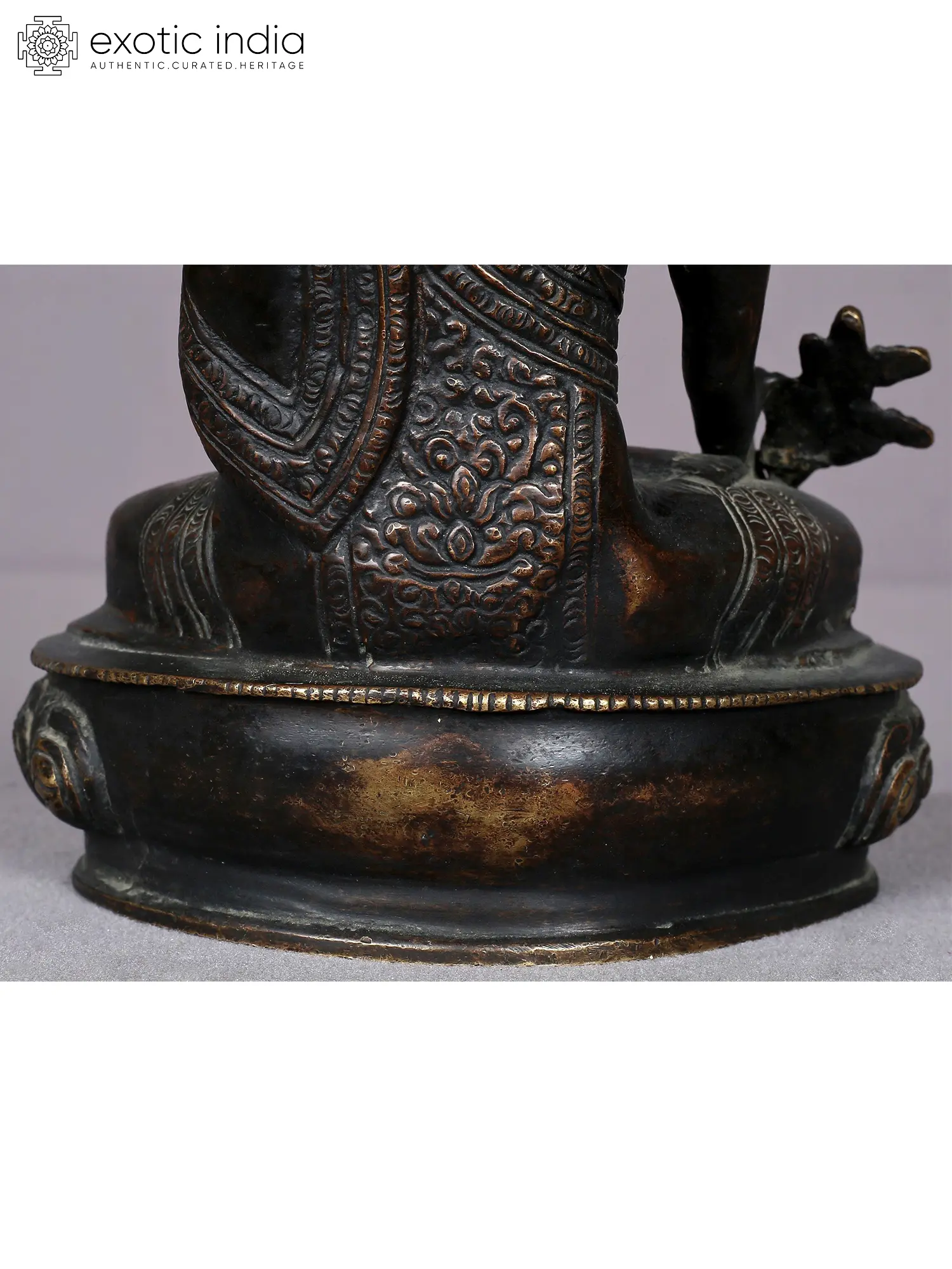 He is seated in a meditative posture known as Dhyana Asana, he sits gracefully on a lotus-petal pedestal, legs crossed and the soles of his feet turned upward. In his left hand, he cradles a jar of healing medicine with a serene palm facing upward, symbolizing meditative serenity. His right hand gently clutches the stem of the Aruna fruit or Myrobalan, nestled on his right knee, representing the embodiment of the world's finest remedies. While his left-hand holds the medicine alms bowl. This hand signifies the eradication of suffering through the realm of relative truth. Draped in monastic robes that envelop both shoulders but leave the chest area open, Medicine Buddha embodies the profound wisdom of healing and compassion.