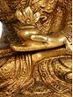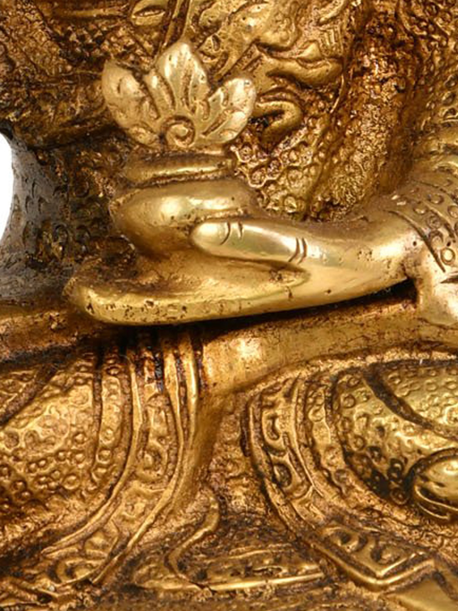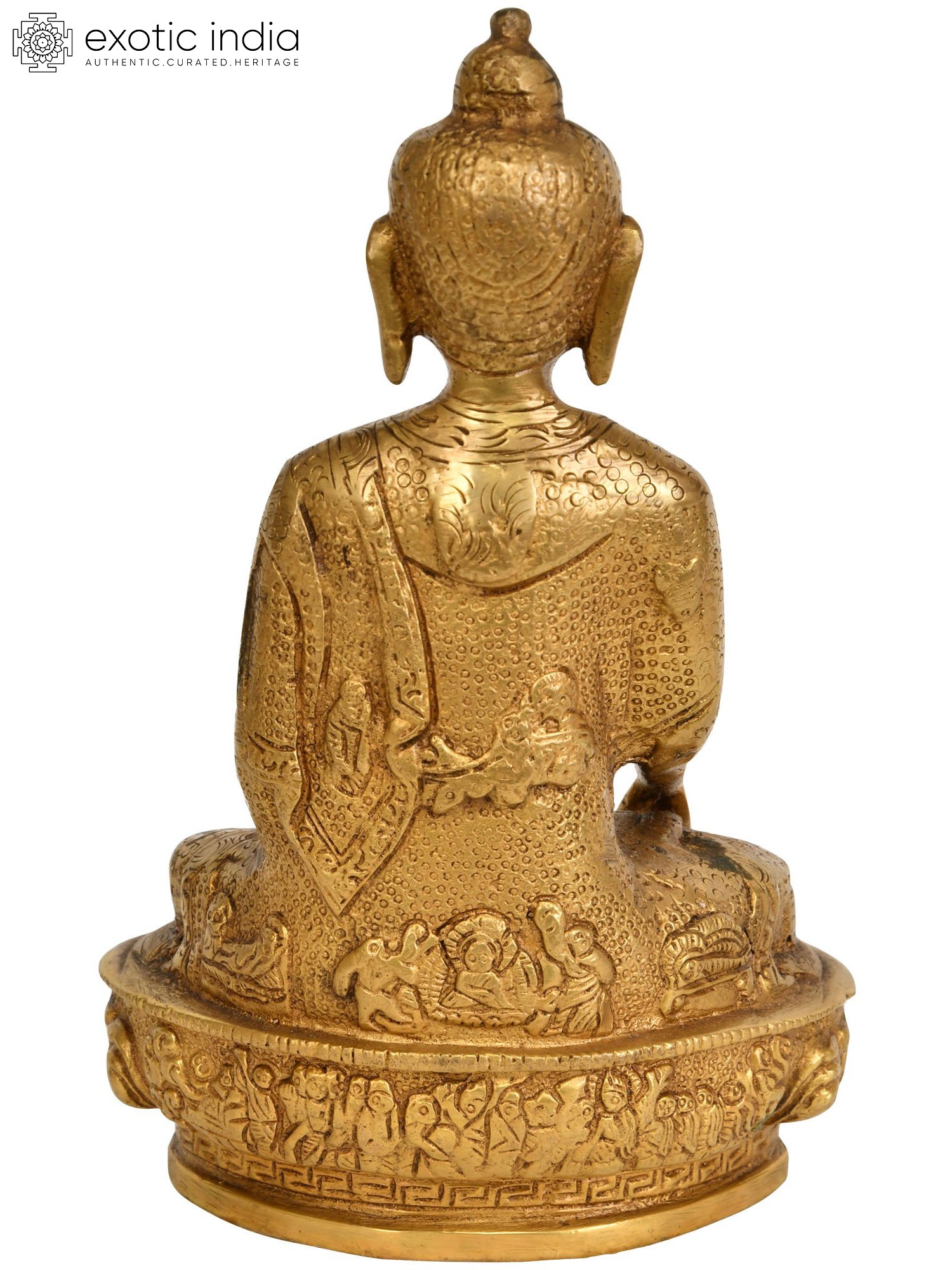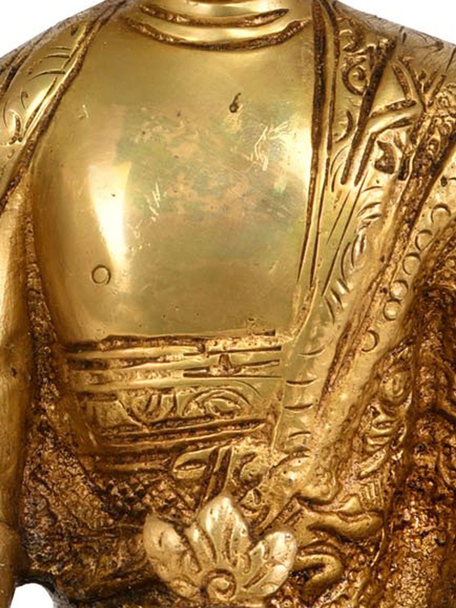 This Resplendent Buddha is a gilded statue of peace and exquisite beauty. It exudes elegance with its exquisite and bright precious stones on its attire and the light circle behind it. Lord Buddha is shown in the Bhumisparsha Mudra with half-closed eyelids, representing deep concentration and inner serenity. The Uttari offers a feeling of spiritual harmony with holy trees, clouds, and legendary forms. The Buddha's curls are masterfully described and emphasized with brown color, while the facial characteristics are reproduced with outstanding golden color. When put in any location, this Buddha statue may improve the power of the mind and bring peace.