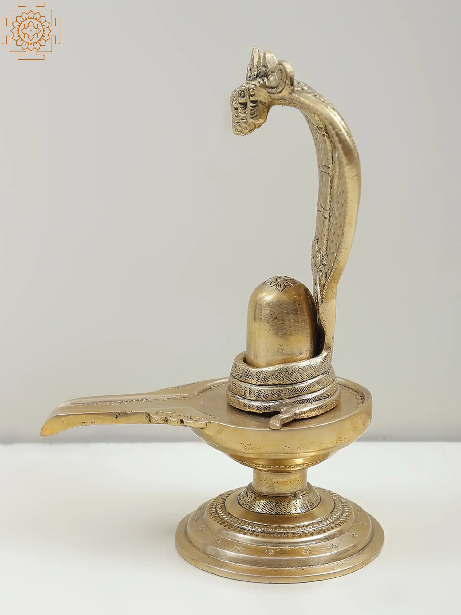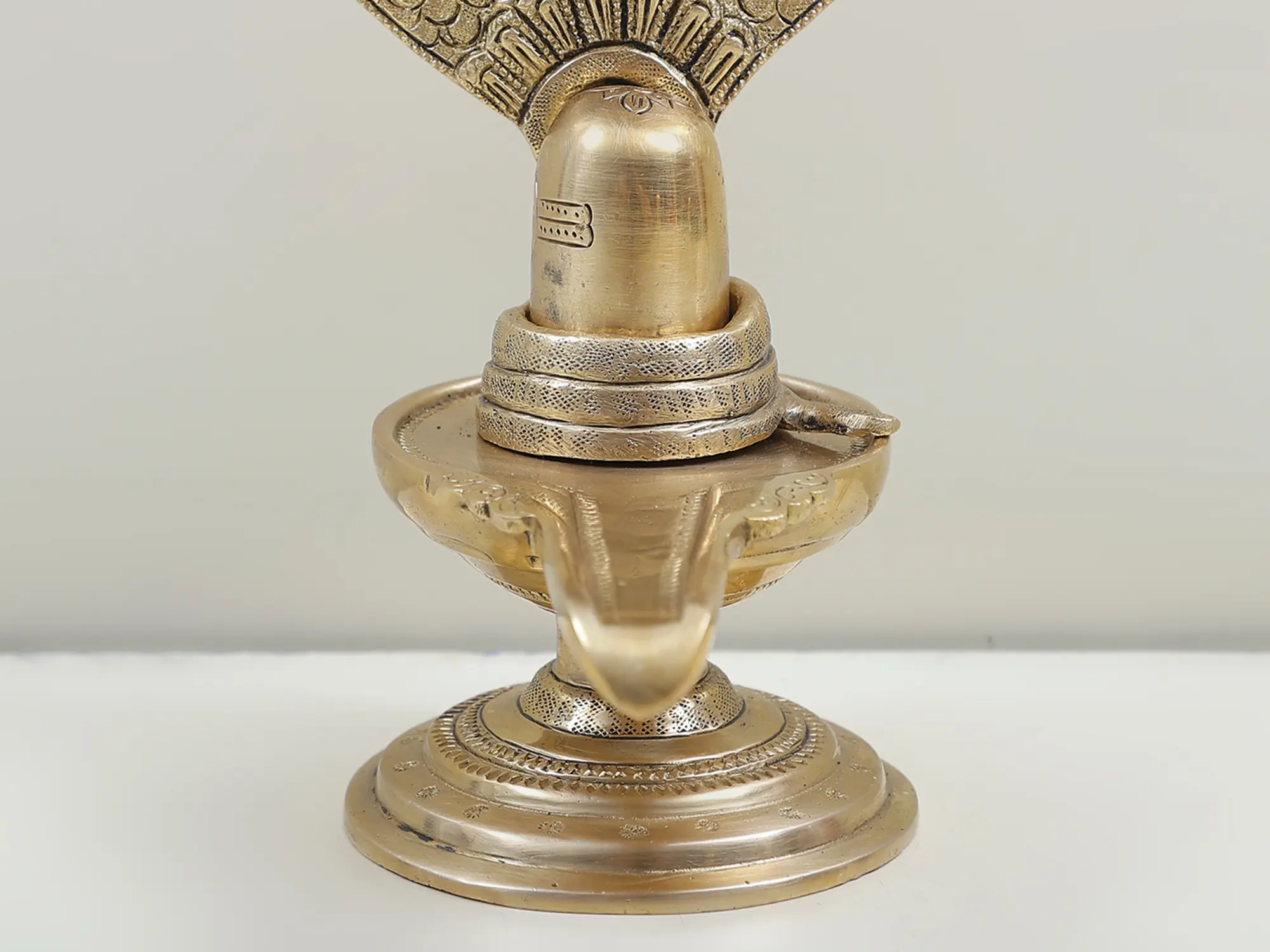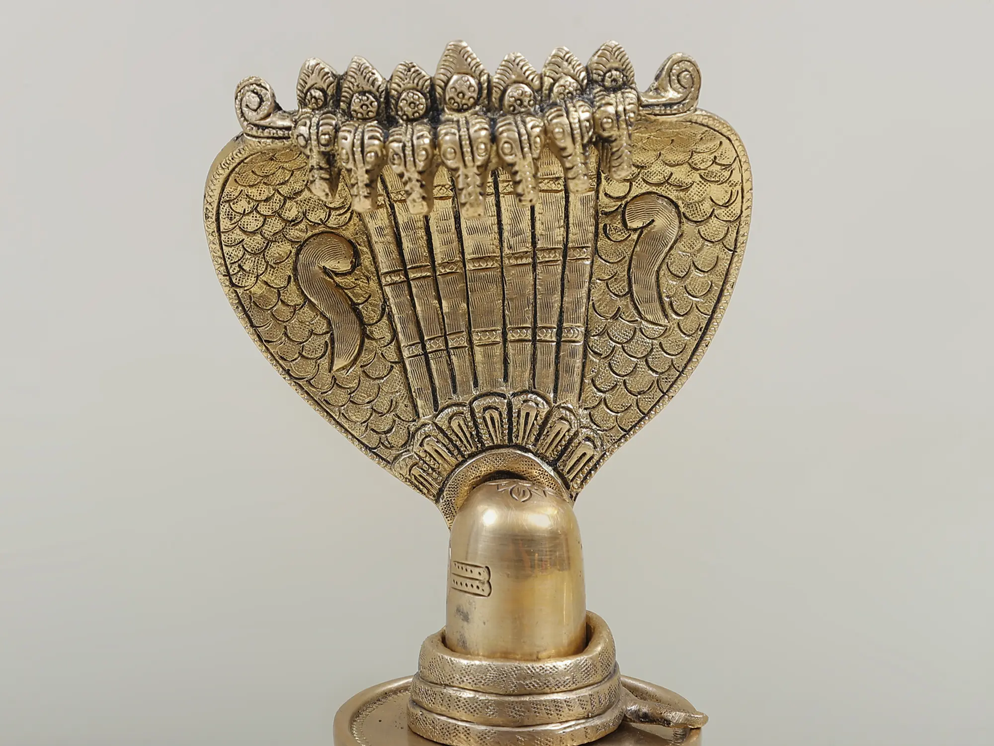This Shiva Linga, made of solid brass, embodies the cycle of life, death, and rebirth with the cosmic snake coiling around it. Shiva, the mystic in deep meditation, stands for change and freedom. The divine energy without form is represented by the linga. The seven chakras, or pathways of spiritual energy, are represented by the seven-headed snake. This sculpture, which is encircled by the profound symbolism of the snake, invites us to seek inner awakening and transcendence by serving as a reminder of the everlasting dance of existence.