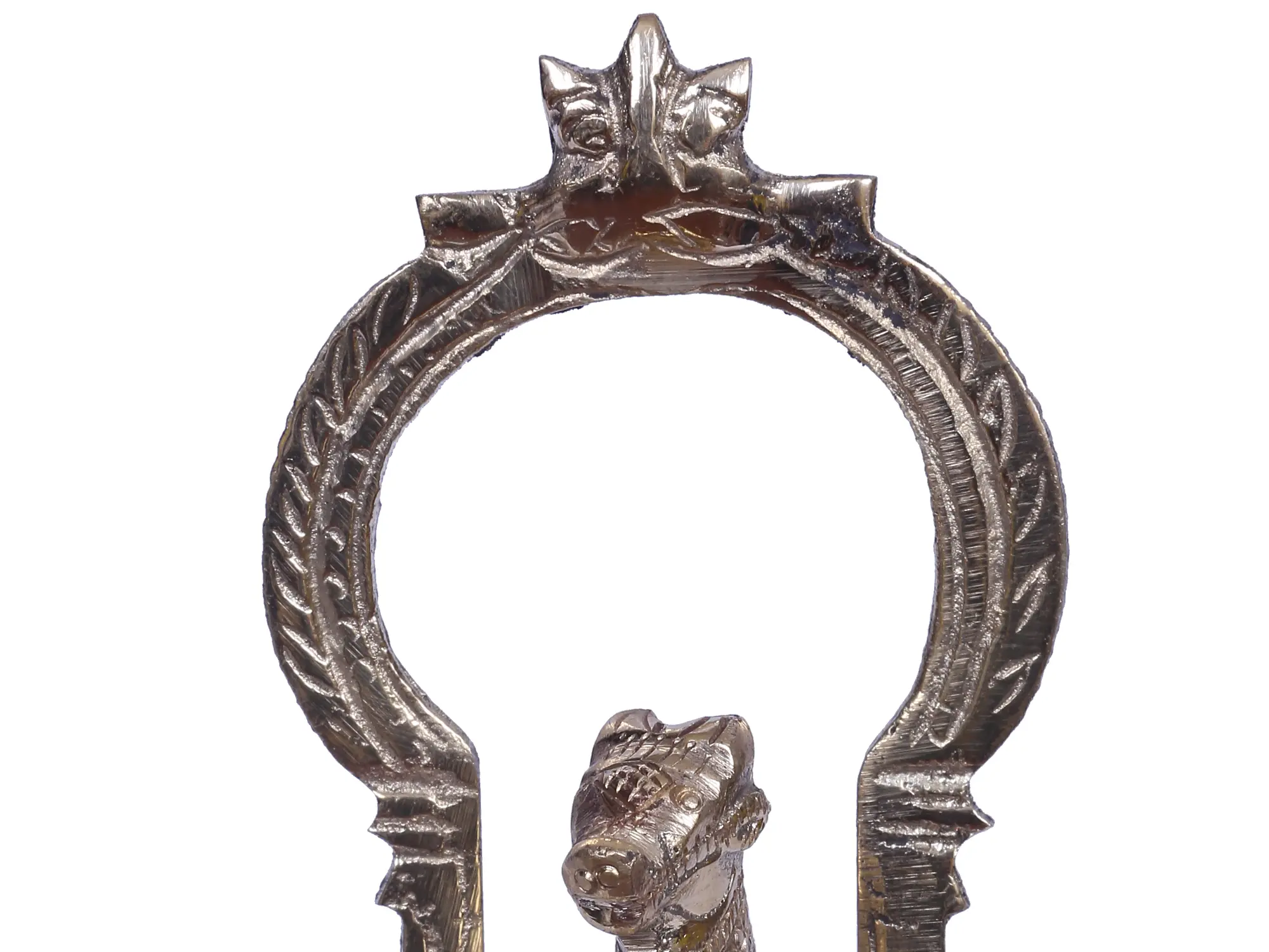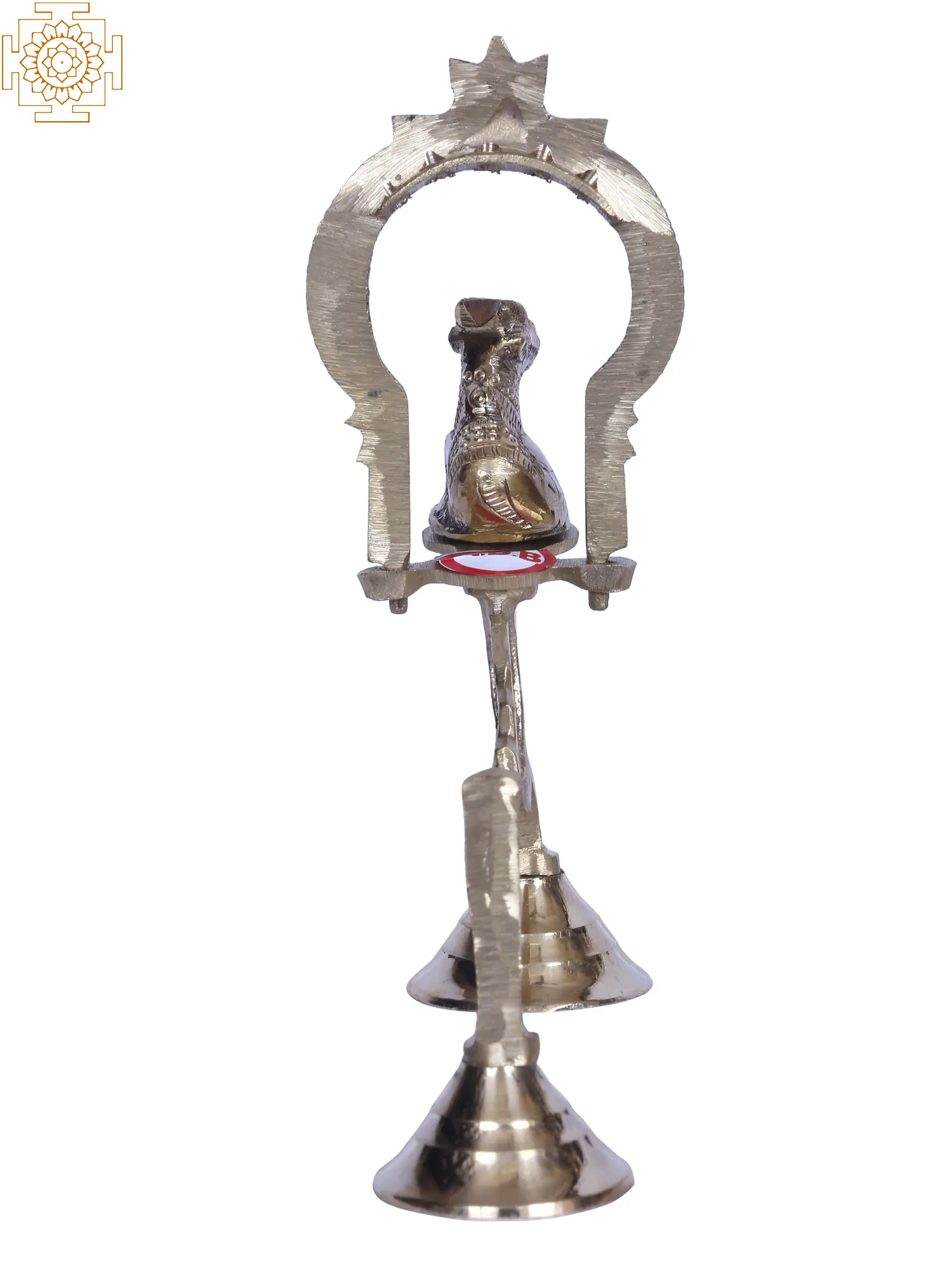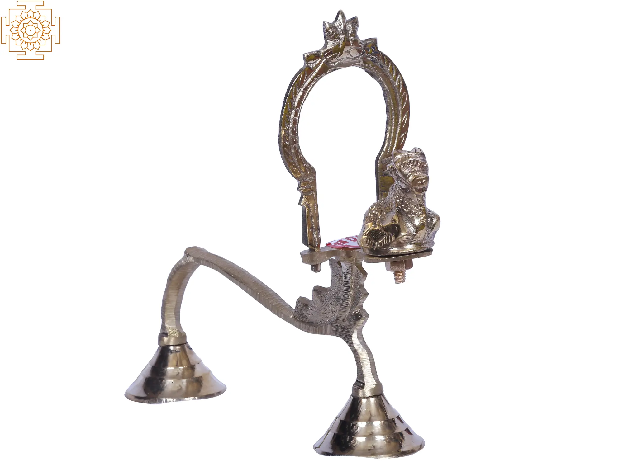 This Brass Shodash Upachara Nandi lamp is also identified as a bull lamp (vrisabhadipa). It is a part of the sixteen-step Sodhasha Upchara. This lamp is also used for Kakada Aarti or the ritual offered to the deities’ early morning. It is made of high-quality brass and also manufactured by skilled artisans. It carries high ritualistic values and is very unique due to the absence of a regular oil basin. This lamp has the regular two-leg stand upon which sits a Nandi encircled by a Kirtimukha Prabhavali. There are five holes behind the Prabhavali which signify the Panchabhootas or five basic elements.