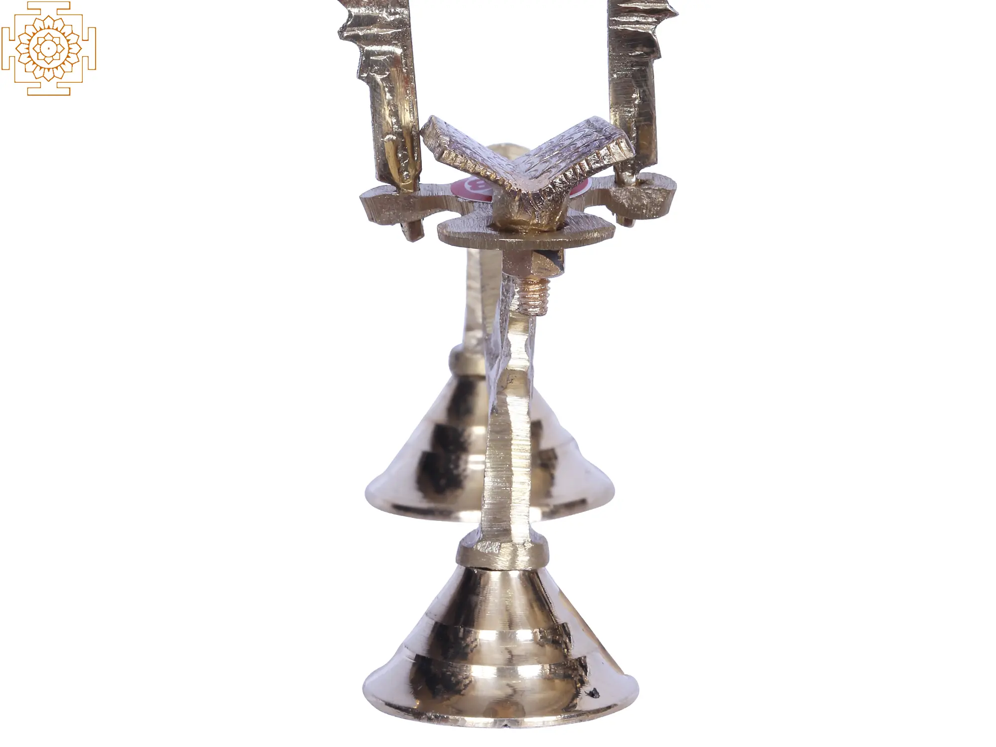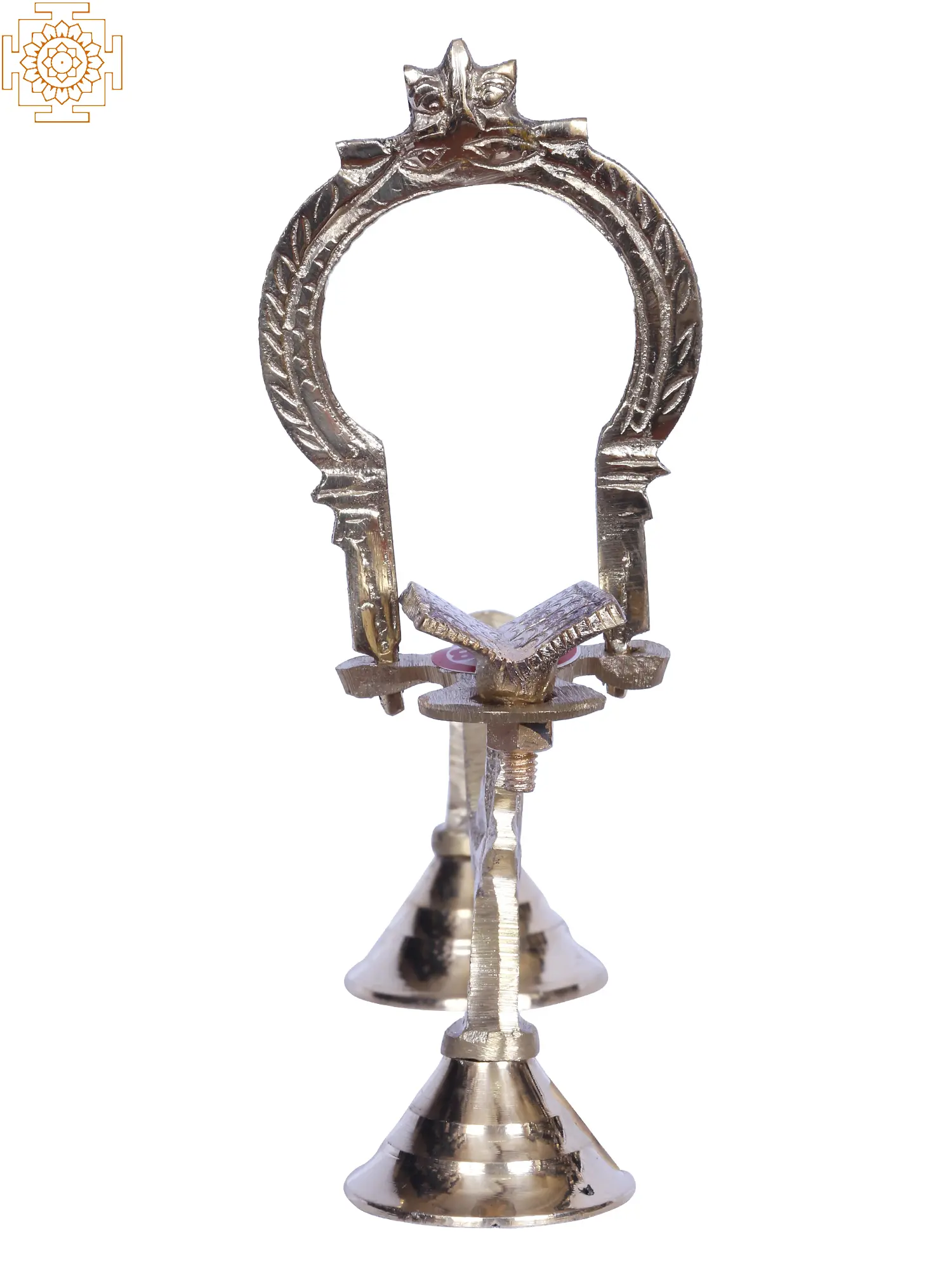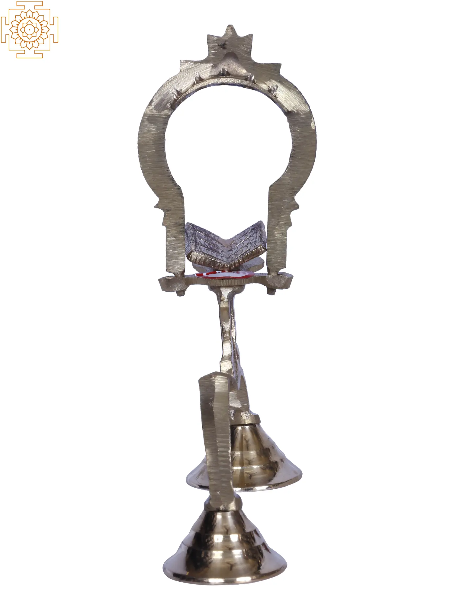 This brass Shodash Upchar lamp is an arched lamp commonly known as an anasaka lamp. The word anasaka means without any wick. These lamps are devoid of an oil basin. This lamp consists of the Kirtimukha arch, mandatory for these kinds of lamps. There is also a central image of Veda, placed under the arch. There are small holes behind the arch to enable the insertion of cotton wick dipped in ghee and enable the process of aarti by lighting them. The statue of Veda at the center signifies the status of knowledge as the supreme virtue. These lamps are lit after the Dhoop aarti and before Naivedyam during the sixteen-step Shodasha Upchara.