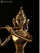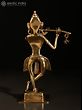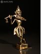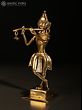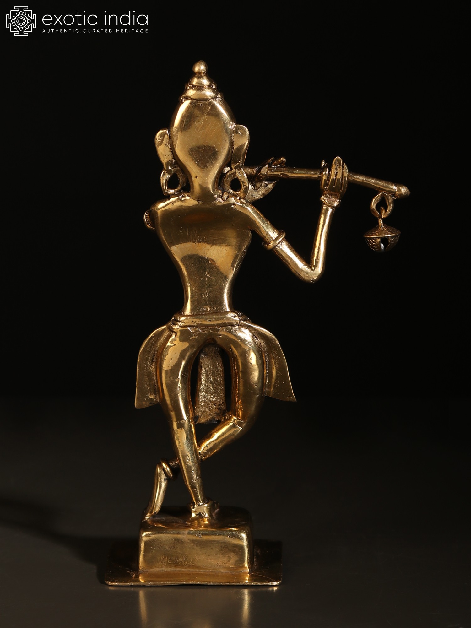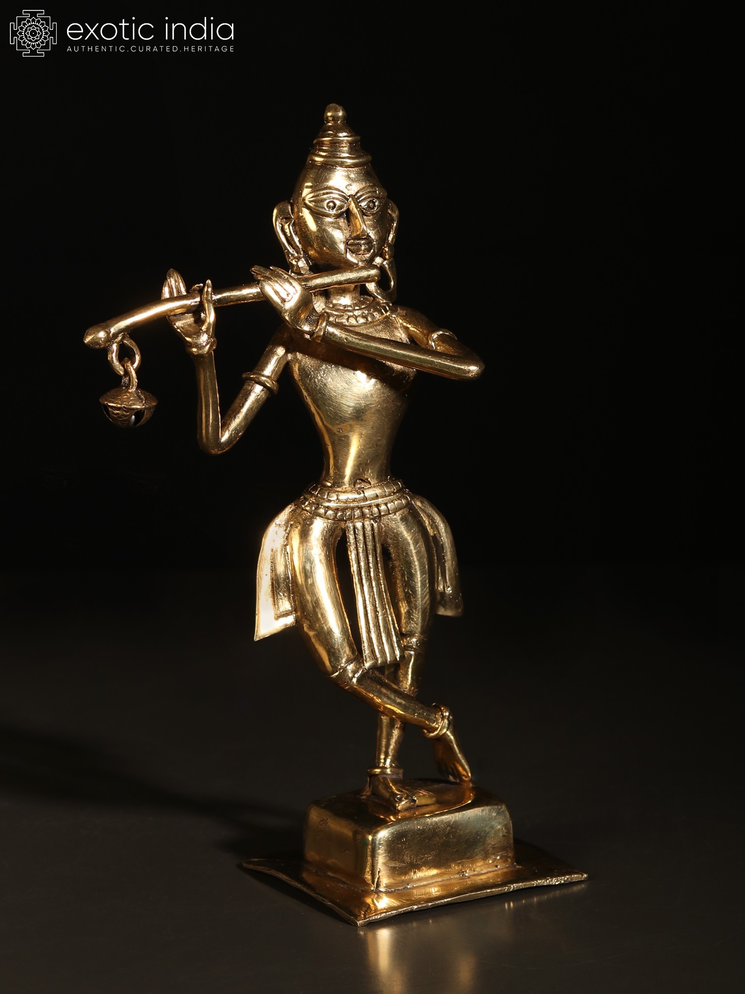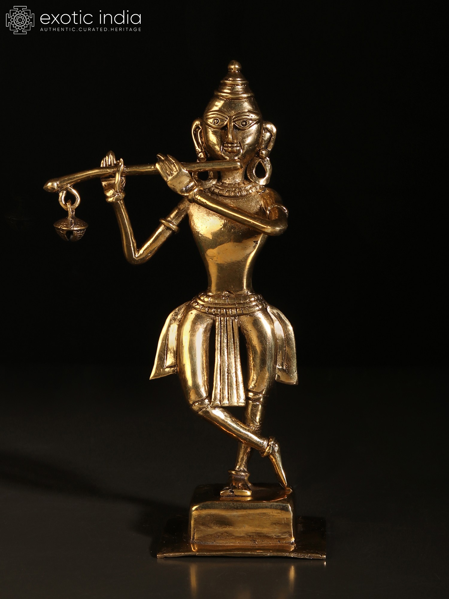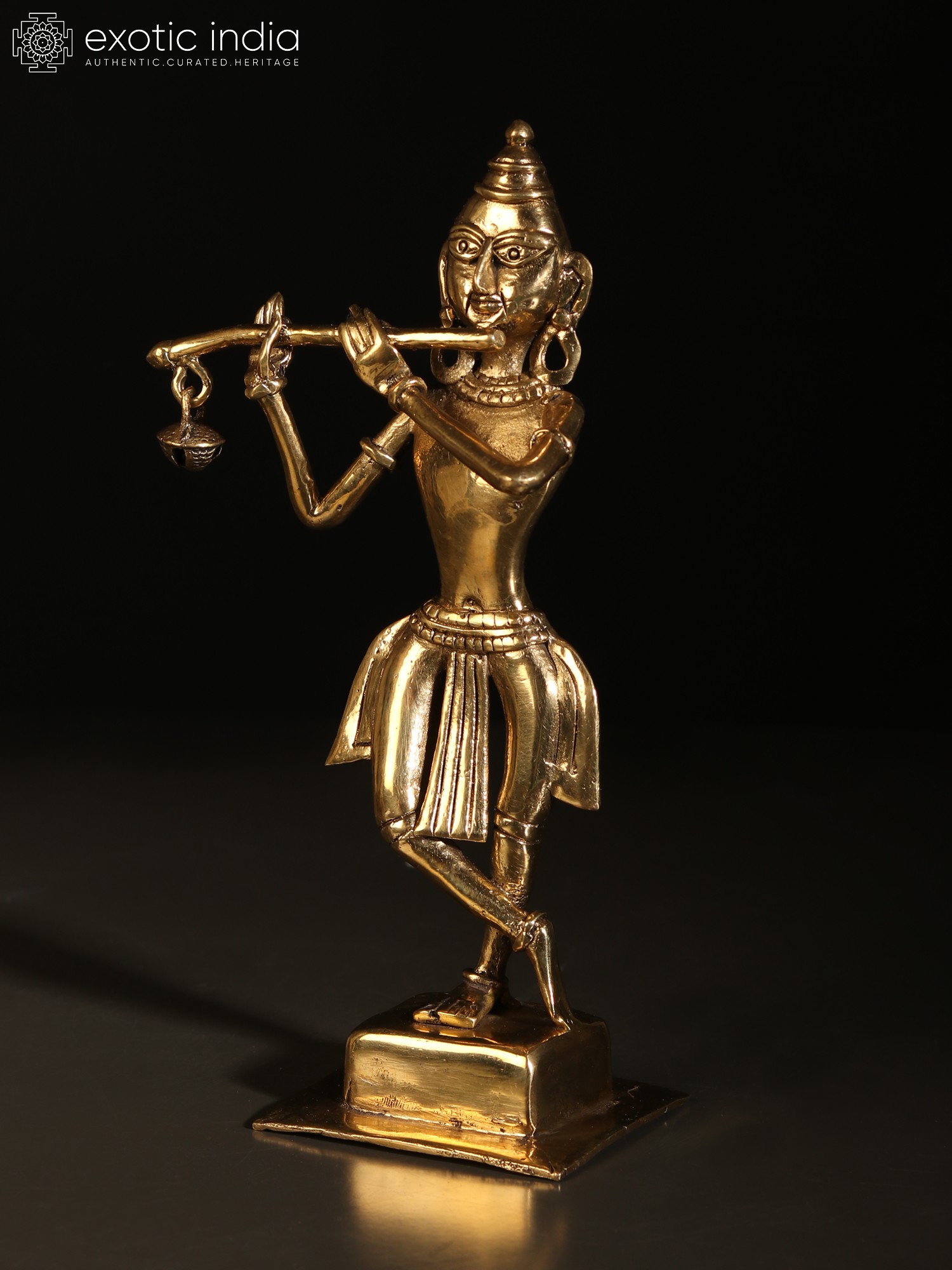 In the simple yet enchanting iconography of Dhokra art, this brass statue of Krishna brings the charm of Murli-Manohara. On a plain square pedestal, Krishna stands in the popular Tribhanga or triple bent posture, adorned with rare, tribal ornamentation of round earrings, necklace, plain armlet and bracelet, and a lower body garment whose tassels flowing on three sides add a sense of movement to the icon.