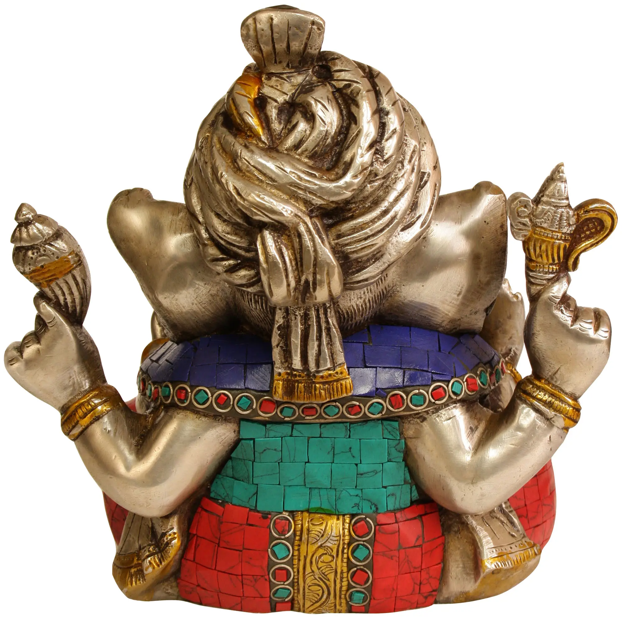 Seated serenely, Ganesha’s form radiates childlike charm. A Trident (Trishul) mark adorns his noble forehead, signifying his supreme authority. With a right hand extended in the “Ashirwad Mudra”, his blessings flow like a sacred river. Dressed in regal splendour, He dons intricate jewellery and an “ornate turban”, an emblem of his majesty. The elephant-headed deity relishes a “Modak”, the sweet delight of devotion. In his upper hands, Ganesha wields a “Goad” and a “Noose”, symbols of mastery over life’s challenges. His ample belly, a symbol of abundance, adds to his endearing form. Crafted in brass, this masterpiece boasts mesmerising inlay work, transcending the mortal realm with its divine allure.