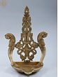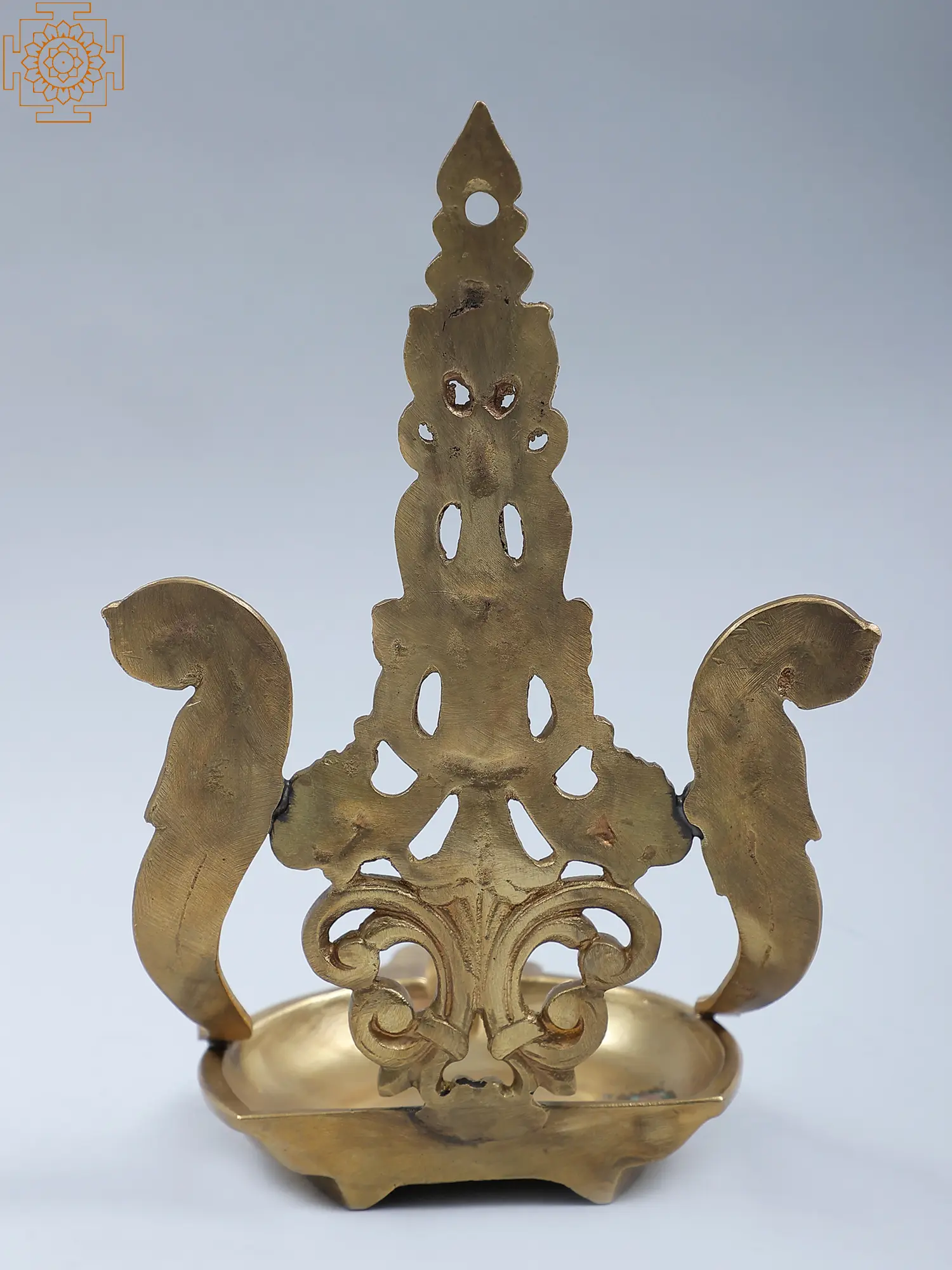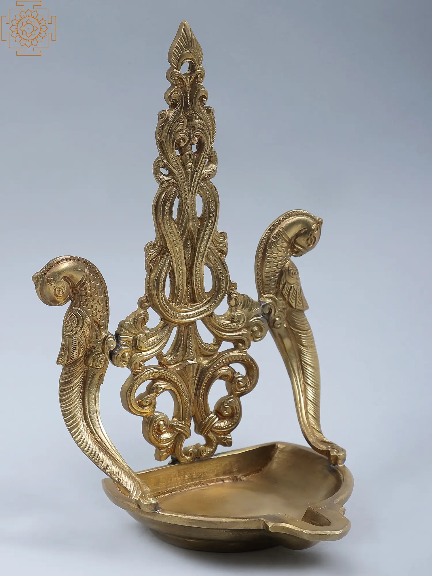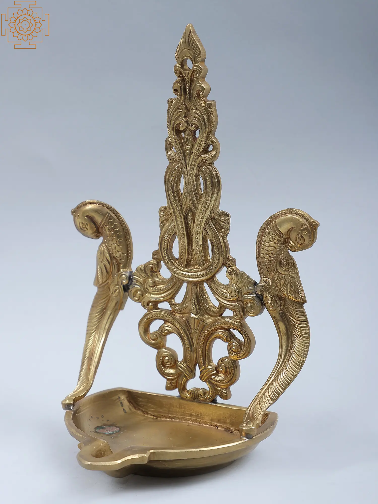This wall mount Bronze Designer Diya in Hoysala style is a remarkable monument to the glorious sculpting art that was born and cultivated throughout the Hoysala period. Inspired by the beautiful blocks of the temples of Belur and Halebidu, the artist has combined the holy emblems of parrots and vine knots to enhance the lamp's auspiciousness. The lamp, as a means for imparting the warm blessings of the Almighty, is aided by the harmony of nature to multiply the effect. The delicate embellishments highlight the artisans' talent, while the vines link nicely at the back, bringing a touch of refinement to the design. This Hoysala Art Diya is an interesting blend of art and symbolism, serving as a symbol of timeless elegance, elegance, and devotion.
