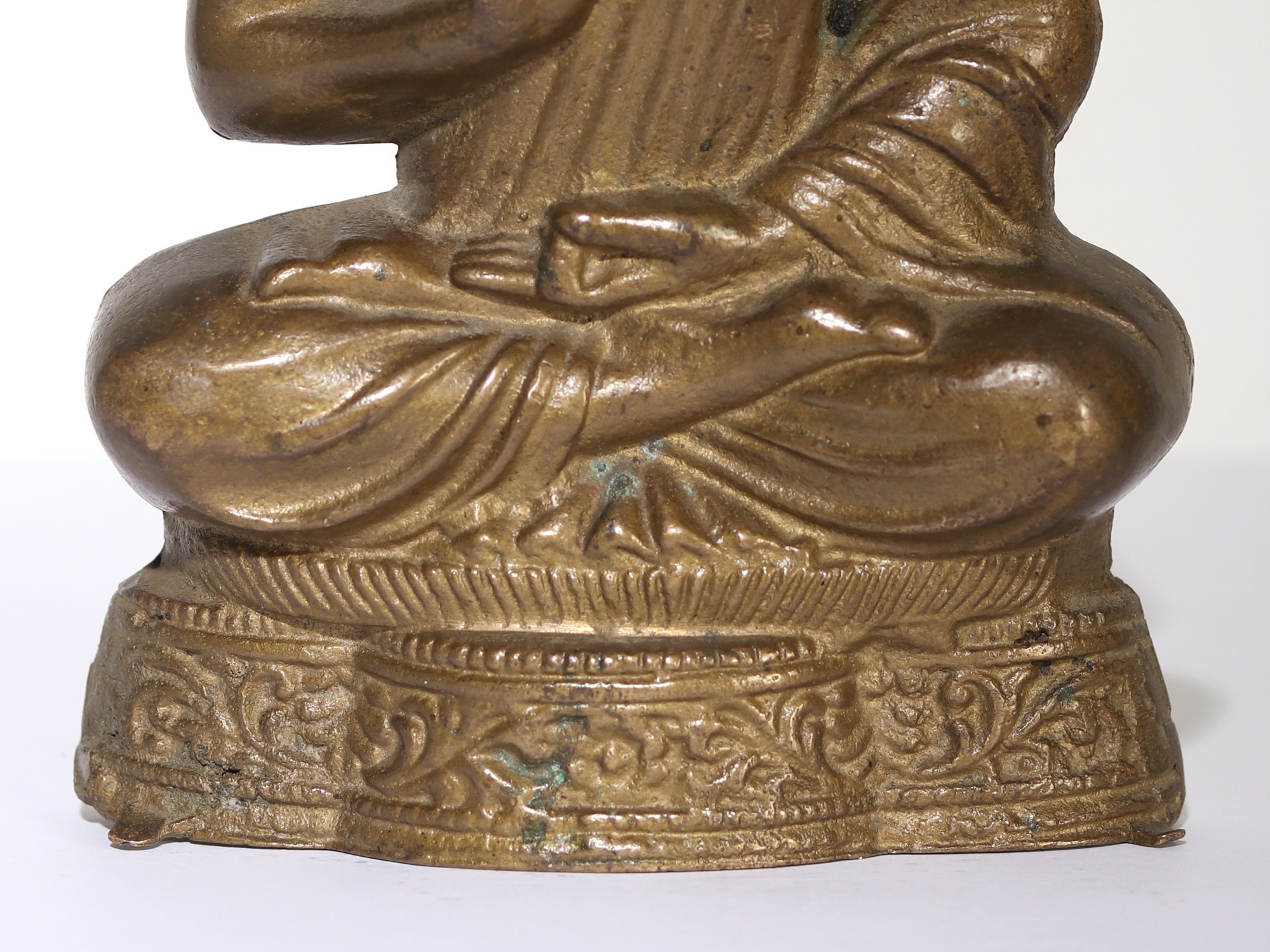Crafted from brass, this statue resonates with a weight and durability that echoes the enduring strength of the Buddha's teachings. The golden hue of the metal reflects light, creating a warm and inviting presence. The statue has been carefully cast and finished, with attention to detail evident in the robe's folds and the peaceful expression on the Buddha's face. The statue is resting upon a beautifully carved lotus base.