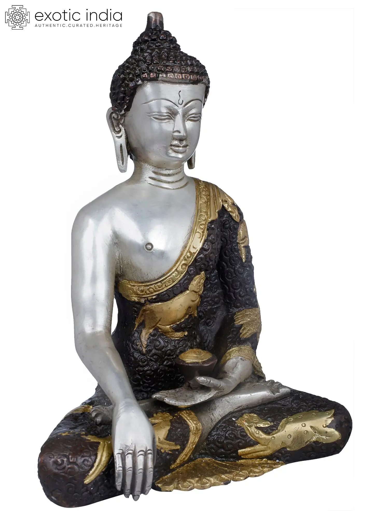 Hand-crafted in India, this statue is a testament to the rich heritage of metal artistry. The choice of brass lends a timeless quality to the piece, its warm glow and potential for patina adding to its spiritual resonance over time. The intricate detailing on the robe, adorned with subtle yet captivating patterns, speaks of the meticulous skill of the artisans. The tranquil expression on the Buddha's face, with downcast eyes and a gentle smile, invites contemplation and inner peace. The seated posture, in a meditative pose, further enhances the aura of stillness and profound concentration. The small bowl held in the left hand often symbolizes the alms bowl, a reminder of the Buddha's renunciation and his practice of humble existence. ––––––––––