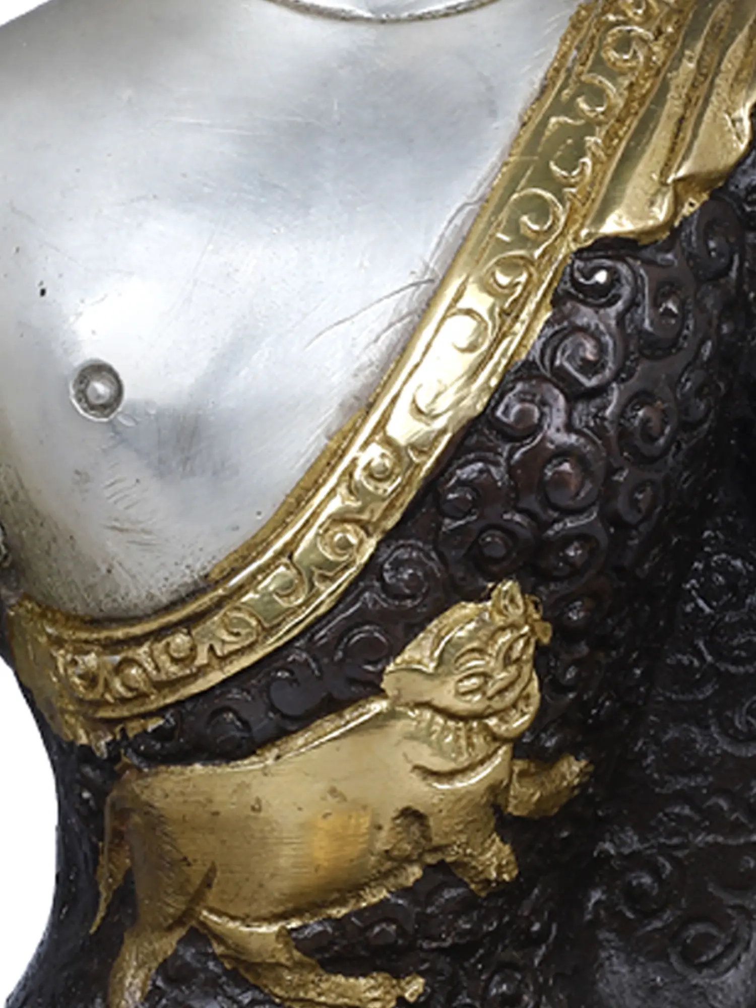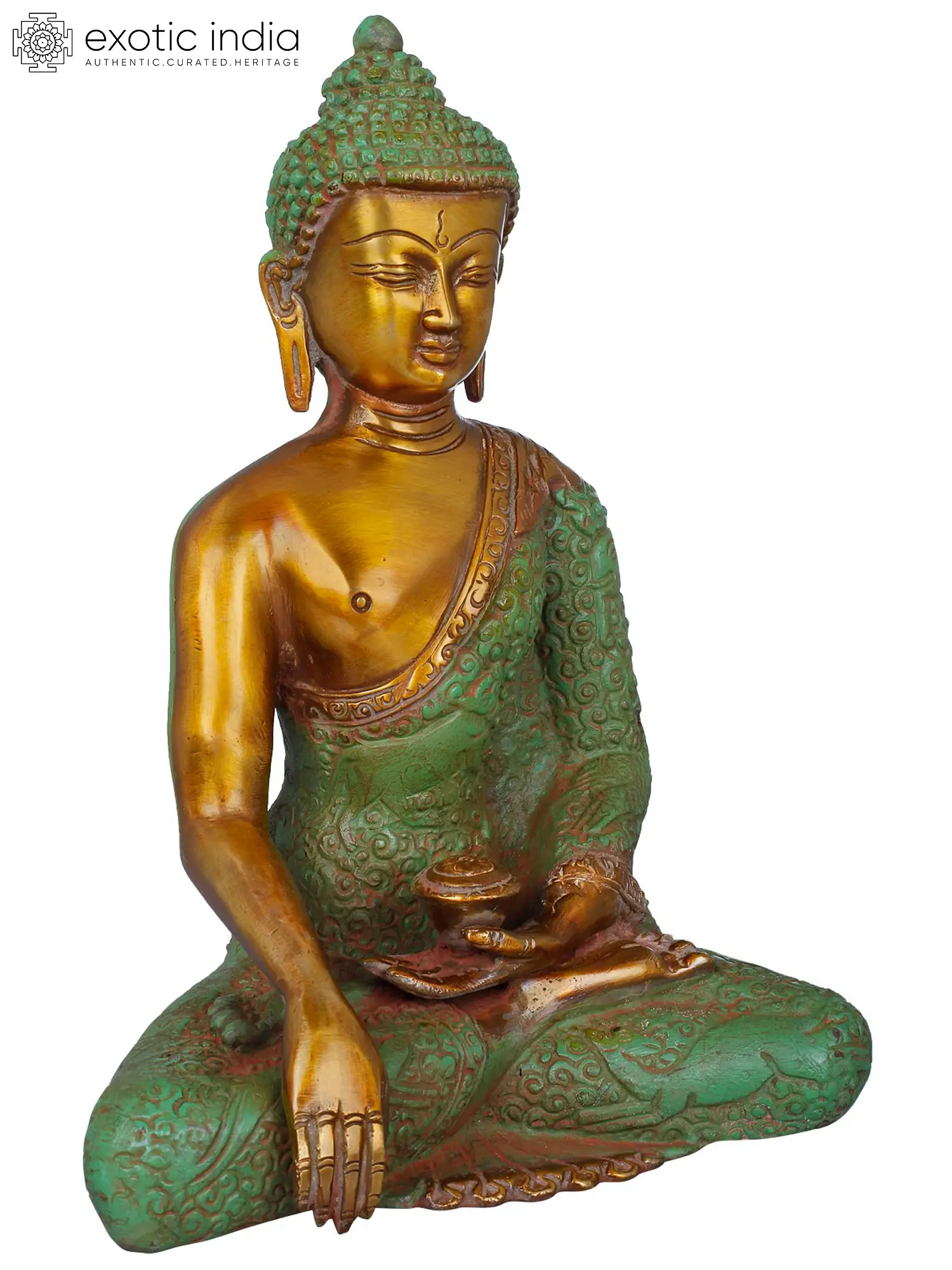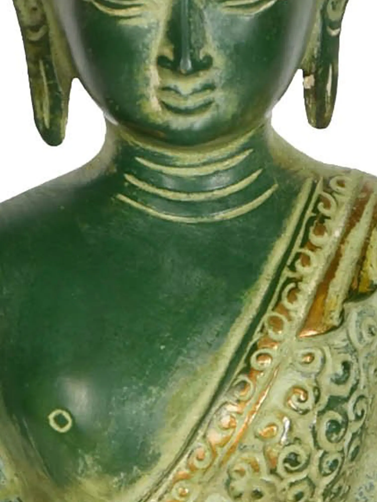 Hand-crafted in India, this statue is a testament to the rich heritage of metal artistry. The choice of brass lends a timeless quality to the piece, its warm glow and potential for patina adding to its spiritual resonance over time. The intricate detailing on the robe, adorned with subtle yet captivating patterns, speaks of the meticulous skill of the artisans. The tranquil expression on the Buddha's face, with downcast eyes and a gentle smile, invites contemplation and inner peace. The seated posture, in a meditative pose, further enhances the aura of stillness and profound concentration. The small bowl held in the left hand often symbolizes the alms bowl, a reminder of the Buddha's renunciation and his practice of humble existence. ––––––––––