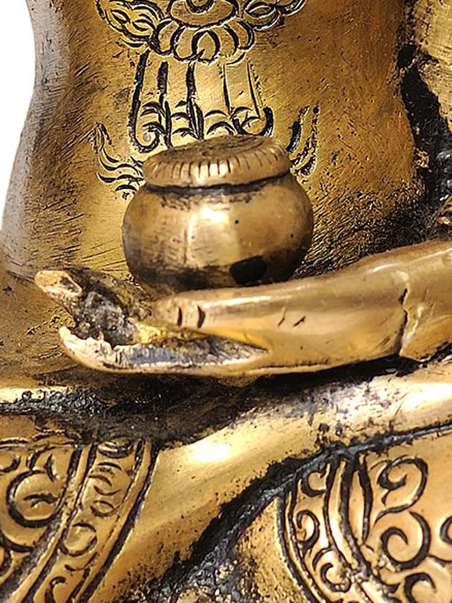 This exquisite brass statue captures the serene presence of the Buddha in the Vitarka Mudra, a gesture of debate, discussion, and transmission of teachings. The name "Vitarka" itself signifies reasoning or argument. In this sacred posture, the Buddha's right hand is raised, palm facing outwards, with the thumb and forefinger touching to form a circle. This gesture is believed to symbolize the turning of the Wheel of Dharma, the very essence of the Buddha's teachings, disseminated for the enlightenment of all sentient beings. ––––––––––––––––––––