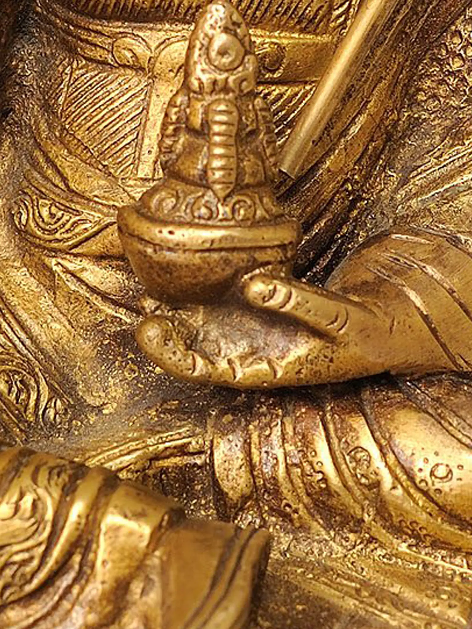 Crafted with exquisite artistry and profound spiritual significance, a Padmasambhava brass statue is a magnificent representation of the revered Tibetan Buddhist guru, Guru Rinpoche, also known as Padmasambhava. This sacred work of art not only embodies the essence of Tibetan Buddhism but also stands as a testament to the fusion of devotion and intricate craftsmanship. Depicting Padmasambhava in a contemplative posture, the statue radiates an aura of divine grace and wisdom. Every meticulously carved detail, from the serene facial expressions to the intricate symbolism of the vajra and skull cup, reflects the rich spiritual tapestry of Tibetan Buddhism. These brass statues transcend mere objects, becoming revered artifacts central to Tibetan Buddhist rituals, and serve as a tangible link to the spiritual realm, symbolizing unwavering faith and reverence.