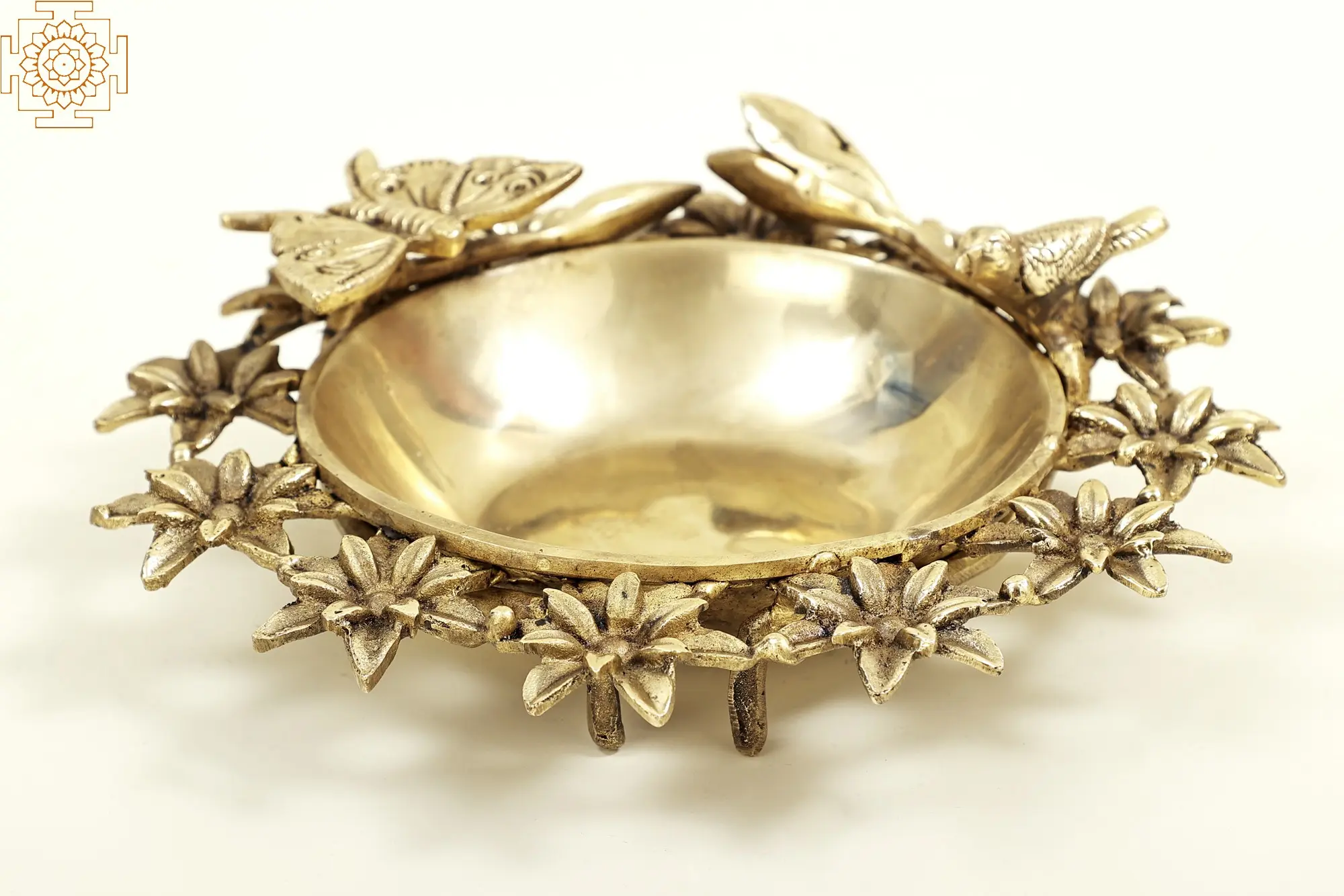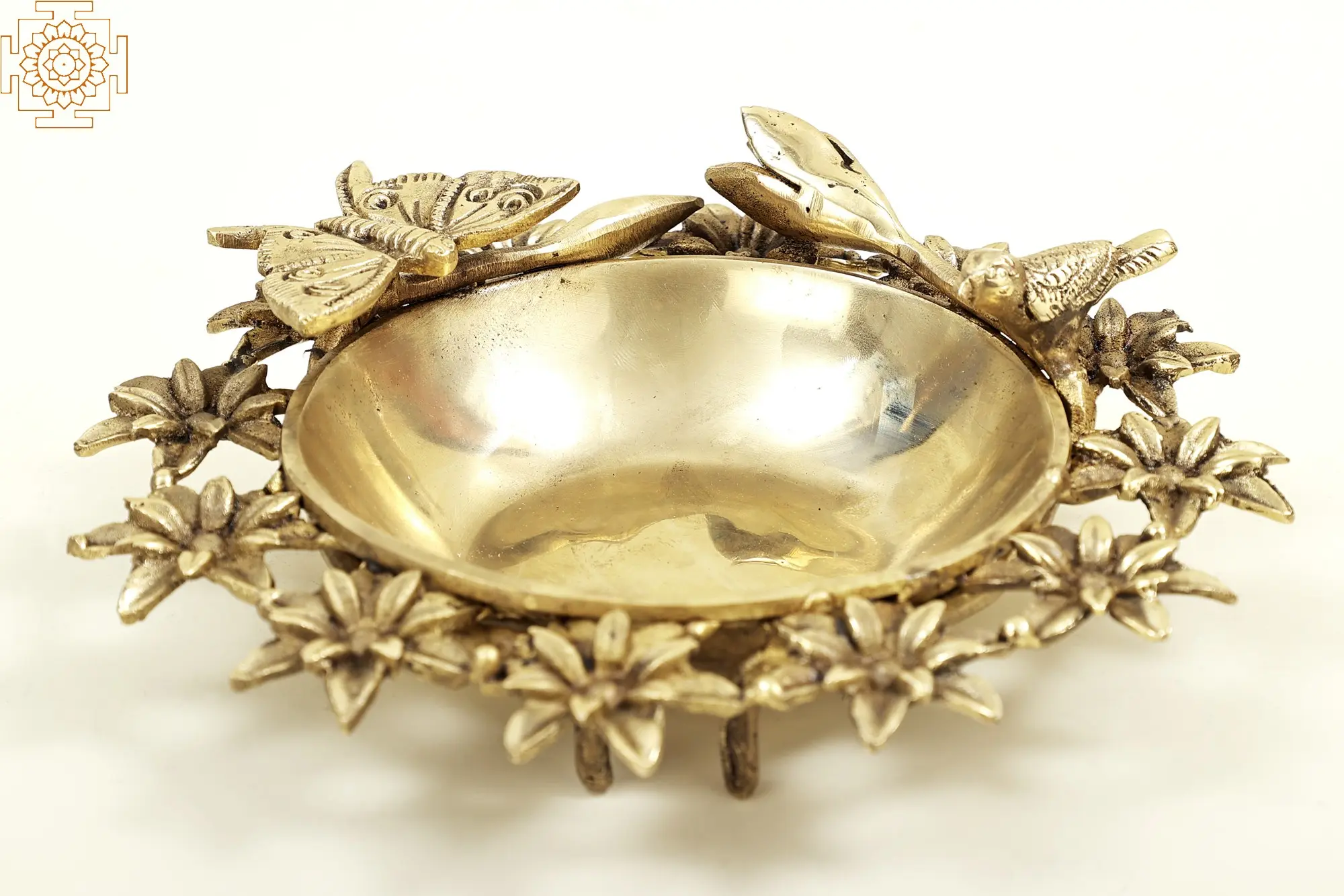 Butterflies perched on a chain of flowers evoke a variety of pleasant sensations in the observer. They are known as spiritual and creative messengers. This amazing work of art is a brass Urli with a unique design of a chain or crown of flowers fixed on the mouth and a butterfly sitting on it. The Urli's interior wall features a glossy surface. Urli has an ancient appearance and a bowl-like form, which makes it attractive. Its design incorporates both classic and modern aspects. It is a magnificent piece that may stand alone as a unique home décor item and can also be embellished with flowers and floating candles during festivals.