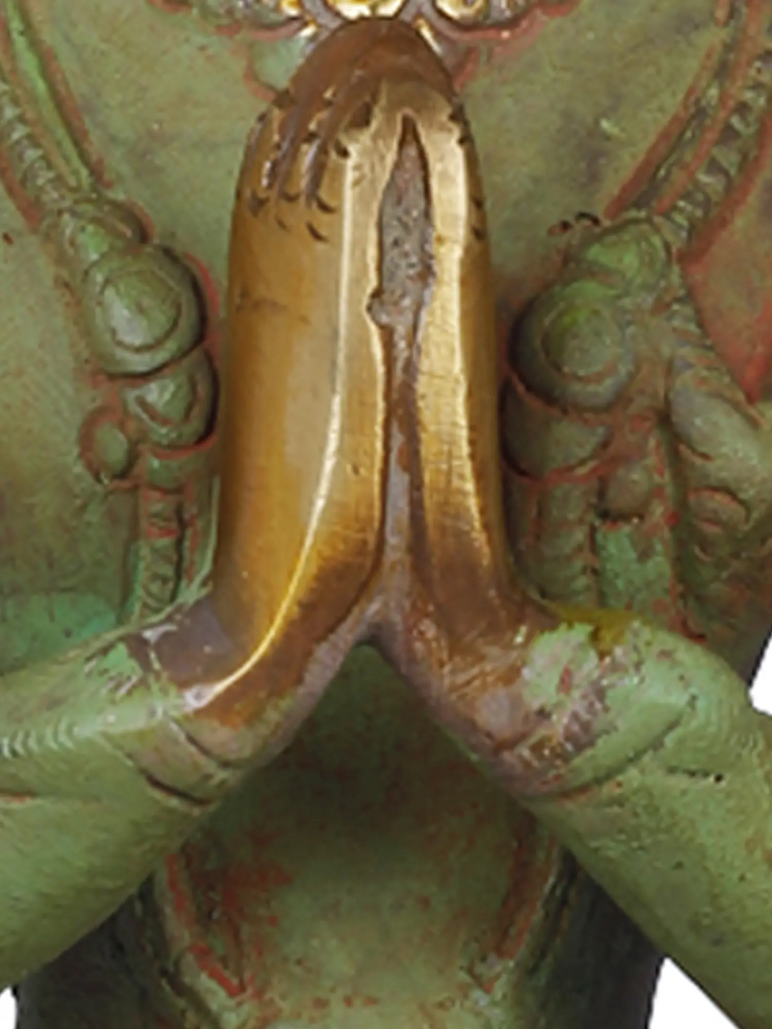 According to legend, Chenrezig wept tears of compassion upon witnessing the suffering of sentient beings. From these tears, a beautiful lotus bloomed, from which he arose. He vowed to remain in existence until all beings are free from suffering, making him an eternal source of comfort and guidance. The four arms of this representation symbolize his omnipresence and his ability to offer aid in all directions. His primary hands are clasped in the anjali mudra, a gesture of prayer and reverence, signifying his dedication to the welfare of all. In his upper right hand, he often holds a crystal rosary, symbolizing the continuous chanting of mantras for the liberation of beings, and in his upper left, a lotus flower, representing purity and enlightenment. The intricate detailing on his crown and adornments further accentuates his divine status and noble bearing.