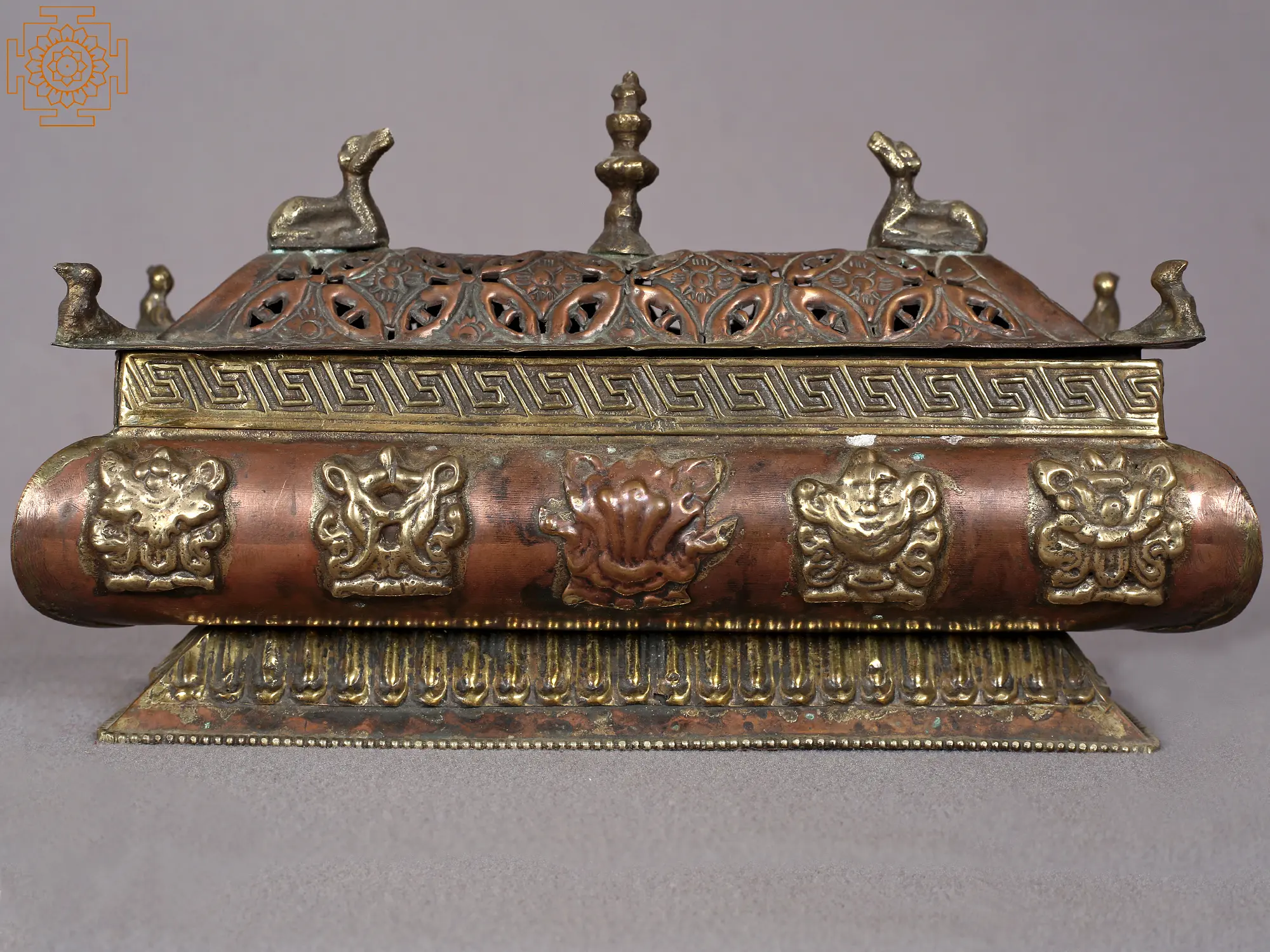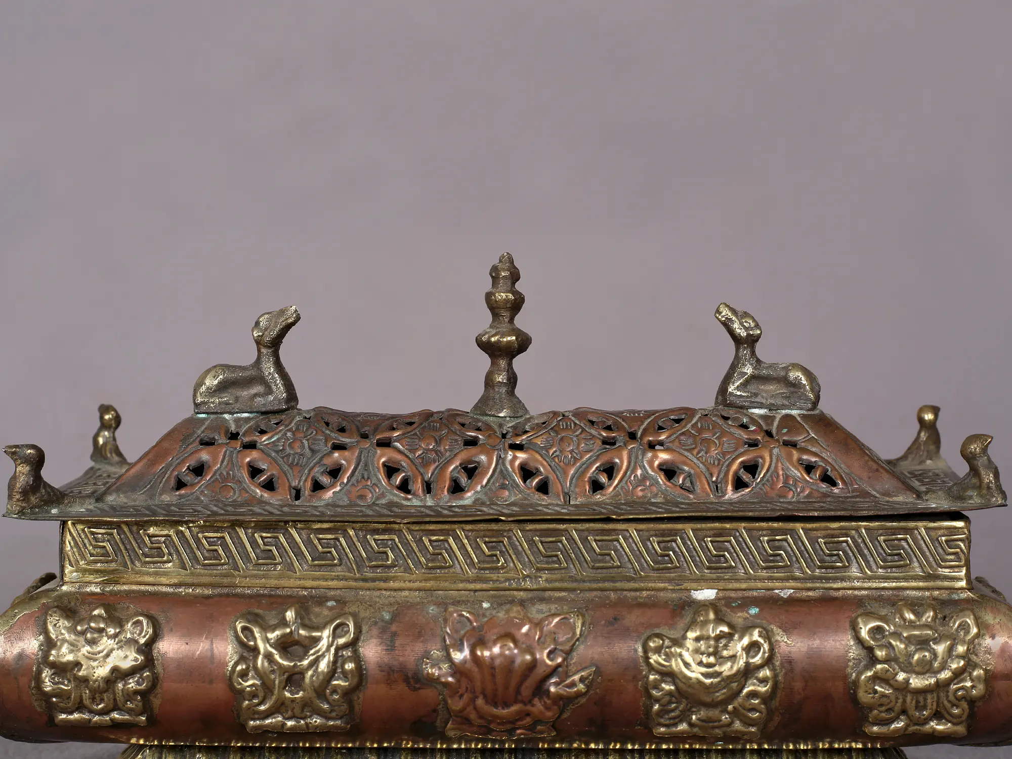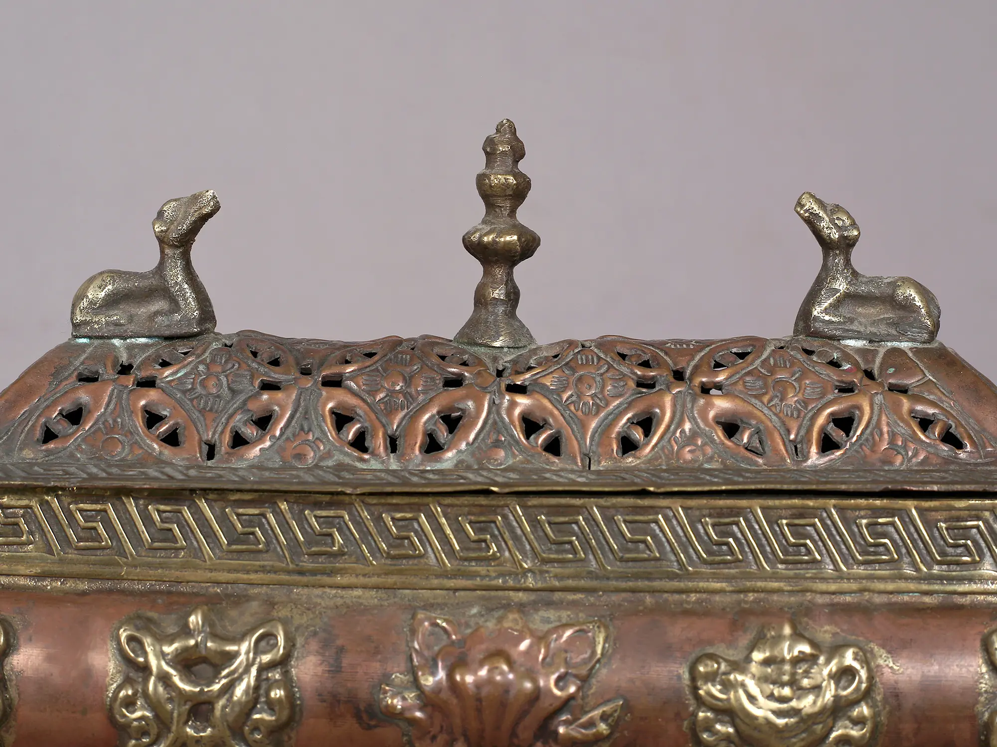 Beyond its role as a mere copper incense box, this piece embodies a fusion of material elegance and artistic depth. Adorned with a representation of camels gracefully positioned beside the incense tip-opener, and embellished with avian motifs that find solace at each corner, the box transcends the confines of mere functionality. This sanctified space becomes a juncture where devotion harmonizes intimately with scent, fostering a profound connection between the earthly and the celestial. Imprinted within the architecture of the copper vessel are the echoes of each herb's placement and every hushed plea, forming a resonant narrative. The luminous surface of the box does more than capture the essence of past rituals; it extends an invitation to partake in the timeless ritual of communion with the divine.