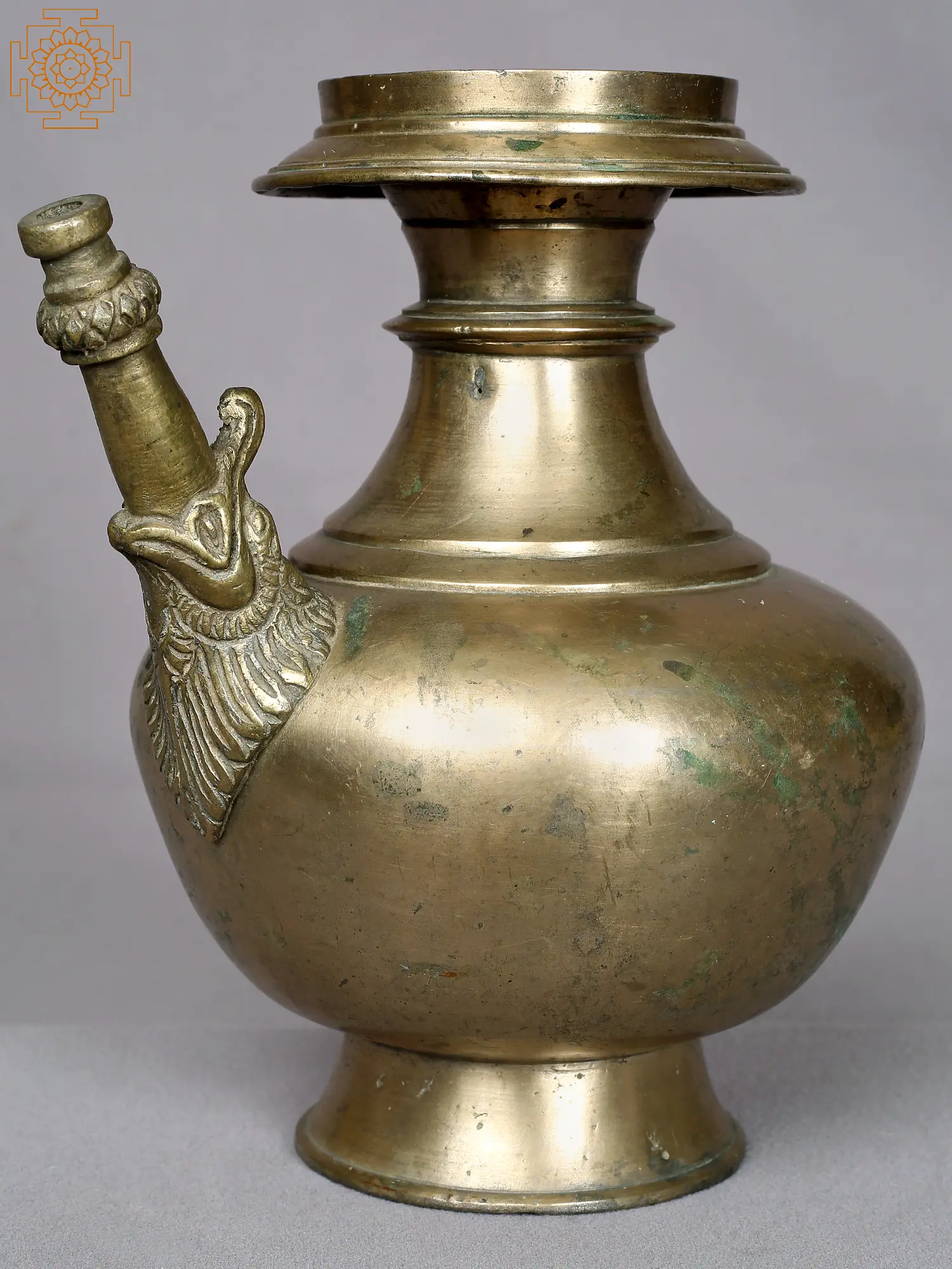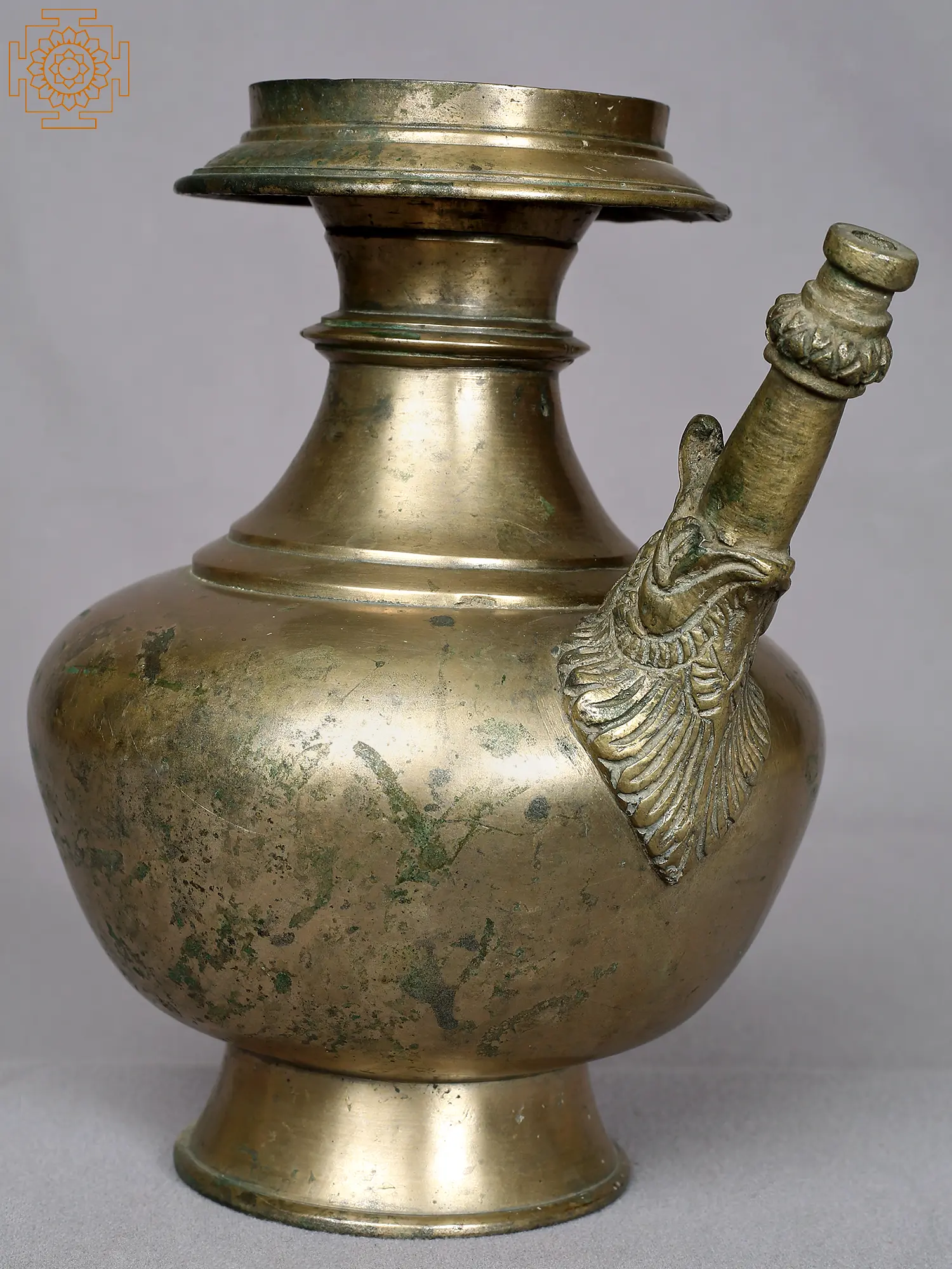 This copper pitcher with a nozzle is known as a Karuwa and is a vessel historically used by the Newar people. The sprout is used for streaming water. Water can be sipped unusually without making contact with the mouth. It has a lovely antique finish with a green patina deposited on some parts of the vessel. At the intersection of the vessel and the sprout is an ornate brass vessel with a bird's head. It is also linked with Avalokitesvara; the vase is thought to hold the nectar of his compassion, which calms people who pray to him.
