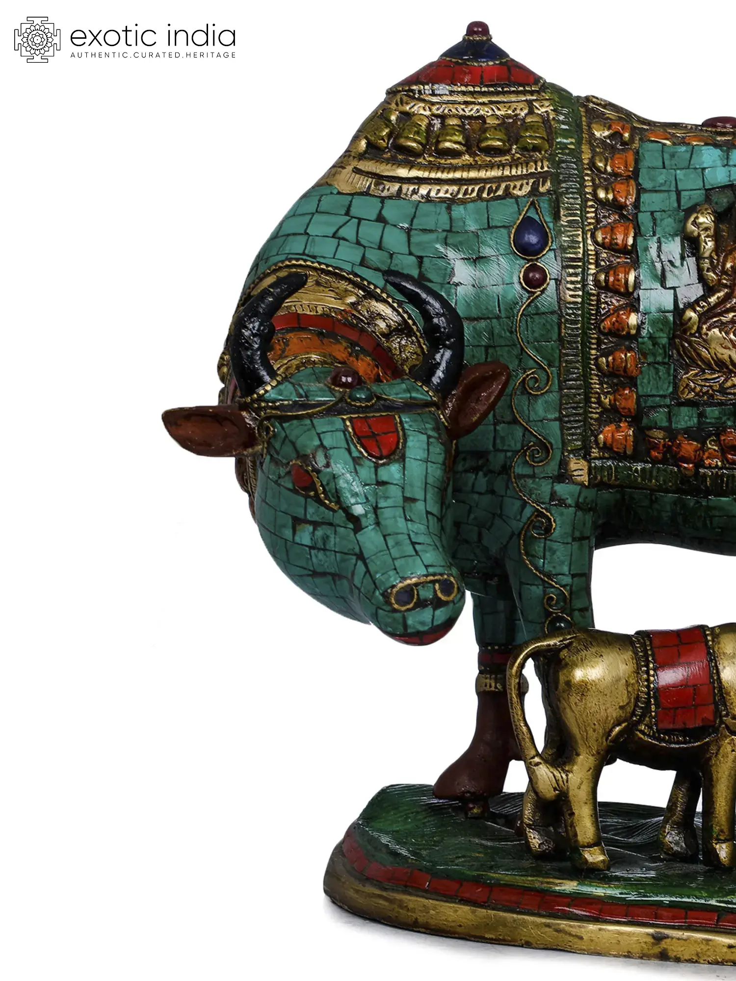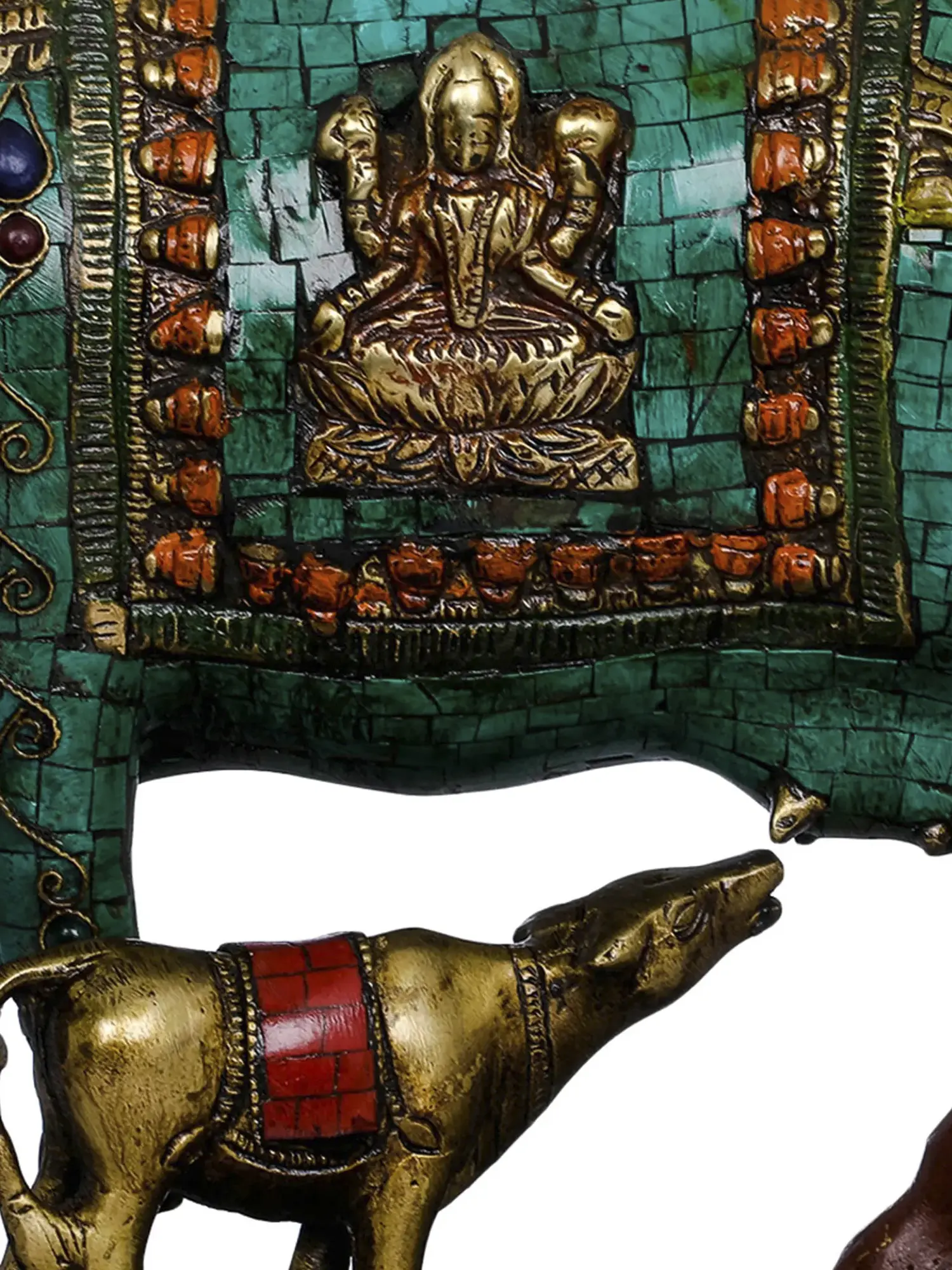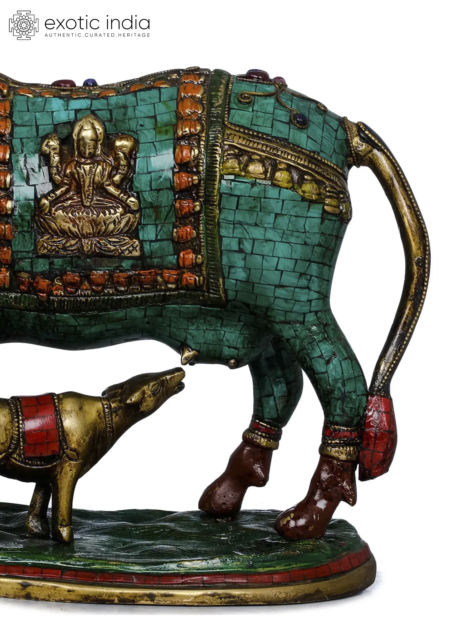 Further enhancing the spiritual significance of this piece, the saddle of the mother cow is adorned with intricately carved depictions of Goddess Lakshmi and Lord Ganesha. Lakshmi, the goddess of wealth, fortune, and prosperity, is often invoked for material and spiritual well-being. Ganesha, the remover of obstacles and the deity of beginnings, ensures success and auspicious undertakings. Their presence on the sacred cow signifies a harmonious confluence of blessings, prosperity, and divine protection. The vibrant inlay work, featuring stones in shades of emerald green, ochre, and deep blue, adds a regal splendor, reminiscent of ancient royal adornments and the rich tapestry of Indian artistry. The meticulous detailing, from the gentle curve of the horns to the delicate stance of the calf, speaks volumes of the artisan's skill and dedication.