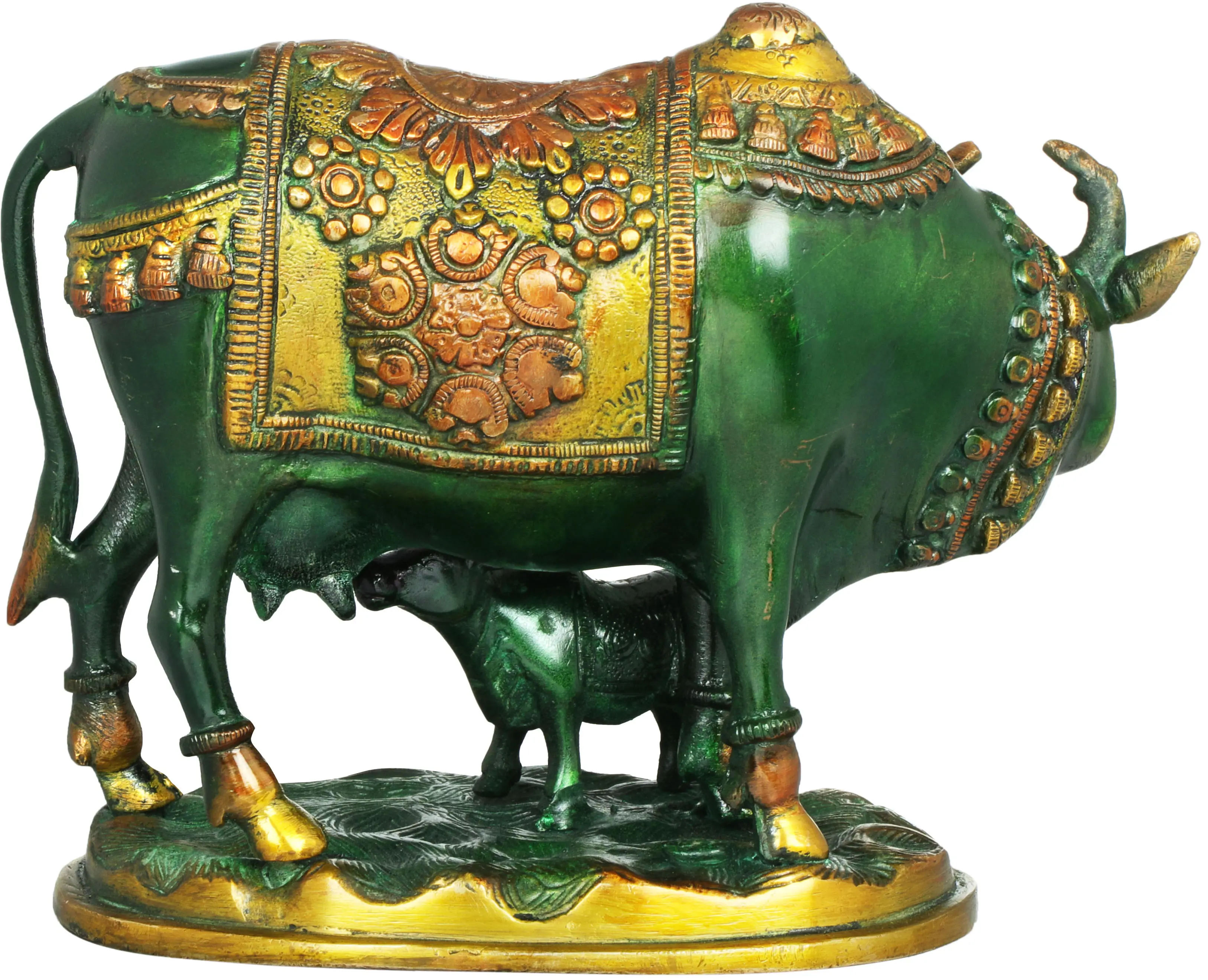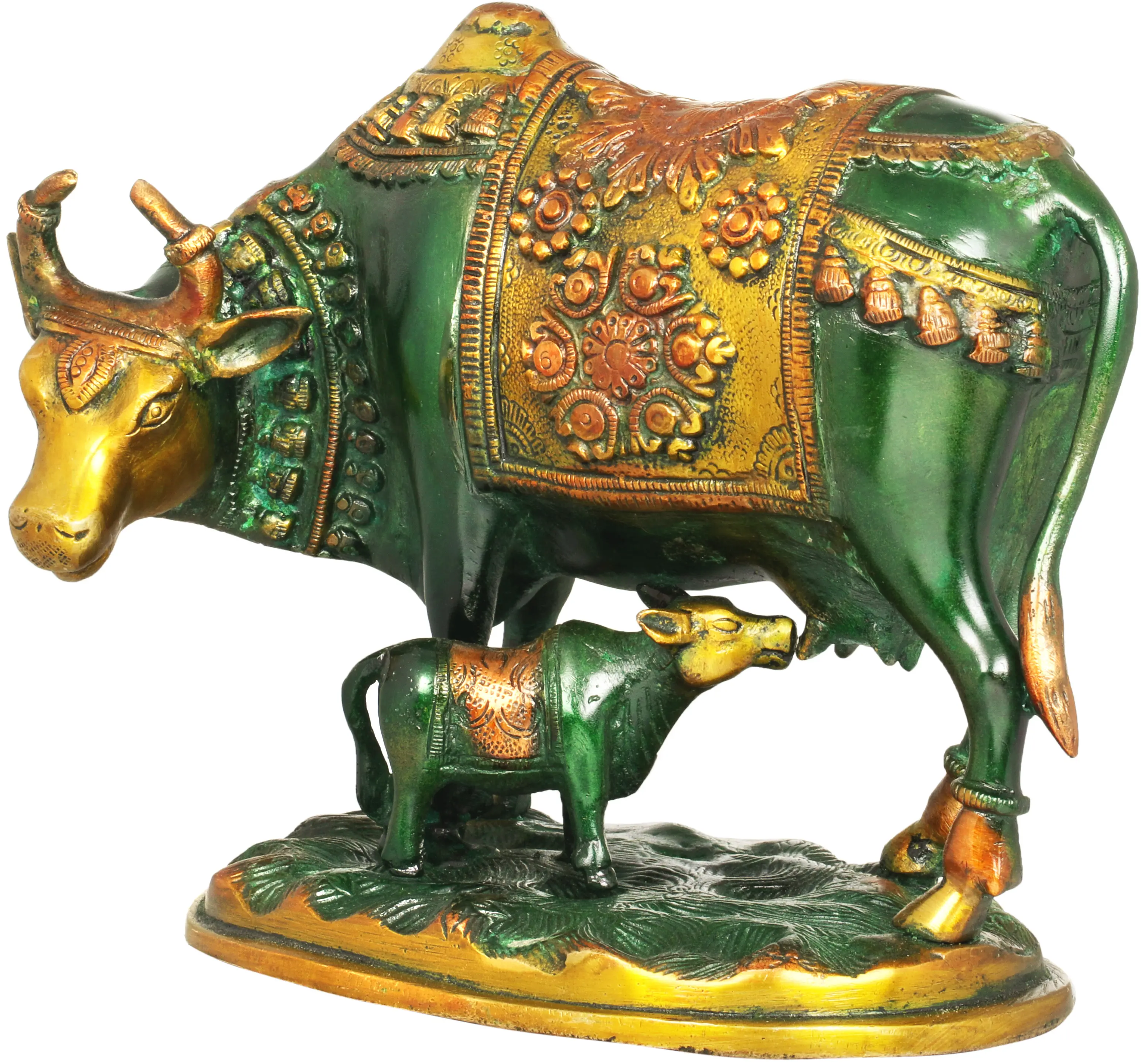 This exquisite brass statue captures a scene of profound tenderness and sacredness, depicting a cow lovingly tending to its calf. The intricate craftsmanship and rich detailing elevate this piece beyond mere decoration, imbuing it with spiritual significance and cultural resonance. In India, the cow is revered as Gomata, the divine mother, symbolizing sustenance, generosity, and the life-giving force of nature. This artistic rendition beautifully embodies these virtues. The cow, adorned with an elaborately decorated blanket in vibrant green and gold, stands protectively over her young. The golden accents highlight the regal bearing of the mother cow, while the subtle green hues represent fertility and prosperity. The calf, positioned at its mother's side, gently nurses, a testament to the primal bond between mother and child. The entire composition is set upon a textured base, evoking a pastoral landscape that further grounds the sculpture in its natural essence.