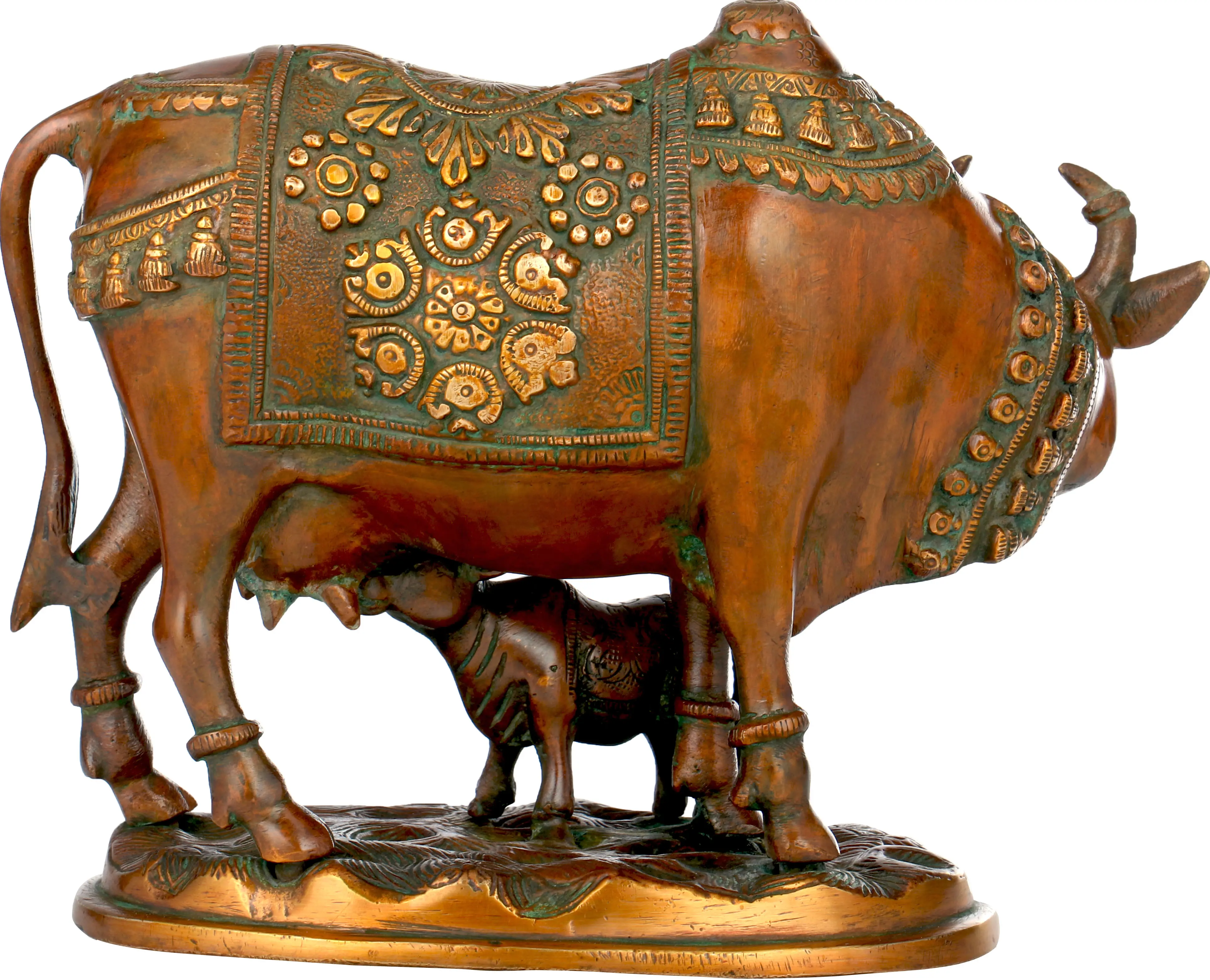 Each element of this statue speaks to the dedication of skilled artisans. Fashioned from brass, a metal traditionally valued for its durability and luster, the piece possesses a timeless quality. The green and gold patina applied to the brass creates a visually striking contrast, enhancing the depth and texture of the sculpted forms. The intricate patterns on the cow's adornments, the delicate features of the animals' faces, and the lifelike rendering of their bodies showcase a mastery of traditional metalworking techniques. This handmade creation, originating from India, is not just an artifact but a piece of art that carries with it the heritage and artistic soul of its makers. It is a perfect addition to any space seeking to evoke a sense of peace, abundance, and spiritual connection.