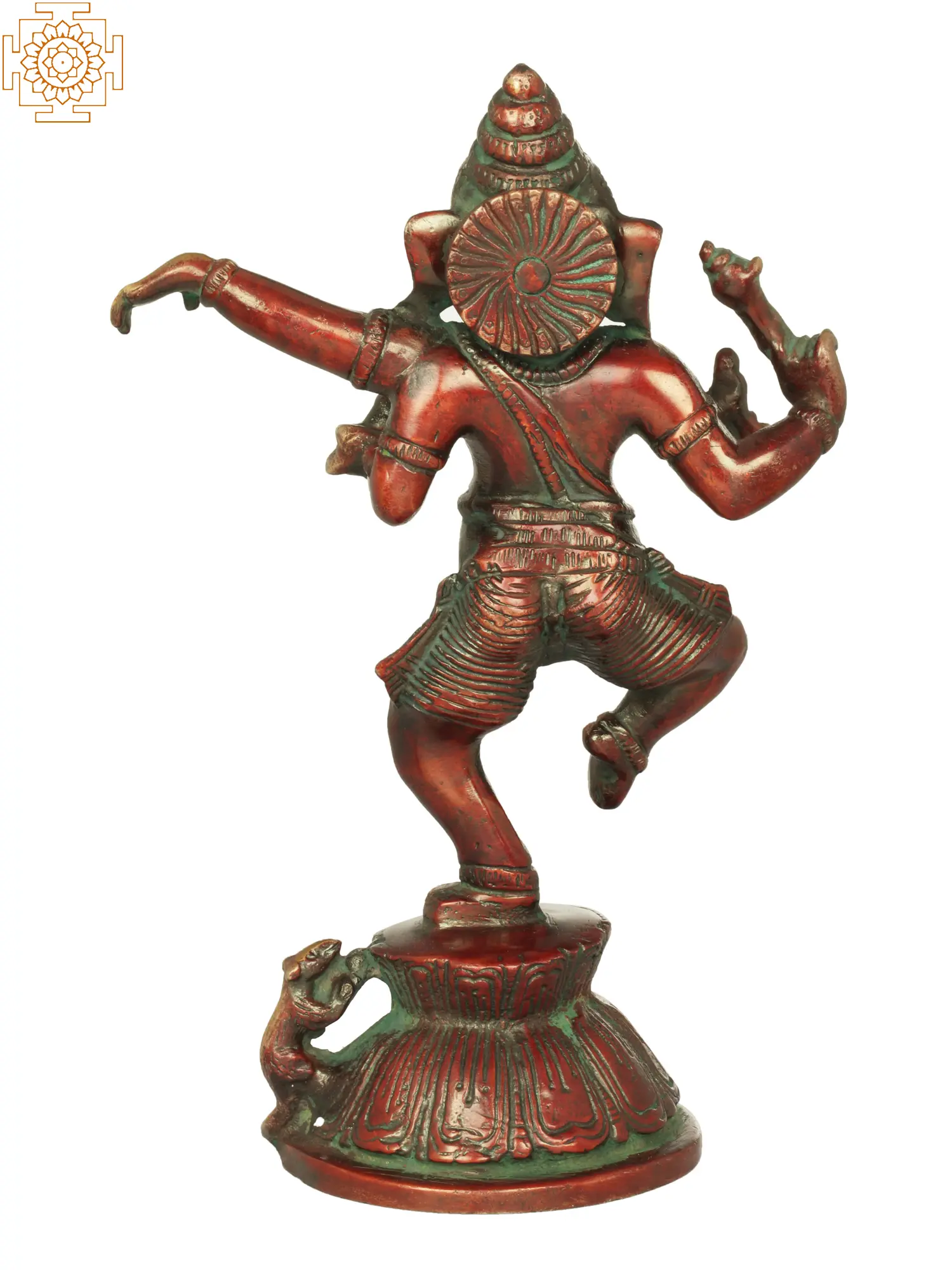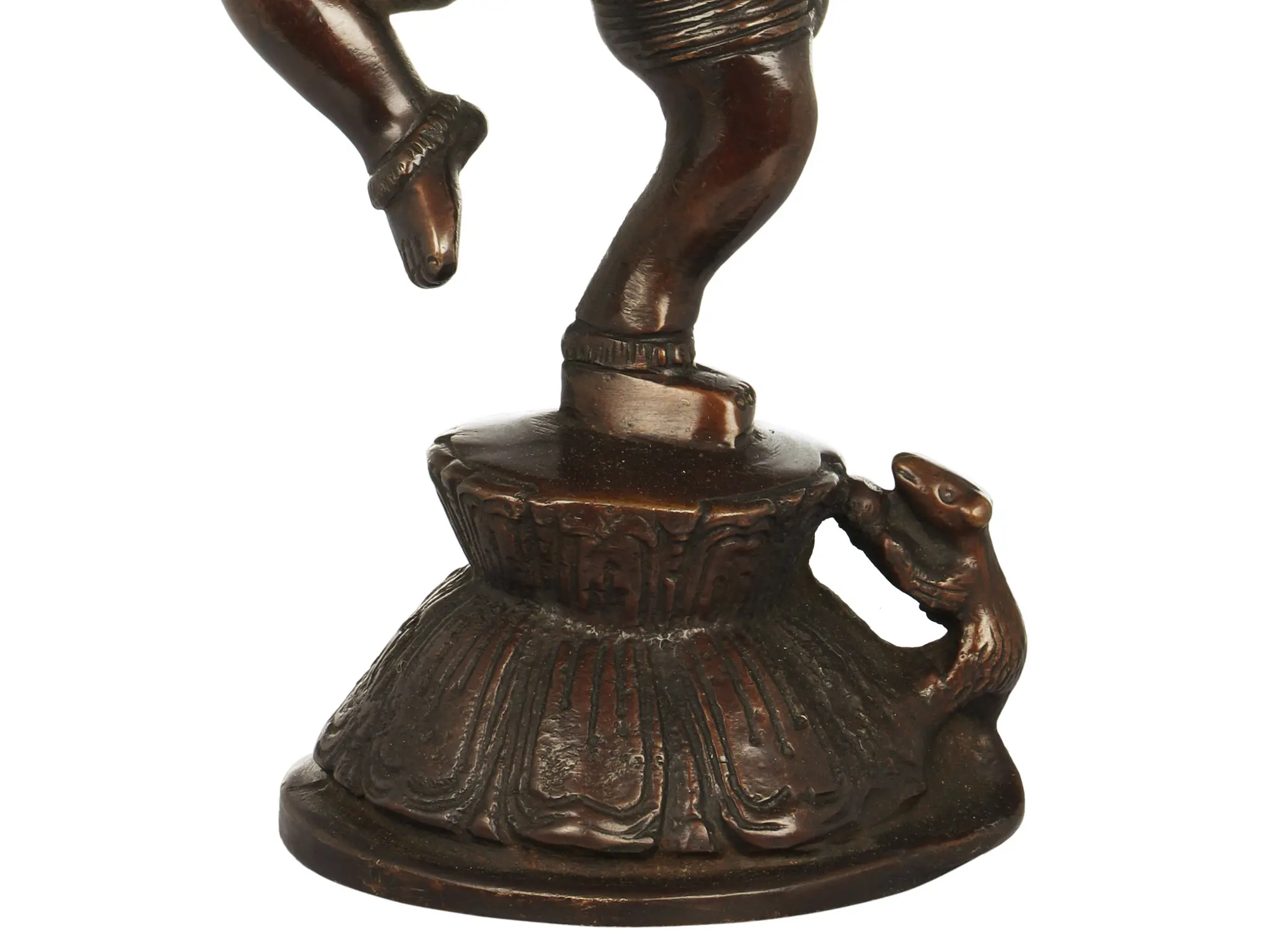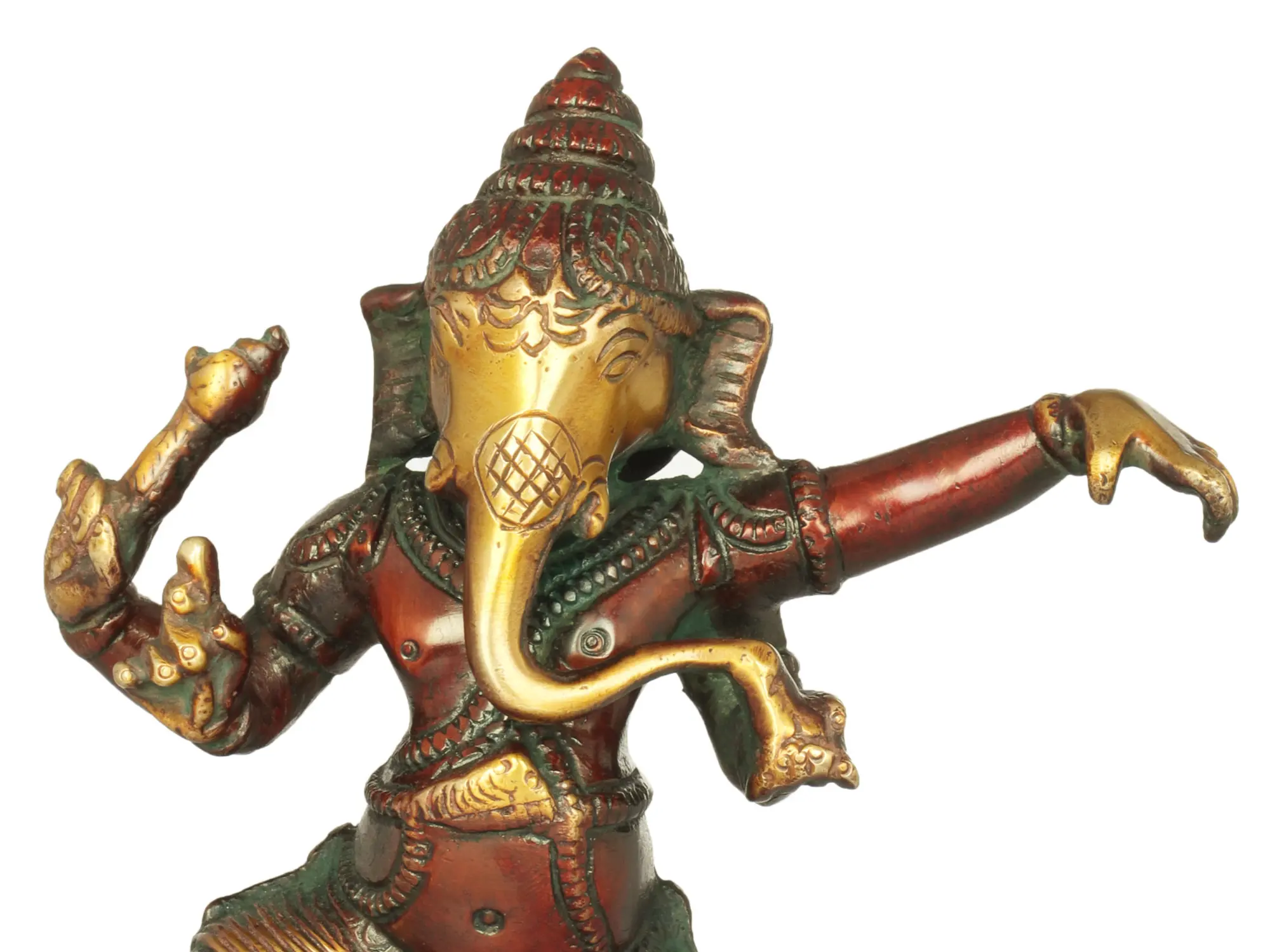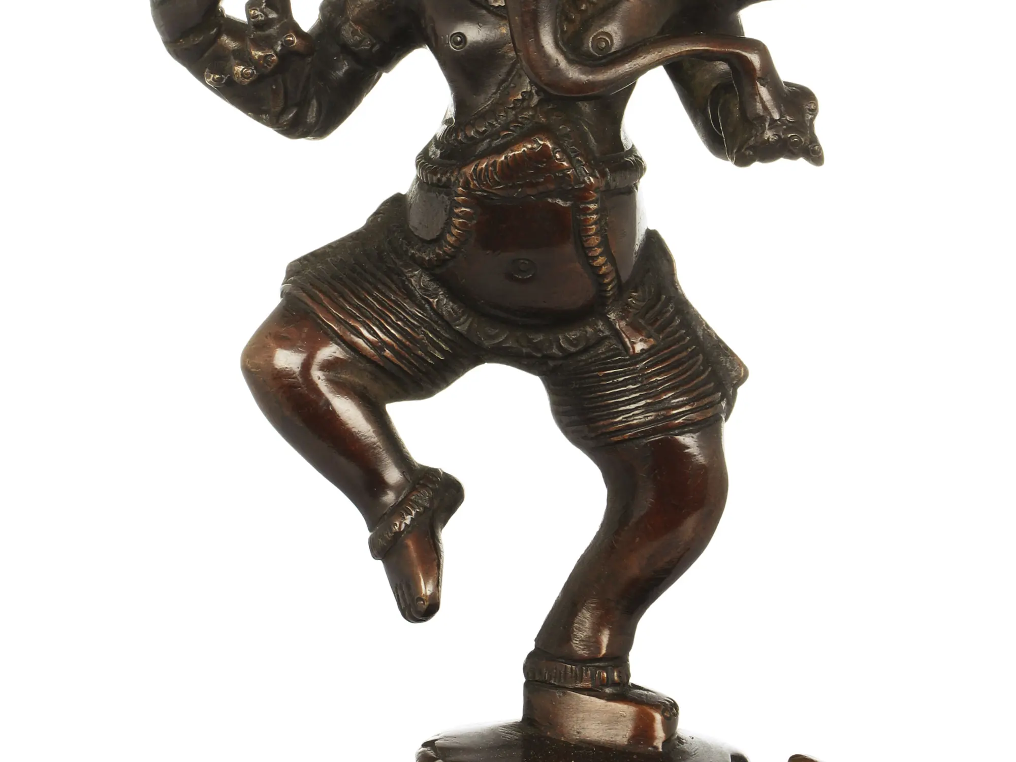 This brass sculpture captures the dynamic essence of Ganesha, the god of new beginnings, in an exuberant dance. Handcrafted with meticulous detail, the deity's joyous movement is immortalized mid-dance, each limb expressing the beat of eternal rhythms. Ganesha's rounded form, traditionally symbolizing prosperity, is adorned with finely etched garments, and his expression is one of divine bliss. Perched on a pedestal, every aspect of this piece, from the ornate crown to the playful twist of the trunk, reflects skilled Indian craftsmanship. This Dancing Ganesha infuses any space with the spirit of celebration and the promise of auspiciousness.