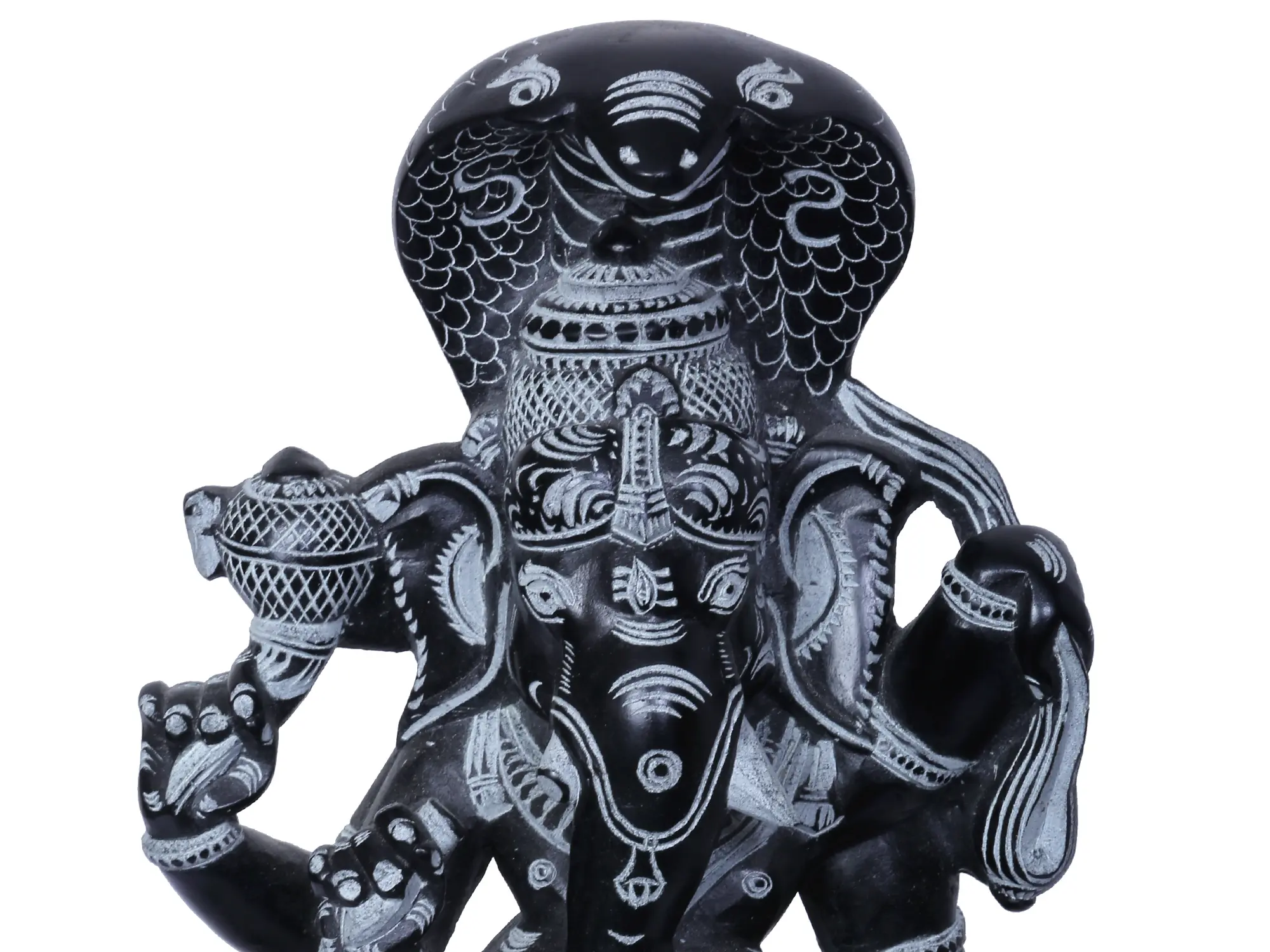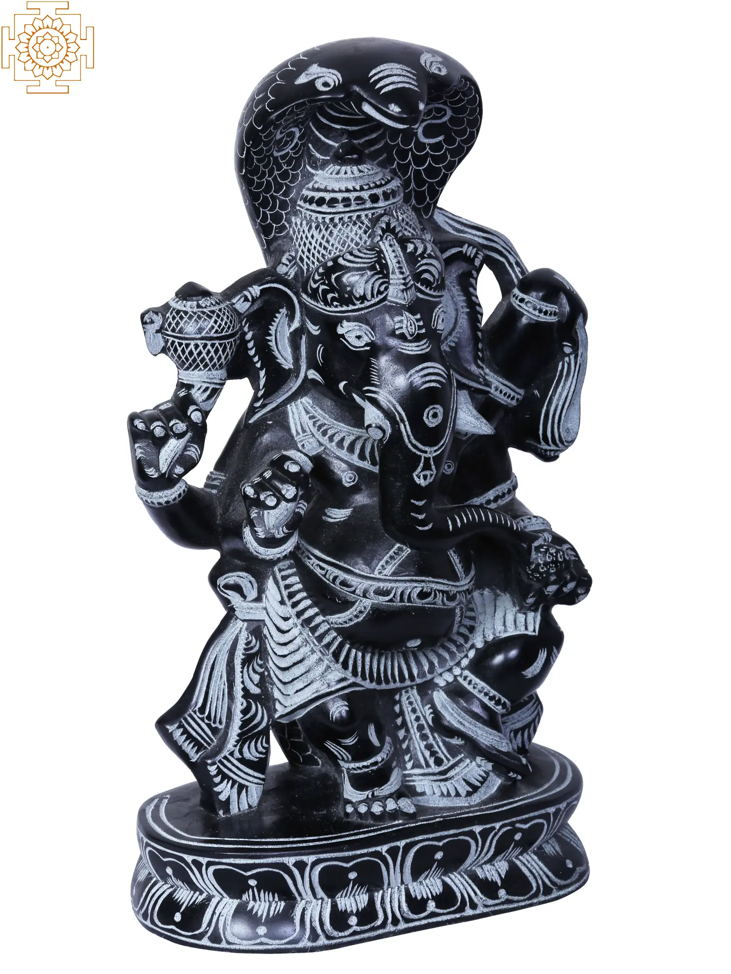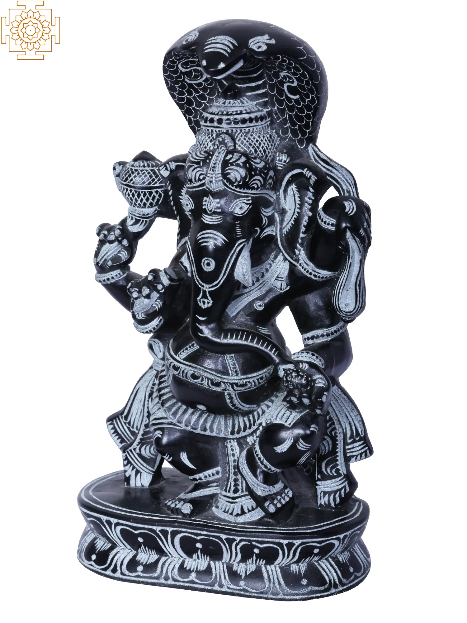 Adding to the majestic aura of this sculpture is the prominent depiction of a serpent coiled around Ganesha's neck. In Hindu lore, the serpent, or Naga, is a symbol of immense cosmic energy, eternity, and protection. It represents the Kundalini energy, the primal divine creative force dormant within the human body, which Ganesha, as the master of spiritual powers, is said to control. The hooded serpent above his head acts as a canopy, shielding him and symbolizing his sovereignty and immense power. This imagery connects Ganesha to the primal forces of the universe, reinforcing his role as a supreme deity capable of overcoming any adversity. The detailed rendering of the scales and the expressive hood of the serpent showcases the sculptor's mastery and the deep understanding of the sacred symbolism.