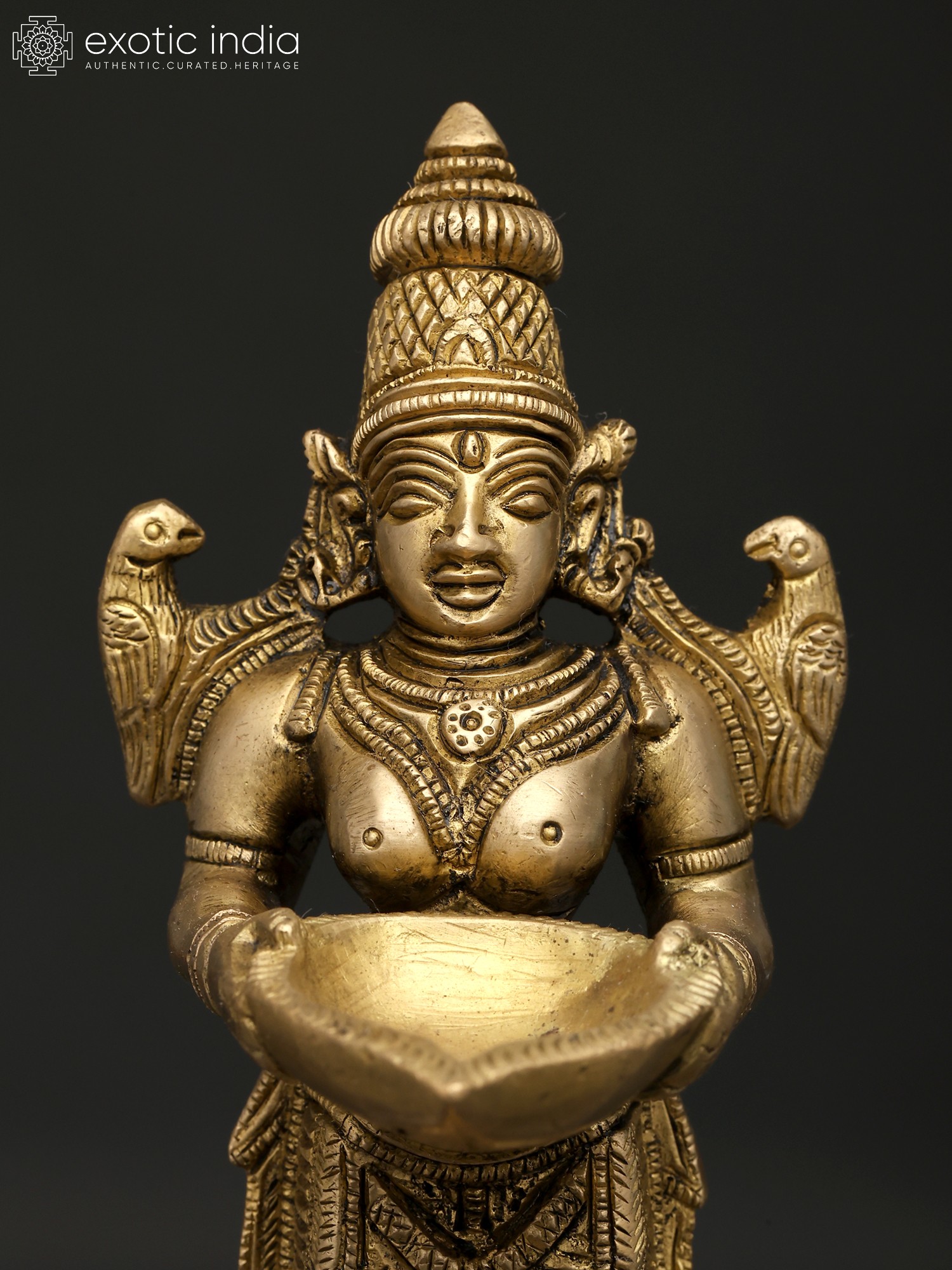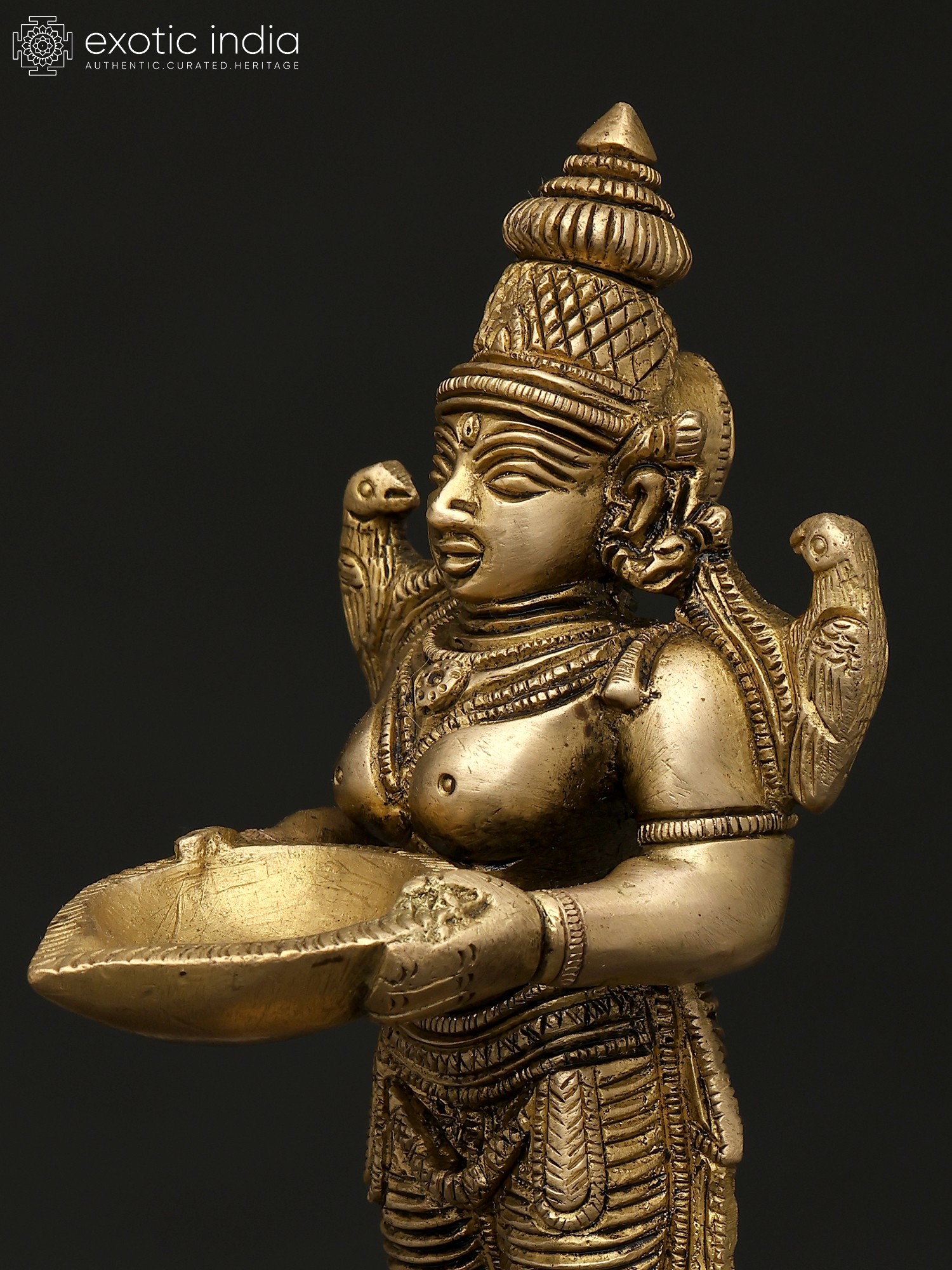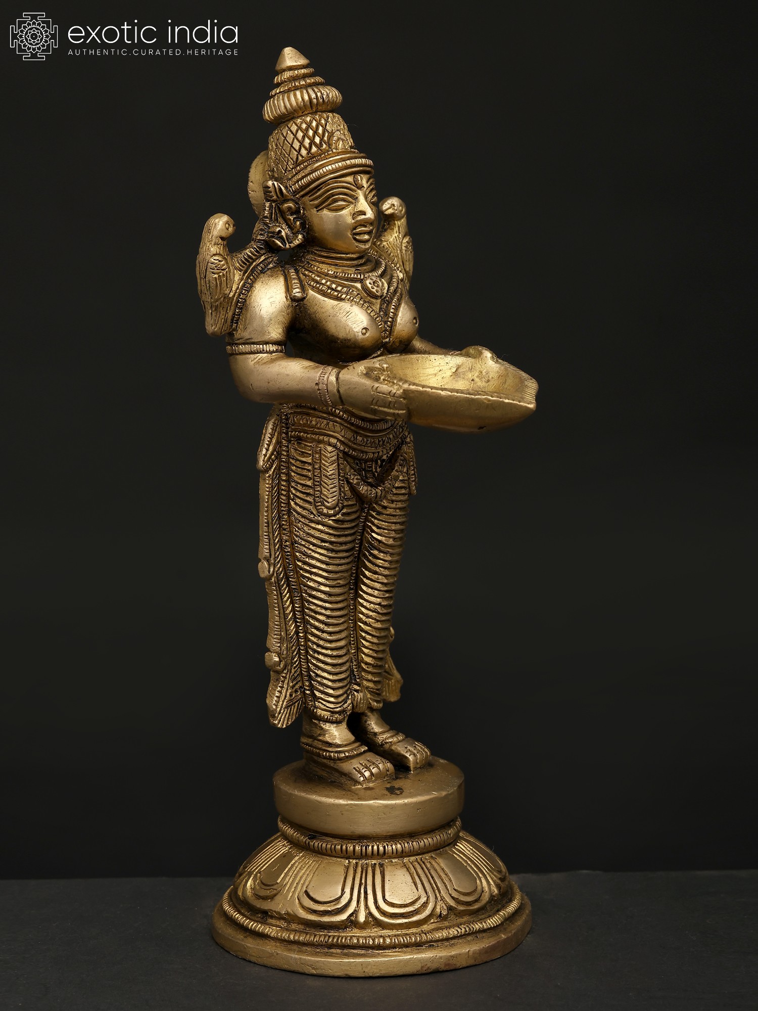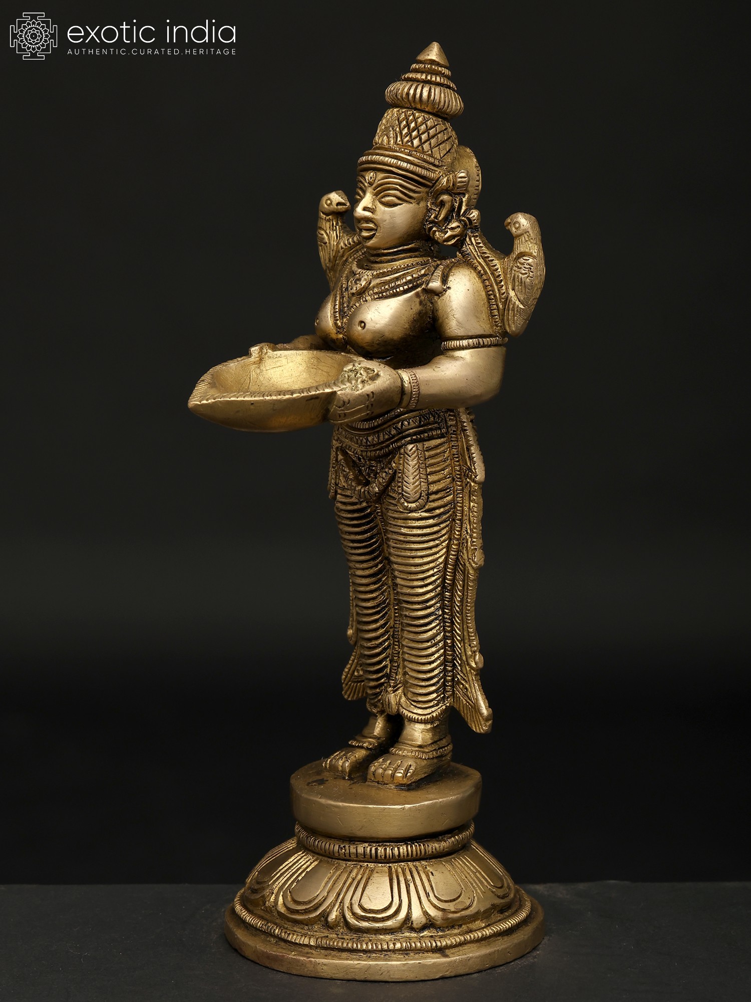 9" Superfine Four Armed Goddess Lakshmi with Peacock Lamp and Wood Base | Brass Idol