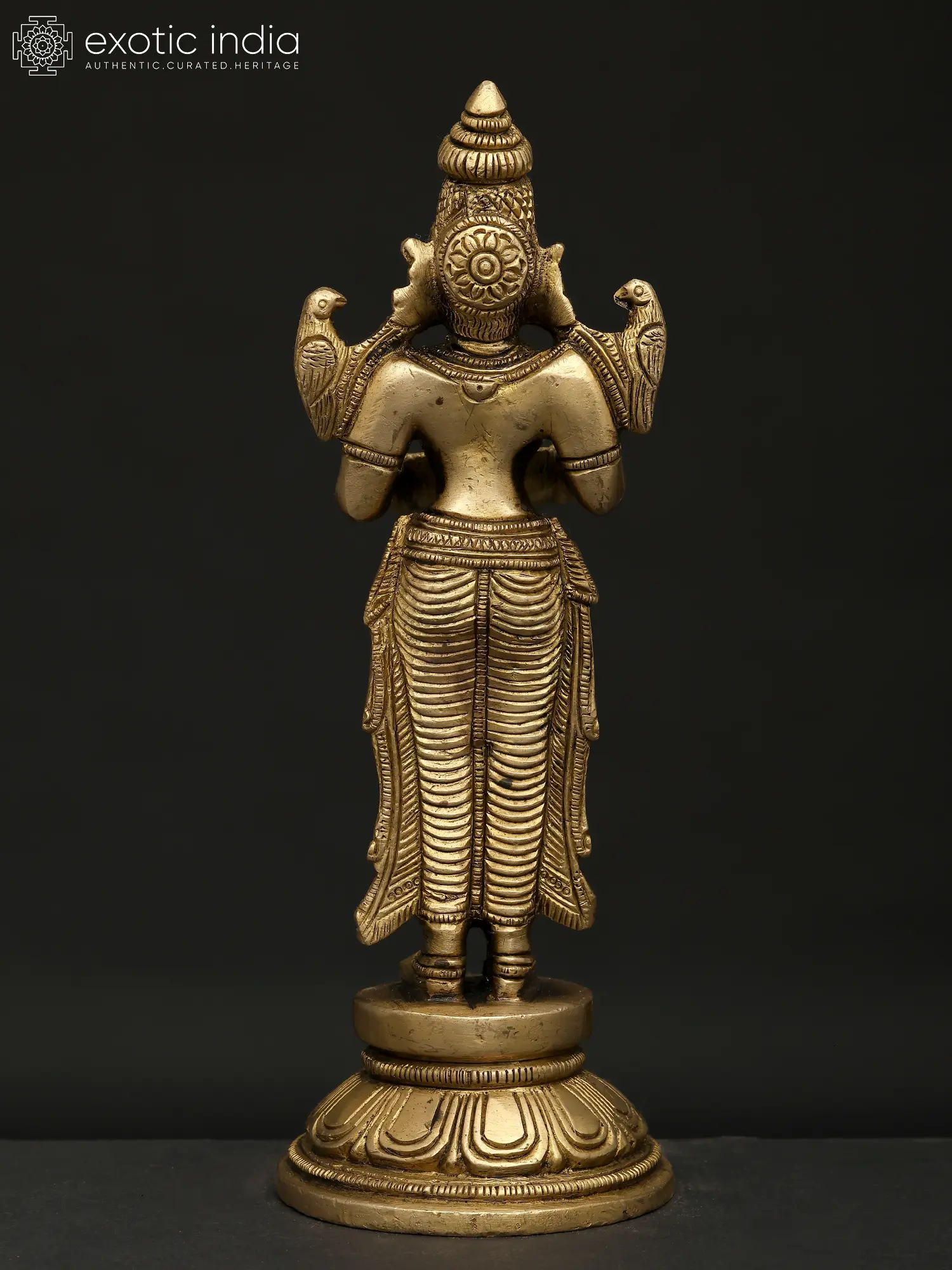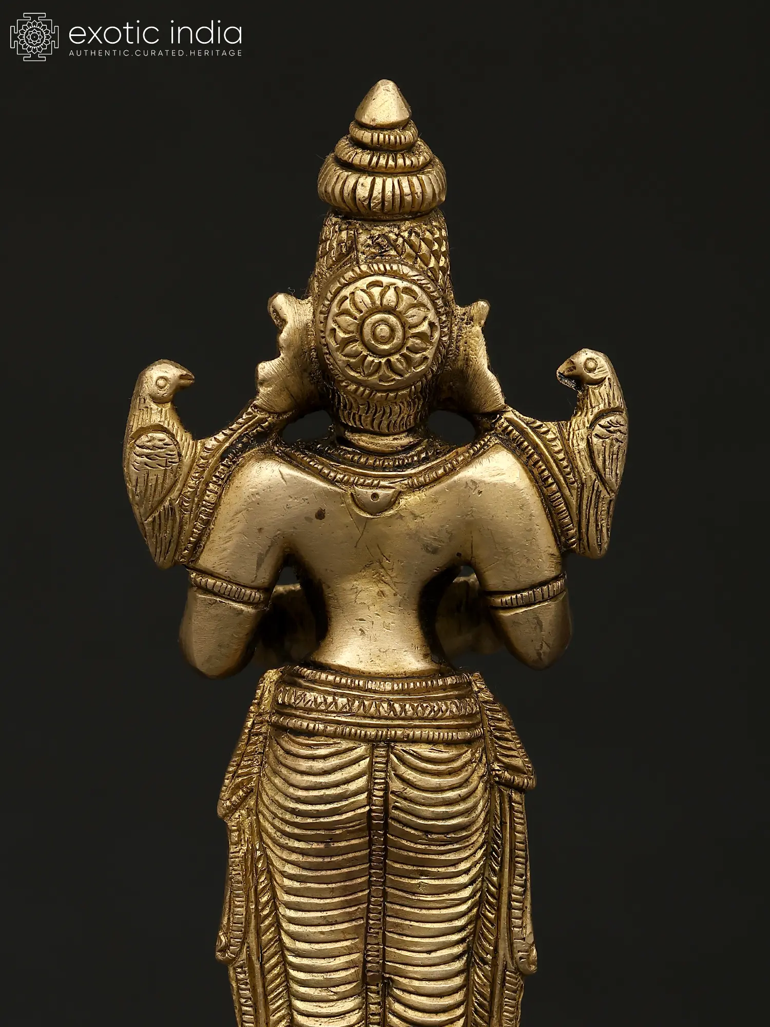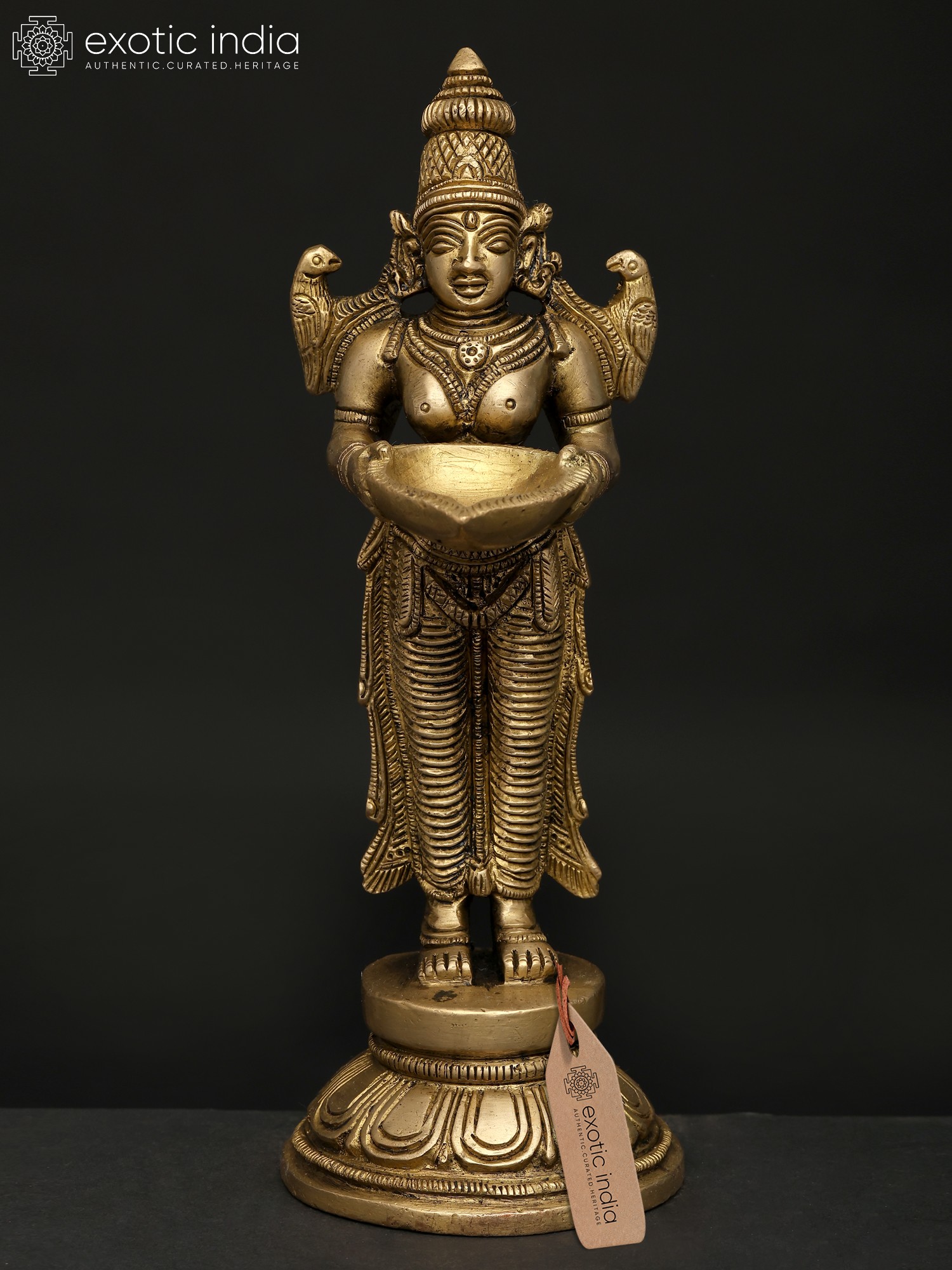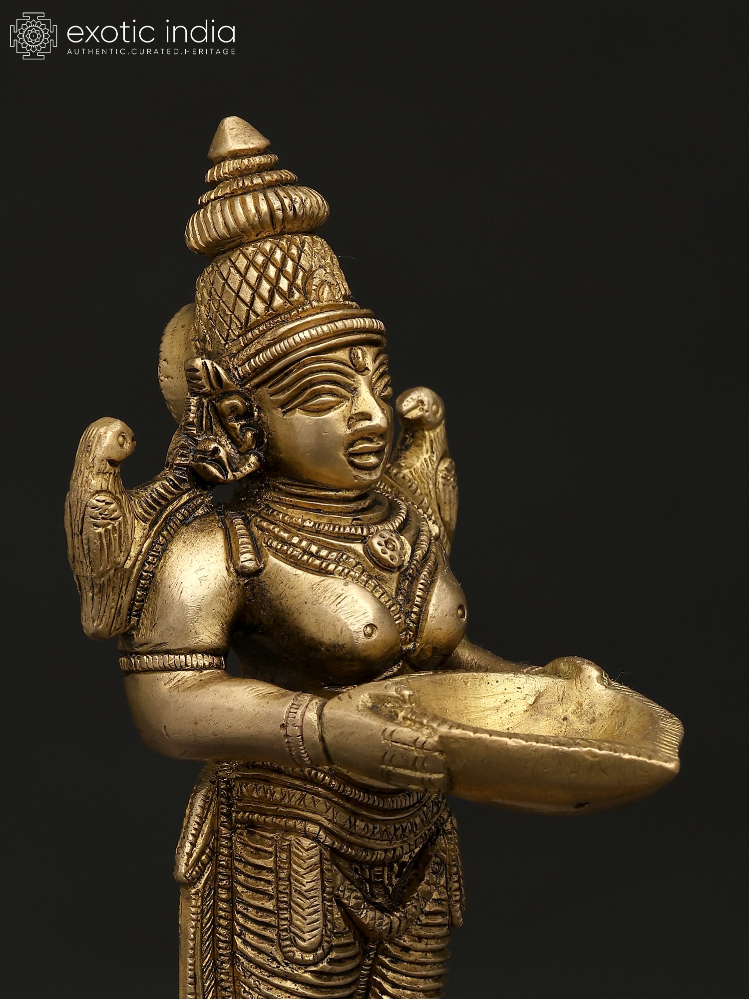 9" Superfine Four Armed Goddess Lakshmi with Peacock Lamp and Wood Base | Brass Idol